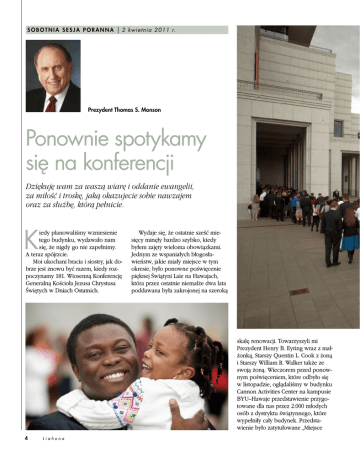 S O B O T N I A S E S J A P O R A N N A | 2 k w i e t ni a 20 1 1 r. Prezydent Thomas S. Monson Ponownie spotykamy się na konferencji Dziękuję wam za waszą wiarę i oddanie ewangelii, za miłość i troskę, jaką okazujecie sobie nawzajem oraz za służbę, którą pełnicie. K iedy planowaliśmy wzniesienie tego budynku, wydawało nam się, że nigdy go nie zapełnimy. A teraz spójrzcie. Moi ukochani bracia i siostry, jak do brze jest znowu być razem, kiedy roz poczynamy 181. Wiosenną Konferencję Generalną Kościoła Jezusa Chrystusa Świętych w Dniach Ostatnich. Wydaje się, że ostatnie sześć mie sięcy minęły bardzo szybko, kiedy byłem zajęty wieloma obowiązkami. Jednym ze wspaniałych błogosła wieństw, jakie miały miejsce w tym okresie, było ponowne poświęcenie pięknej Świątyni Laie na Hawajach, która przez ostatnie niemalże dwa lata poddawana była zakrojonej na szeroką skalę renowacji. Towarzyszyli mi Prezydent Henry B. Eyring wraz z mał żonką, Starszy Quentin L. Cook z żoną i Starszy William R. Walker także ze swoją żoną. Wieczorem przed ponow nym poświęceniem, które odbyło się w listopadzie, oglądaliśmy w budynku Cannon Activities Center na kampusie BYU–Hawaje przedstawienie przygo towane dla nas przez 2.000 młodych osób z dystryktu świątynnego, które wypełniły cały budynek. Przedsta wienie było zatytułowane „Miejsce 4 Liahona zgromadzenia” i w bardzo kreatywny i mistrzowski sposób opowiadało o wydarzeniach z miejscowej historii Kościoła oraz o historii tamtejszej świą tyni. Jakże to był cudowny wieczór! Następny dzień był duchową ucztą, kiedy to świątynia została po nownie poświęcona podczas trzech sesji. Bardzo silnie odczuwaliśmy Ducha Pana. Nadal budujemy świątynie. Tego poranka mam przywilej zapowiedzieć budowę trzech kolejnych świątyń, pod których budowę zakupujemy tereny i które, w ciągu najbliższych miesięcy i lat, będą budowane w następują cych miejscach: Fort Collins w stanie Colorado, Meridian w stanie Idaho oraz Winnipeg w prowincji Manitoba, w Kanadzie. Z pewnością będą one błogosławieństwem dla tamtejszych członków. Każdego roku w świątyniach doko nuje się milionów obrzędów. Obyśmy nadal byli wierni w wykonywaniu obrzędów, nie tylko dla siebie samych, ale także za naszych bliskich zmar łych, którzy nie mogą dokonać ich sami dla siebie. Kościół bez przerwy zapewnia pomoc humanitarną w czasach klęsk żywiołowych. Całkiem niedawno, po niszczycielskim trzęsieniu ziemi, tsu nami i w obliczu wynikających z nich problemów nuklearnych, nasze serca zwróciły się ku Japonii i tam popły nęła nasza pomoc. Rozprowadziliśmy ponad 70 ton zaopatrzenia, w tym po żywienie, wodę, koce, pościel, środki M a j 2 0 1 1 r. 5 higieny, odzież i paliwo. Nasi młodzi dorośli stanu wolnego poświęcili swój czas na poszukiwanie zaginionych członków, korzystając z Internetu, por tali społecznościowych oraz innych nowoczesnych środków komunikacji. Na terenach, do których nie można dotrzeć samochodem, członkowie niosą pomoc na dostarczonych przez Kościół skuterach. W wielu palikach i okręgach w Tokio, Nagoi i Osace organizowane są projekty służby pole gające na przygotowywaniu zestawów ze środkami higieny. Do dziś ponad 4.000 wolontariuszy przepracowało już przeszło 40.000 godzin. Nasza pomoc nadal będzie skupiać się na Japonii oraz wszystkich innych miej scach, gdzie zaistnieje taka potrzeba. Moi bracia i siostry, dziękuję wam za waszą wiarę i oddanie ewangelii, za miłość i troskę, jaką okazujecie sobie nawzajem oraz za służbę, którą pełnicie w swoich okręgach, gminach, palikach i dystryktach. Dziękuję wam także za waszą wierność w płaceniu dziesięciny i datków oraz za waszą hojność w przekazywaniu swych środ ków na inne fundusze Kościoła. Na koniec 2010 roku na całym świecie służyło 52.225 misjonarzy w 340 misjach. Praca misjonarska jest siłą napędową królestwa. Pozwólcie, iż za sugeruję, abyście rozważyli, na miarę waszych możliwości, ofiarowanie datku na Ogólny Fundusz Misjonarski Kościoła. A teraz, moi bracia i siostry, z nie cierpliwością oczekujemy na przesła nia, które będą przekazane nam w ciągu tych dwóch dni. Ci, którzy będą do nas przemawiać, prosili niebiosa o pomoc i kierownictwo, gdy je przygo towywali. Modlę się, aby napełnił nas Duch Pana, byśmy byli pokrzepieni i natchnieni, słuchając i ucząc się podczas konferencji. W imię Jezusa Chrystusa, amen. ◼ 6 Liahona Starszy L. Tom Perry Kworum Dwunastu Apostołów Sabat i sakrament Niech wasza rodzina będzie przepełniona miłością w miarę, jak przestrzegacie Sabatu przez cały dzień i doświadczacie jego duchowych błogosławieństw przez cały tydzień. M oi bracia i siostry, tego ranka na całym świecie zebraliśmy się, aby słuchać głosu pro roka. Świadczę, że głos, który właśnie słyszeliśmy, jest głosem żyjącego proroka Boga na ziemi w dzisiejszych czasach, Prezydenta Thomasa S. Mon sona. Jakże jesteśmy błogosławieni, mając jego nauki i przykład! W tym roku wszyscy mamy okazję studiować słowa proroków Nowego Testamentu podczas lekcji w Szkole Niedzielnej. Podczas gdy Stary Testa ment opisuje życie proroków i ludu, Nowy Testament skupia się na życiu i wpływie jedynego Człowieka, który rozpoczął życie ziemskie, mając po dwójne obywatelstwo — w niebie i na ziemi — naszego Zbawiciela i Odku piciela, Jezusa Chrystusa. Dzisiejszy świat jest tak przesiąk nięty doktrynami ludzkimi, że łatwo jest zapomnieć i stracić wiarę w ten najważniejszy opis życia i służby Zbawiciela — Nowy Testament. Ta święta księga jest sednem historii spisanej w pismach świętych, tak jak sam Zbawiciel powinien być sednem naszego życia. Musimy zobowiązać się do studiowania jej i doceniania! Znajdziemy bezcenne skarby wiedzy podczas studiowania No