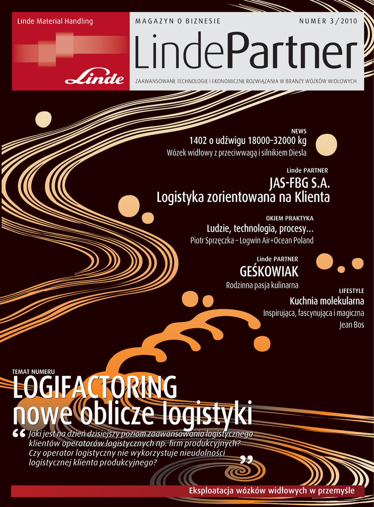 NEWS 1402 o udźwigu 18000–32000 kg Wózek widłowy z przeciwwagą i silnikiem Diesla Linde PARTNER JJAS-FBG AS-FBG S.A. Logistyka zorientowana na Klienta OKIEM PRAKTYKA Ludzie, technologia, procesy… Piotr Sprzęczka – Logwin Air+Ocean Poland Linde PARTNER GEŚKOWIAK Rodzinna pasja kulinarna LIFESTYLE Kuchnia molekularna Inspirująca, fascynująca i magiczna Jean Bos TEMAT NUMERU Jaki jest na dzień dzisiejszy poziom zaawansowania logistycznego ycznego klientów operatorów logistycznych np. firm produkcyjnych? h? Czy operator logistyczny nie wykorzystuje nieudolności logistycznej klienta produkcyjnego? Eksploatacja wózków widłowych w przemyśle 26 GRZEŚKOWIAK | PREZENTACJA PARTNERA PREZENTACJA PARTNERA | GRZEŚKOWIAK Historia współpracy KULINARNA PASJA RODZINY GRZEŚKOWIAK pomiędzy firmą GRZEŚKOWIAK i Linde Material Handling uczciwość kupiecką i przestrzeganie zasad dobrej konkurencji. GRZEŚKOWIAK to solidna polska marka i synonim najwyższej jakości. Potwierdzają to liczne nagrody i tytuły. Nasze produkty są doskonale rozpoznawane, mimo że nie prowadziliśmy agresywnych kampanii reklamowych. Etyka kupiecka jest fundamentem naszych działań, a dzięki nowoczesnym i innowacyjnym rozwiązaniom organizacyjnym, przyczyniamy się do tworzenia dobrej kultury dla biznesu w Europie Środkowej. Nasze wysiłki w tym względzie są zauważane i doceniane. Szczególnie dumni jesteśmy z otrzymywanego corocznie prestiżowego certyfikatu Przedsiębiorstwo FAIR PLAY. Firma GRZEŚKOWIAK to lider innowacji technologicznych w dziedzinie świeżej żywności. Dbamy o najwyższą jakość we wszystkim, co robimy. Jako pierwsi w kraju w swojej branży wdrożyliśmy system HACCP, który kontroluje produkt na każdym etapie jego powstawania. System HACCP został oceniony i zatwierdzony 23 sierpnia 2002 roku przez niezależną brytyjską jednostkę certyfikującą - Lloyd’s Register Quality Assurance - jako zgodny z amerykańskim Codex Alimentarius 1997. W sferze zarządzania konsekwentnie wdrażamy zasady Total Quality Management (TQM) w oparciu o wzorce Europejskiej Nagrody Jakości (EFQM). Metamorfoza Fenomen firmy Kulinarna pasja rodziny Grześkowiak, talent do interesów i osobiste zaangażowanie, wyznaczyły kierunek i tempo rozwoju firmy, która dziś jest liderem przedsiębiorczości z dynamiką przychodów na poziomie 100% rocznie. Firma GRZEŚKOWIAK powstała z połączenia kulinarnej pasji z talentem do interesów. Jej twórcami w latach 70-tych XX wieku byli Teresa i Jan Grześkowiak. Dziś rodzinny biznes kontynuują ich synowie: Marcin i Zbigniew, a potencjał produkcyjny firmy to 100 ton gotowych produktów dziennie. Firma początkowo stała się powszechnie znana w regionie dzięki znakomitej kapuście i ogórkom kwaszonym. Dziś jej oferta zawiera szerokągamę produktów owocowo-warzywnych przeznaczonych do bezpośredniej konsumpcji. Najbardziej znanymi wśród nich są Świeże Surówki GRZEŚKOWIAK, o wyjątkowych smakach i nazwach na każdą literę alfabetu: od “A” do “Z”. Fenomen firmy GRZEŚKOWIAK tworzą młodzi i kreatywni ludzie. Dzięki nim możliwa była metamorfoza małego, rodzinnego biznesu w firmę o zasięgu międzynarodowym. Polityka i strategia firmy oparta jest na koncepcji blink management. Zgodnie z nią, podstawowe znaczenie dla sukcesu firmy ma kreatywność i intuicja zespołu zarządzającego. Jesteśmy przekonani, że to właśnie ludzie decydują o sukcesie każdego przedsięwzięcia. Dlatego w trosce o nich promujemy zdrowy styl życia oparty na dobrych nawykach żywieniowych i aktywności fizycznej. Firma GRZEŚKOWIAK, mimo średniej wieku poniżej 30 lat w pionie administracyjnym, jest postrzegana jako poważny partner biznesowy i lider przedsiębiorczości. LindePartner 3/2010 Firma w liczbach Wybrana przez nas koncepcja organizacji otwartej i nowatorskie podejście do biznesu sprawia, że firma GRZEŚKOWIAK to poszukiwany partner na rynku. · 30 lat tradycji · 10.000 zamówień telefonicznych w tygodniu · 1-sza firma w Polsce z system HACCP w swojej branży · blisko 10.000 m2 nowoczesnych hal produkcyjnych · potencjał produkcyjny na poziomie 100 ton dziennie · ponad 5000 aktywnych klientów Promujemy zdrowy tryb życia oparty na dobrych nawykach żywieniowych i aktywności fizycznej. Popularyzujemy rozwiązania pro–ekologiczne, Marka a naszą Strategię Pro-Społeczną (Corporate Social Wyróżnia nas przejrzysta polityka firmy. Prowadzimy ją w oparciu o tradycyjną Responsibility) tworzymy w oparciu o działania przyjazne społeczności lokalnej. 27 Wielkopolska rzetelność,czy coś więcej? Troska o najwyższą jakość to nasza podstawowa ambicja. Dlatego nieustannie się doskonalimy i podnosimy poziom jakości wykonywanych usług. Uczestniczymy w kursach jakościowych i poddajemy się certyfikacji m.in. pod względem zgodności z normami ochrony środowiska. Konsekwentnie inwestujemy w najnowsze technologie. Posiadamy zintegrowany system komputerowy i imponującą flotę klikudziesięciu samochodów –chłodni. Każdego dnia obsługujemy ponad kilka tysięcy punktów handlowych i gastronomicznych w Polsce. Posiadamy nowoczesne technologie i blisko 10.000 m2 hal produkcyjnych odpowiadających najwyższym normom europejskim. Produkty Firmy GRZEŚKOWIAK to gwarancja jakości i satysfakcji. Gwarantem jakości produktów GRZEŚKOWIAK jest stabilna i profesjonalna kadra o wysokiej kulturze. Obok doskonałej technologii i systemów, to właśnie doświadczenie ludzi gwarantuje jakość naszych działań. Znikoma rotacja wśród pracowników, wysokie kwalifikacje, kultura osobista, a także zaangażowanie i wiedza, umożliwiają utrzymanie jakości produktu i usług na najwyżąszym poziomie. Firma GRZEŚKOWIAK postrzegana jest zarówno jako lider w swojej branży, jak i lider innowacyjnych rozwiązań w sferze kultury organizacyjnej. Nasze zaangażowanie społeczne, sprawia, że jesteśmy uważani za firmę przyjazną