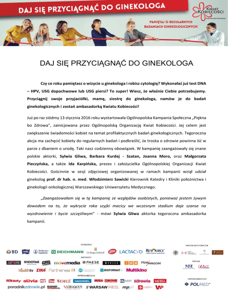 DAJ SIĘ PRZYCIĄGNĄĆ DO GINEKOLOGA Czy co roku pamiętasz o wizycie u ginekologa i robisz cytologię? Wykonałaś już test DNA – HPV, USG dopochwowe lub USG piersi? To super! Wiesz, że właśnie Ciebie potrzebujemy. Przyciągnij swoje przyjaciółki, mamę, siostrę do ginekologa, namów je do badań ginekologicznych i zostań ambasadorką Kwiatu Kobiecości! Już po raz siódmy 13 stycznia 2016 roku wystartowała Ogólnopolska Kampania Społeczna „Piękna bo Zdrowa”, zainicjowana przez Ogólnopolską Organizację Kwiat Kobiecości. Jej celem jest zwiększenie świadomości kobiet na temat profilaktycznych badań ginekologicznych. Tegoroczna akcja ma zachęcić kobiety do regularnych badań i podkreślić, że troska o zdrowie powinna iść w parze z dbaniem o urodę. Taki nasz codzienny obowiązek. W kampanię zaangażowały się znane polskie aktorki, Sylwia Gliwa, Barbara Kurdej - Szatan, Joanna Moro, oraz Małgorzata Pieczyńska, a także Ida Karpińska, prezes i założycielka Ogólnopolskiej Organizacji Kwiat Kobiecości. Gościnnie w sesji zdjęciowej organizowanej w ramach kampanii wziął udział ginekolog prof. dr hab. n. med. Włodzimierz Sawicki Kierownik Katedry i Kliniki położnictwa i ginekologii onkologicznej Warszawskiego Uniwersytetu Medycznego. „Zaangażowałam się w tę kampanię ze względów osobistych, ponieważ jestem żywym dowodem na to, że wykrycie raka szyjki macicy we wczesnym stadium daje szanse na wyzdrowienie i bycie szczęśliwym” - mówi Sylwia Gliwa aktorka tegoroczna ambasadorka kampanii. Odwiedź swojego ginekologa już dziś! Dawno nie pojawiłaś się u ginekologa? Dlaczego? Krępują Cię badania? Niepotrzebnie. Przecież tu chodzi o Twoje życie! Nie mów także, że masz za mało czasu albo najzwyczajniej krępują Cię takie badana. Profilaktyczna wizyta u ginekologa dla wielu, zwłaszcza dojrzałych kobiet, które nie były w gabinecie od lat, może być stresującym przeżyciem. Niepotrzebnie, pamiętaj, że dobry specjalista to przyjaciel kobiet i najlepszy doradca. Zaś badanie profilaktyczne to najlepszy sposób, by upewnić się, że jesteś zdrowa. Daj się przyciągnąć do ginekologa. Nie rezygnuj z profilaktyki! Daj się przyciągnąć do ginekologa Świadomość Polek związana z chorobami narządów rodnych, a także z wykonywaniem badań ginekologicznych w dalszym ciągu jest dość niska. Od lat pokutuje bowiem stwierdzenie, że do lekarza idzie się wtedy, gdy coś dolega. Dlatego wiele pań, zwłaszcza po urodzeniu dzieci, szerokim łukiem omija gabinety ginekologiczne. Kobiety nadal boją się, czasem wstydzą i szukają wymówek, by nie chodzić do specjalisty. Mamy, ciocie i babcie, które rzadko bywają u ginekologa nie dają, tym samym, dobrego przykładu córkom, siostrzenicom i wnuczkom. To błąd, za który niekiedy płaci się wysoką cenę. Wiele chorób ginekologicznych nie boli, a objawy pojawiają się dopiero w zaawansowanym stadium. Tymczasem musimy mieć świadomość tego, że regularne badania ginekologiczne mogą pomóc we wczesnym wykryciu kłopotów, np. raka szyjki macicy. Dlatego tegoroczna kampania Piękna bo Zdrowa, nawołuje: DAJ SIĘ PRZYCIĄGNĄĆ DO GINEKOLOGA PAMIĘTAJ O REGULARNYCH BADANIACH GINEKOLOGICZNYCH! Kampania ma na celu zwrócenie uwagi na problem chorób ginekologicznych kobiet i rzadkich wizyt w gabinetach ginekologicznych. Dlatego w tym roku w kampanii obecny jest również lekarz ginekolog, który w sposób symboliczny wskazuje na opisany problem. „Świadomość potrzeby badań ginekologicznych może ratować życie, to nie jest pusty slogan „daj się przyciągnąć do ginekologa”, ale prawda. Czerwona lina, która jest symbolem tej kampanii nie jest granicą między lekarzem a pacjentką a łącznikiem, który powinien je przyciągać do ginekologa. Badania ginekologiczne są bardzo krótkie, bezbolesne i nie należy się ich bać a skuteczność ich jest naprawdę bardzo wysoka” – powiedział podczas sesji zdjęciowej prof. dr hab. n. med. Włodzimierz Sawicki - Kierownik Katedry i Kliniki położnictwa i ginekologii onkologicznej Warszawskiego Uniwersytetu Medycznego. Pamiętajmy, że tylko regularne badania są skuteczną profilaktyką. Pamiętaj, że wiele chorób ginekologicznych nie boli, a objawy pojawiają się często w zaawansowanym stadium. Rak szyjki macicy - groźny przeciwnik! Razem damy radę go pokonać Rak szyjki macicy jest dość łatwy do zdiagnozowania. Rozwija się stosunkowo powoli, a jego umiejscowienie pozwala, w przeciwieństwie do innych nowotworów narządów rodnych, takich jak np. rak jajnika, na zastosowanie skutecznych metod diagnostycznych. W przypadku raka szyjki macicy wykonywanie regularnych badań cytologicznych odgrywa dużą rolę. Regularnie, co roku, wykonywana cytologia może nam dać pewność, że raka szyjki macicy wykryjemy we wczesnym stadium. Cytologia i test HPV skuteczną metodą profilaktyczną Rak szyjki macicy to choroba przenoszona drogą płciową. Obecnie na świecie wykonuje się powszechnie jeden test przesiewowy w profilaktyce raka szyjki macicy. Jest to badanie cytologiczne. Można je wykonywać w sposób konwencjonalny na szkiełku. Podczas badania lekarz pobiera materiał do badania, z szyjki macicy badanie to jest krótkie i co najważniejsze bezbolesne. Aby uniknąć ponownego pobierania materiału do badania, wystarczy pamiętać że: *badanie należy wykonać nie później niż 5 dni przed miesiączką *lub 5 dni po miesiączce *nie należy zakładać również globulek dopochwowych oraz *dzień przed badaniem unikać współżycia. Nowością, a zarazem skuteczniejszą alternatywą konwencjonalnej cytologii, jest cytologia na podłożu płynnym (LBC). Czym zatem różni się cytologia płynna od tej wykonywaną metodą tradycyjną? W metodzie tej całość pobranego z szyjki macicy materiału umieszczana jest bezpośrednio w specjalnym płynnym podłożu i transportowana do laboratorium. Tam,