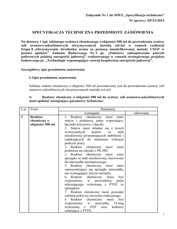 Załącznik Nr 1 do SIWZ „Specyfikacja techniczna” Nr sprawy: ZP/21/2012 SPECYFIKACJA TECHNICZNA PRZEDMIOTU ZAMÓWIENIA Na dostawę 1 kpl. szklanego reaktora chemicznego o objętości 500 ml do prowadzenia syntezy zoli uranowo-askorbinowych otrzymywanych metodą zol-żel w ramach realizacji Etapu 8 „Otrzymywanie dwutlenku uranu za pomocą zmodyfikowanej metody CSGP w postaci spieków” Zadania Badawczego Nr 3 pt. „Podstawy zabezpieczenia potrzeb paliwowych polskiej energetyki jądrowej” realizowanego w ramach strategicznego projektu badawczego pt. „Technologie wspomagające rozwój bezpiecznej energetyki jądrowej”. Szczegółowy opis przedmiotu zamówienia: I. Opis przedmiotu zamówienia Szklany reaktor chemiczny o objętości 500 ml przeznaczony jest do prowadzenia syntezy zoli uranowo-askorbinowych otrzymywanych metodą zol-żel. Reaktor chemiczny o objętości 500 ml do syntezy zoli uranowo-askorbinowych musi spełniać następujące parametry techniczne: II. L.p. Treść 1 Reaktor chemiczny o objętości 500 ml Parametry wymagane 1. Reaktor chemiczny musi mieć statyw i podstawę, pręty wspierające, łączniki krzyżowe i złączki. 2. Statyw musi składać się z trzech wytrzymałych prętów ze stali nierdzewnej gwarantujących stabilność i redukujących do minimum wibracje podczas pracy. 3. Reaktor chemiczny musi mieć podstawę na odcieki z PE-HD. 4. Reaktor chemiczny musi mieć sprzęgło ze stali nierdzewnej, mocowane do mieszadła mechanicznego. 5. Reaktor chemiczny musi mieć samocentrujące się sprzęgło mieszadła, nie wymagające użycia narzędzi. 6. Reaktor chemiczny musi być wyposażony w prowadnicę pręta mieszającego wykonaną z PTFE ze sprzęgłem. 7. Reaktor chemiczny musi posiadać szklaną pokrywę naczynia reakcyjnego. 8. Reaktor chemiczny musi być wyposażony w uszczelkę O-ring wykonaną z FEP oraz kołnierz centrujący z PTFE. oferowane 1 9. Reaktor chemiczny musi mieć dwie obręcze przytrzymujące do naczynia wykonane ze stali nierdzewnej - dla każdego naczynia jedna obręcz. 10. Reaktor chemiczny musi mieć szybko-złączkę do naczyń umożliwiającą natychmiastową ich wymianę, bez użycia narzędzi. 11. Reaktor chemiczny musi mieć węże łączące naczynie z głowicą wraz z szybko-złączkami. 12. Reaktor chemiczny musi zapewniać możliwość pracy z szerokim zakresem naczyń szklanych (z płaszczem termostatującym lub z płaszczem termostatującym i płaszczem próżniowym) o pojemnościach 250 ml, 500 ml, 1L, 2L, 3L i 5L. 13. Reaktor chemiczny musi być wyposażony w system mający możliwość współpracy ze wszystkimi dostępnymi na rynku mieszadłami mechanicznymi wiodących producentów. 14. Reaktor chemiczny musi mieć naczynie reakcyjne o objętości 500 ml z zaworem PTFE wraz z poniższym wyposażeniem-1 szt: złączki boczne, czujnik temperatury typu Pt100 PTFE z połączeniem Lemo, dopasowany do rozmiarów naczynia, adapter do czujnika temperatury z PTFE, pręt z kotwicową końcówką mieszającą z PTFE, dopasowany do rozmiarów naczynia. 15. Reaktor chemiczny musi być wyposażony w system dostosowany do pracy w zakresie temperatur -60ºC do +230°C. 16. Reaktor chemiczny musi być wyposażony w mieszadło mechaniczne 1szt. 17. Mieszadło mechaniczne musi posiadać następujące cechy: maksymalny moment obrotowy 90 Ncm i chwilowe przeciążenia do 180 Ncm, zakres prędkości od 30 do 1000 obr./min, możliwość skalibrowania momentu obrotowego urządzenia przed lub w trakcie mieszania w celu monitorowania zmian lepkości cieczy w czasie, kontrolę prędkości za pomocą reostatu lub poprzez złącze, jasny, czytelny wyświetlacz wskazujący 2 moment obrotowy i prędkość, praca z cieczami o lepkości do 40 000 mPas, stałą prędkość, nawet przy zmianie lepkości. III. 1. Wymagania dodatkowe: Oferowany zestaw musi być fabrycznie nowy, wyprodukowany w 2012 roku. Wykonawca zapewni na terenie Polski serwis gwarancyjny oraz serwis pogwarancyjny i zakup części zamiennych przez Zamawiającego przez okres co najmniej 5 lat, od daty zakończenia okresu gwarancji. 2. 3. W ramach udzielonej gwarancji Wykonawca pokryje koszty napraw urządzenia, jego wyposażenia i oprogramowania, a także pokryje koszty wymiany uszkodzonych elementów lub całej aparatury jeżeli zajdzie taka konieczność, koszty transportu, ubezpieczenia, koszty robocizny. 4. W okresie gwarancyjnym Wykonawca zapewni wykonanie całościowego przeglądu aparatury na miesiąc przed upływem terminu jej gwarancji. Wymagany termin dla realizacji niniejszego zamówienia, nie później niż do 15 października 2012 r. 5. Oferta musi być czytelna, sporządzona w języku polskim. Dopuszcza się możliwość składania opisów technicznych lub folderów w języku angielskim. Każdy dokument składający się na ofertę sporządzony w innym języku niż język polski powinien być złożony wraz z tłumaczeniem na język polski, poświadczonym przez Wykonawcę. W razie wątpliwości uznaje się, że wersja polskojęzyczna jest wersją wiążącą. 6. Wykonawca dostarczy: instrukcje obsługi aparatury i oprogramowania w języku polskim i angielskim. 7. 8. W przypadku dostarczenia aparatury z wadami lub jej poszczególnych elementów z wadami, Wykonawca zobowiązany jest do wymiany aparatury lub jej elementów na wolne od wad w terminie 60 dni od dnia otrzymania zgłoszenia od Zamawiającego o wadzie. 9. Serwis techniczny Wykonawcy powinien się skontaktować z Zamawiającym w ciągu 5 dni telefonicznie, faksem lub elektronicznie od momentu pisemnego, faksowego lub elektronicznego zgłoszenia reklamacji przez Zamawiającego lub bieżącej konsultacji, a w przypadku potrzeby powinien zgłosić się w siedzibie użytkownika w ciągu 15 dni od powyższego zgłoszenia. 10. Jeżeli Wykonawca odmówi lub będzie zwlekał z wypełnieniem swoich zobowiązań wynikających z gwarancji powyżej 30 dni od daty zgłoszenia przez Zamawiającego lub też nie działa