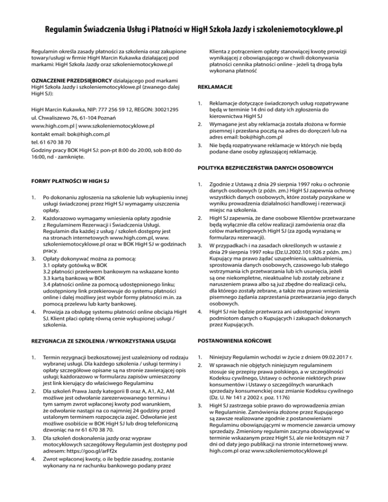 Regulamin Świadczenia Usług i Płatności w HigH Szkoła Jazdy i szkoleniemotocyklowe.pl Regulamin określa zasady płatności za szkolenia oraz zakupione towary/usługi w firmie HigH Marcin Kukawka działającej pod markami: HigH Szkoła Jazdy oraz szkoleniemotocykowe.pl OZNACZENIE PRZEDSIĘBIORCY działającego pod markami HigH Szkoła Jazdy i szkoleniemotocyklowe.pl (zwanego dalej HigH SJ): HigH Marcin Kukawka, NIP: 777 256 59 12, REGON: 30021295 ul. Chwaliszewo 76, 61-104 Poznań www.high.com.pl | www.szkoleniemotocyklowe.pl Klienta z potrąceniem opłaty stanowiącej kwotę prowizji wynikającej z obowiązującego w chwili dokonywania płatności cennika płatności online - jeżeli tą drogą była wykonana płatność REKLAMACJE 1. Reklamacje dotyczące świadczonych usług rozpatrywane będą w terminie 14 dni od daty ich zgłoszenia do kierownictwa HigH SJ 2. Wymagane jest aby reklamacja została złożona w formie pisemnej i przesłana pocztą na adres do doręczeń lub na adres email: [email protected] 3. Nie będą rozpatrywane reklamacje w których nie będą podane dane osoby zgłaszającej reklamację. kontakt email: [email protected] tel. 61 670 38 70 Godziny pracy BOK HigH SJ: pon-pt 8:00 do 20:00, sob 8:00 do 16:00, nd - zamknięte. POLITYKA BEZPIECZEŃSTWA DANYCH OSOBOWYCH FORMY PŁATNOŚCI W HIGH SJ 1. Po dokonaniu zgłoszenia na szkolenie lub wykupieniu innej usługi świadczonej przez HigH SJ wymagamy uiszczenia opłaty. 2. Każdorazowo wymagamy wniesienia opłaty zgodnie z Regulaminem Rezerwacji i Świadczenia Usługi. Regulamin dla każdej z usług / szkoleń dostępny jest na stronach internetowych www.high.com.pl, www. szkoleniemotocyklowe.pl oraz w BOK HigH SJ w godzinach pracy. 3. Opłaty dokonywać można za pomocą: 3.1 opłaty gotówką w BOK 3.2 płatności przelewem bankowym na wskazane konto 3.3 kartą bankową w BOK 3.4 płatności online za pomocą udostępnionego linku; udostępniony link przekierowuje do systemu płatności online i dalej możliwy jest wybór formy płatności m.in. za pomocą przelewu lub karty bankowej. 4. Prowizja za obsługę systemu płatności online obciąża HigH SJ. Klient płaci opłatę równą cenie wykupionej usługi / szkolenia. 1. Zgodnie z Ustawą z dnia 29 sierpnia 1997 roku o ochronie danych osobowych (z późn. zm.) HigH SJ zapewnia ochronę wszystkich danych osobowych, które zostały pozyskane w wyniku prowadzenia działalności handlowej i rezerwacji miejsc na szkolenia. 2. HigH SJ zapewnia, że dane osobowe Klientów przetwarzane będą wyłącznie dla celów realizacji zamówienia oraz dla celów marketingowych HigH SJ (za zgodą wyrażaną w formularzu rezerwacji). 3. W przypadkach i na zasadach określonych w ustawie z dnia 29 sierpnia 1997 roku (Dz.U.2002.101.926 z późn. zm.) Kupujący ma prawo żądać uzupełnienia, uaktualnienia, sprostowania danych osobowych, czasowego lub stałego wstrzymania ich przetwarzania lub ich usunięcia, jeżeli są one niekompletne, nieaktualne lub zostały zebrane z naruszeniem prawa albo są już zbędne do realizacji celu, dla którego zostały zebrane, a także ma prawo wniesienia pisemnego żądania zaprzestania przetwarzania jego danych osobowych. 4. HigH SJ nie będzie przetwarza ani udostępniać innym podmiotom danych o Kupujących i zakupach dokonanych przez Kupujących. REZYGNACJA ZE SZKOLENIA / WYKORZYSTANIA USŁUGI POSTANOWIENIA KOŃCOWE 1. 1. Niniejszy Regulamin wchodzi w życie z dniem 09.02.2017 r. 2. W sprawach nie objętych niniejszym regulaminem stosuje się przepisy prawa polskiego, a w szczególności Kodeksu cywilnego, Ustawy o ochronie niektórych praw konsumentów i Ustawy o szczególnych warunkach sprzedaży konsumenckiej oraz zmianie Kodeksu cywilnego (Dz. U. Nr 141 z 2002 r. poz. 1176) 3. HigH SJ zastrzega sobie prawo do wprowadzenia zmian w Regulaminie. Zamówienia złożone przez Kupującego są zawsze realizowane zgodnie z postanowieniami Regulaminu obowiązującymi w momencie zawarcia umowy sprzedaży. Zmieniony regulamin zaczyna obowiązywać w terminie wskazanym przez HigH SJ, ale nie krótszym niż 7 dni od daty jego publikacji na stronie internetowej www. high.com.pl oraz www.szkoleniemotocyklowe.pl 2. Termin rezygnacji bezkosztowej jest uzależniony od rodzaju wybranej usługi. Dla każdego szkolenia / usługi terminy i opłaty szczegółowe opisane są na stronie zawierającej opis usługi; każdorazowo w formularzu zapisów umieszczony jest link kierujący do właściwego Regulaminu Dla szkoleń Prawa Jazdy kategorii B oraz A, A1, A2, AM możliwe jest odwołanie zarezerwowanego terminu i tym samym zwrot wpłaconej kwoty pod warunkiem, że odwołanie nastąpi na co najmniej 24 godziny przed ustalonym terminem rozpoczęcia zajeć. Odwołanie jest możliwe osobiście w BOK HigH SJ lub drog telefoniczną dzwoniąc na nr 61 670 38 70. 3. Dla szkoleń doskonalenia jazdy oraz wypraw motocyklowych szczegółowy Regulamin jest dostępny pod adresem: https://goo.gl/arFf2x 4. Zwrot wpłaconej kwoty, o ile będzie zasadny, zostanie wykonany na nr rachunku bankowego podany przez