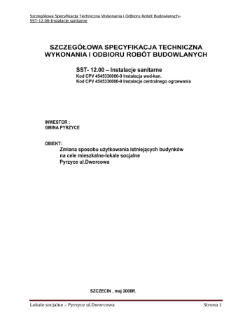 Szczegółowa Specyfikacja Techniczna Wykonania i Odbioru Robót Budowlanych– SST-12.00-Instalacje sanitarne SZCZEGÓŁOWA SPECYFIKACJA TECHNICZNA WYKONANIA I ODBIORU ROBÓT BUDOWLANYCH SST- 12.00 – Instalacje sanitarne Kod CPV 4545330000-9 Instalacja wod-kan. Kod CPV 4545330000-9 Instalacje centralnego ogrzewania INWESTOR : GMINA PYRZYCE OBIEKT: Zmiana sposobu użytkowania istniejących budynków na cele mieszkalne-lokale socjalne Pyrzyce ul.Dworcowa SZCZECIN , maj 2008R. Lokale socjalne – Pyrzyce ul.Dworcowa Strona 1 Szczegółowa Specyfikacja Techniczna Wykonania i Odbioru Robót Budowlanych– SST-12.00-Instalacje sanitarne 1. CZĘŚĆ OGÓLNA 1.1.Nazwa zamówienia. Szczegółowa specyfikacja techniczna SST-12.00 „Instalacje sanitarne odnosi się do wymagań technicznych dotyczących wykonania i odbioru robót wewnetrznych instalacji sanitarnych przewidzianych do wykonania na zadaniu p.n. „Zmiana sposobu użytkowania istniejących budynków na cele mieszkalne –lokale socjalne w Pyrzycach ul.Dworcowa.” 1.2. Przedmiot i zakres stosowania Szczegółowej Specyfikacji Technicznej (SST) . Szczegółowa Specyfikacja Techniczna jest częścią Dokumentacji w odniesieniu do zlecenia wykonania zadania opisanego w pkt.1.1. Szczegółowy zakres robót rozbiórkowych opisuje projekt wykonawczy architektoniczny oraz projekt budowlany branż sanitarnej i obejmuje wykonanie: -przyłącza wodnego -wewnętrznej instalacji wody zimnej -wewnętrznej instalacji wody ciepłej i cyrkulacji -wewnętrznej instalacji kanalizacji sanitarnej -wewnętrznej instalacji centralnego ogrzewania 1.3. Wyszczególnienie i opis prac towarzyszących i robót tymczasowych. • • Roboty towarzyszące Nie występują. Roboty tymczasowe Nie występują Wszystkie prace wykonywać pod nadzorem technicznym. W razie stwierdzenia nieprawidłowości wstrzymać roboty i powiadomić nadzór budowy. 1.4. Określenia podstawowe 1.4.1. Instalacje – systemy obejmujące wyposażenie, rury, kable, przewody i ich podpory, 1.4.2. Instalacja – system zawierający materiały i elementy tak zmontowane, aby zapewniły prawidłowe działanie systemu, 1.4.3. Instalacja sanitarna – instalacja dostarczająca ciepłą i zimną wodę do urządzeń sanitarnych wewnątrz budynku i usuwająca ścieki, 1.4.4. Marka zaprawy – symbol liczbowy odpowiadający wartości średniej na ściskanie, w MPa, wg obowiązujących norm przedmiotowych, 1.4.5. Urządzenie – element wyposażenia połączony z instalacją w celu użytkowania jej przez mieszkańców, 1.4.6. Urządzenia sanitarne – urządzenia zamocowane do których dostarczana jest woda pitna,woda do celów higienicznych lub odprowadzające ścieki, 1.4.7. Rura – długi przewód o przekroju pierścieniowym 1.4.8. Kształtka rurowa – element dopasowany do rury w celu połączenia, podparcia, zmiany kierunku lub średnicy otworu, 1.4.9. Sieć kanalizacyjna – system do usuwania wody powierzchniowej i ścieków z obszaru przyległego do budynku, zwykle z więcej niż jednej posesji (działki) 1.4.10. Zespół ustępowy – urządzenia sanitarne składające się z miski ustępowej, deski sedesowej, zbiornika spłukującego i rury spłukującej, 1.4.11. Wyposażenie – wyroby takie jak urządzenia sanitarne lub zestawy kuchenne, które stanowią wyposażenie przestrzeni użytkowanych przez ludzi i są zamontowane w budynku, 1.4.12. Grzejnik – element urządzenia centralnego ogrzewania, w którym czynnikiem grzejnym jest woda lub para wodna, 1.5. Ogólne wymagania dotyczące robót. Ogólne wymagania dotyczące Robót podano w ST-00 ”Wymagania ogólne” Wykonawca odpowiedzialny jest za jakość ich wykonania oraz za zgodność z Dokumentacją Techniczną, Specyfikacją Techniczną interesów poleceniami Inżyniera( Inspektora Nadzoru). Lokale socjalne – Pyrzyce ul.Dworcowa Strona 2 Szczegółowa Specyfikacja Techniczna Wykonania i Odbioru Robót Budowlanych– SST-12.00-Instalacje sanitarne Wykonawca będzie wykonywał roboty zgodnie z przyjętymi dostosowania normami , instrukcjami interesów przepisami. Wykonawca przedstawi Inwestorowi , Inspektorowi Nadzoru do zaakceptowania harmonogram robót , wykaz materiałów ,urządzeń interesów technologii stosowanych przy wykonywaniu robót określonych umową. 2.0.MATERIAŁY Do realizacji mogą być zastosowane wyroby producentów krajowych i zagranicznych posiadające aprobaty techniczne wydane przez odpowiednie instytuty badawcze. Wszystkie materiały stosowane przy wykonywaniu robót powinny : -być nowe i nieużywane, -odpowiadać wymaganiom norm i przepisów wymienionych w niniejszej specyfikacji -mieć wymagane polskimi przepisami świadectwa dopuszczenia do obrotu oraz wymagane ustawą z dnia 3 kwietnia 1993r. certyfikaty bezpieczeństwa. Przed wbudowaniem materiałów Wykonawca przestawi Zamawiającemu wszelkie wymagane przez niego dokumenty na udowodnienie powyższych wymagań. Materiały pochodzące z rozbiórki – do utylizacji zgodnie z ustawą. Materiały przewidziane do wbudowania przy budowie przyłącza wodnego oraz zimnej i ciepłej wody: -wodomierz JS-6Dn 32 260-G 1 -wodomierz JS -1,5 Dn20 -rury PE80 -rury PE-Xc TECE -otuliny NMC CLIMAFLE -baterie umywalkowe , zlewozmywakowe i wannowe Materiały przewidziane do wbudowania przy wykonywaniu instalacji c.o.: - pompa obiegowa Grundfos UPE 40-80F -naczynie wzbiorcze Flexcon C18/0,5 -zawór bezpieczeństwa PRESCOR 1 ¼”- 3,0 BARA -ciepłomierz elektroniczny CE3-JS-90 Dn20 130-G1 -grzejniki PURMO V -rury PE-Xc TECE -rozdzielacze wraz szafkami-podtynkowe -grzejniki łazienkowe -otulina NMC CLIMAFLEX Materiały przewidziane do wbudowani przy wykonywaniu instalacji kanalizacji sanitarnej: -rury UPONAL HT PP -czyszczaki z PCV fi 110mm -rury wywiewne fi 110mm -zlewozmywaki stalowe emaliowane -umywalki porcelanowe -wanny emaliowane -ustępy „kompakt” 3.0 WYMAGANIA DOTYCZĄCE SPRZĘTU I MASZYN Ogólne wymagania dotyczące stosowania sprzętu podano w ST-00 „Wymag