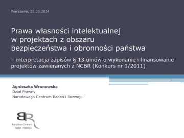 Warszawa, 25.06.2014 Prawa własności intelektualnej w projektach z obszaru bezpieczeństwa i obronności państwa – interpretacja zapisów § 13 umów o wykonanie i finansowanie projektów zawieranych z NCBR (Konkurs nr 1/2011) Agnieszka Wronowska Dział Prawny Narodowego Centrum Badań i Rozwoju Art. 32 ustawy o NCBR 1. W razie dokonania wynalazku, wzoru użytkowego lub wzoru przemysłowego w wyniku prac lub zadań finansowanych przez Centrum, prawo do uzyskania patentu na wynalazek albo prawa ochronnego na wzór użytkowy, jak również prawa z rejestracji wzoru przemysłowego przysługuje podmiotowi, któremu Dyrektor przyznał środki finansowe, chyba że umowa między Centrum a podmiotem otrzymującym środki finansowe albo decyzja o przyznaniu środków stanowi inaczej. 2. Do własności majątkowych praw autorskich powstałych w wyniku realizacji zadań finansowanych przez Centrum stosuje się przepisy ustawy z dnia 4 lutego 1994 r. o prawie autorskim i prawach pokrewnych (Dz. U. z 2006 r. Nr 90, poz. 631, z późn. zm.). 3. Właścicielem wynalazku, wzoru użytkowego lub wzoru przemysłowego powstałego w wyniku wykonania projektów dotyczących badań naukowych lub prac rozwojowych na rzecz obronności i bezpieczeństwa państwa, finansowanych przez Centrum, jest Skarb Państwa reprezentowany przez Ministra Obrony Narodowej. Zapisy umowne w zakresie praw własności intelektualnej – Konkurs nr 1/2011 NCBR umowa o wykonanie i finansowanie projektu WYKONAWCA umowa o wykonanie i finansowanie projektu dla projektów finansowanych przez NCBR w całości dla projektów finansowanych przez NCBR w części aneks do umowy o wykonanie i finansowanie projektu SP-MON § 13 umów o wykonanie i finansowanie projektów w Konkursie nr 1/2011 prawa własności przemysłowej do wynalazków, wzorów użytkowych i wzorów przemysłowych będą zawsze przysługiwały Skarbowi Państwa reprezentowanemu przez MON, zgodnie z art. 32 ust. 3 ustawy o NCBR; autorskie prawa majątkowe do wyników projektu pozostają po stronie wykonawcy; skuteczne nabycie praw autorskich przez Skarb Państwa wymaga zawarcia stosownej umowy zgodnej z wymogami przepisów prawa autorskiego, której stroną powinien być Skarb Państwa; zapewnienie udzielenia wykonawcy niewyłącznej licencji na dysponowanie wynikami projektu w przypadku projektów finansowanych przez NCBR w części – licencja udzielana przez Skarb Państwa reprezentowany przez MON; odrębna umowa o przeniesienie autorskich praw majątkowych do wyników projektu pomiędzy wykonawcą a Skarbem Państwa. Stanowisko MON (lipiec 2013) umowa o wykonywanie i finansowanie projektu umową dwustronną pomiędzy Dyrektorem NCBR a wykonawcą; prawa własności intelektualnej do wyników projektu przysługują temu samemu podmiotowi – Skarbowi Państwa reprezentowanemu przez MON; ustalenia w zakresie praw własności przemysłowej: właścicielem wynalazku, wzoru użytkowego lub wzoru przemysłowego jest SP-MON, zobowiązanie wykonawcy do niezwłocznego poinformowania SP-MON o dokonaniu wynalazku, wzoru użytkowego, wzoru przemysłowego, zobowiązanie wykonawcy do zachowania w poufności dokonanego wynalazku, wzoru użytkowego oraz wzoru przemysłowego, tak by rozwiązanie nie utraciło znamion nowości – do czasu dokonania przez SP-MON zgłoszenia patentowego, uzyskania prawa ochronnego lub prawa z rejestracji; ustalenia w zakresie praw autorskich: zobowiązanie wykonawcy do przeniesienia całości autorskich praw majątkowych na wszelkich polach eksploatacji znanych w chwili zawarcia umowy SP-MON, a także praw zależnych, prawa zezwalania na wykonywanie zależnych praw autorskich, w przypadku pojawienia się nowych pól eksploatacji – zobowiązanie wykonawcy do przeniesienia majątkowych praw autorskich na tych polach, nieodpłatne nabycie praw przez SP-MON, zobowiązanie wykonawcy do niewykonywania autorskich praw osobistych; Stanowisko MON (lipiec 2013) zobowiązanie wykonawcy do zabezpieczenia, aby całość praw autorskich do wszelkich rezultatów finansowanych prac i badań została prawidłowo nabyta przez wykonawcę, wprowadzenie do umów o pracę postanowień przenoszących prawo autorskie również na polach eksploatacji nieobjętych celem umowy o pracę, zawieranie umów o przeniesienie „całości” praw autorskich z osobami wykonującymi czynności na podstawie umów innych niż umowa o pracę. ustalenia w zakresie licencji: licencja na korzystanie z elementów autorskich oraz z wynalazków, wzorów użytkowych i wzorów przemysłowych, pewność/możliwość uzyskania licencji, ustalenie rodzaju i zakresu licencji z uwzględnieniem potrzeb Sił Zbrojnych RP, istotnego interesu bezpieczeństwa państwa oraz wysokości wkładu finansowego wykonawcy. Aneksy do umów o wykonanie i finansowanie projektów w zakresie praw własności intelektualnej wykonawcom przedłożono do podpisania aneksy do umów o wykonanie i finansowanie projektów w zakresie praw własności intelektualnej – zmiany miały na celu dostosowanie zapisów umów zgodnie ze stanowiskiem MON, możliwość podpisania aneksu do umowy również po zakończeniu realizacji projektu, o ile umowa nadal obowiązuje, możliwość modyfikacji zapisów umownych/aneksu do umowy – w uzgodnieniu z MON, modyfikacje zapisów w Konkursie nr 6/2014: możliwość korzystania z elementów autorskich powstałych w trakcie realizacji umowy, na warunkach uzgodnionych przez wykonawcę i Skarb Państwa reprezentowany przez MON, z zachowaniem interesu wykonawcy i Skarbu Państwa, możliwość przekazania na rzecz wykonawcy praw do publikacji, monografii i innych utworów wytworzonych w ramach projektu po uprzednim uzyskaniu zgody Skarbu Państwa reprezentowanego przez MON, możliwość uzyskiwania informacji o stopniu realizacji umowy przez Skarb Państwa reprezentowany przez MON lub inny upoważniony przez niego podmiot. Dziękuję za uwagę Zapraszam na www.ncbr.gov.pl Narodowe Centrum Badań i R