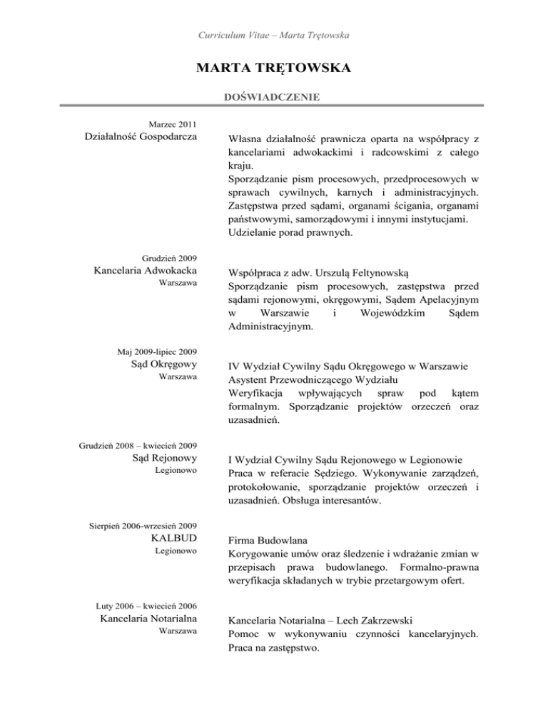 Curriculum Vitae – Marta Trętowska MARTA TRĘTOWSKA DOŚWIADCZENIE Marzec 2011 Działalność Gospodarcza Własna działalność prawnicza oparta na współpracy z kancelariami adwokackimi i radcowskimi z całego kraju. Sporządzanie pism procesowych, przedprocesowych w sprawach cywilnych, karnych i administracyjnych. Zastępstwa przed sądami, organami ścigania, organami państwowymi, samorządowymi i innymi instytucjami. Udzielanie porad prawnych. Grudzień 2009 Kancelaria Adwokacka Warszawa Współpraca z adw. Urszulą Feltynowską Sporządzanie pism procesowych, zastępstwa przed sądami rejonowymi, okręgowymi, Sądem Apelacyjnym w Warszawie i Wojewódzkim Sądem Administracyjnym. Maj 2009-lipiec 2009 Sąd Okręgowy Warszawa IV Wydział Cywilny Sądu Okręgowego w Warszawie Asystent Przewodniczącego Wydziału Weryfikacja wpływających spraw pod kątem formalnym. Sporządzanie projektów orzeczeń oraz uzasadnień. Grudzień 2008 – kwiecień 2009 Sąd Rejonowy Legionowo I Wydział Cywilny Sądu Rejonowego w Legionowie Praca w referacie Sędziego. Wykonywanie zarządzeń, protokołowanie, sporządzanie projektów orzeczeń i uzasadnień. Obsługa interesantów. Sierpień 2006-wrzesień 2009 KALBUD Legionowo Firma Budowlana Korygowanie umów oraz śledzenie i wdrażanie zmian w przepisach prawa budowlanego. Formalno-prawna weryfikacja składanych w trybie przetargowym ofert. Luty 2006 – kwiecień 2006 Kancelaria Notarialna Warszawa Kancelaria Notarialna – Lech Zakrzewski Pomoc w wykonywaniu czynności kancelaryjnych. Praca na zastępstwo. Curriculum Vitae – Marta Trętowska Marzec 2004 – październik 2007 EuroMedic International Poland Warszawa Stacja Dializ Praca w dziale Archiwum i Administracja Księgowość, kadry, weryfikacja oraz sporządzanie projektów umów zlecenia, wewnętrznych regulaminów i przepisów porządkowych EDUKACJA Styczeń 2010 – 2014 Okręgowa Rada Adwokacka Warszawa Aplikacja Adwokacka. Pozytywny wynik z egzaminu adwokackiego – uchwała Komisji Egzaminacyjnej do przeprowadzania egzaminu adwokackiego z siedzibą w Warszawie z dnia 7 maja 2014 r. Październik 2003 – czerwiec 2008 Wydział Prawa Warszawa Specjalizacja sądowa Obrona pracy magisterskiej „Granice działania obrońcy w procesie karnym”, promotor: Prokurator dr Monika Całkiewicz. Referent: Prezes Izby Karnej Sędzia Sądu Najwyższego dr hab. Lech Paprzycki. Październik ’05 Kolegium Zarządzania i Finansów Warszawa Wyższa Szkoła Przedsiębiorczości i Zarządzania im. Leona Koźmińskiego. Studia na kierunku Europeistyka – po drugim roku urlop dziekański Wrzesień 1999 – maj 2003 Liceum Ogólnokształcące Złożenie egzaminu maturalne Warszawa Zgodnie z Oświadczeniem Członek Rady Nadzorczej SFD S.A.: . nie prowadzi działalności poza Spółką, która ma istotne znaczenie dla Spółki. . nie jest obecnie ani w okresie ostatnich 3 lat nie był, za wyjątkiem wyżej opisanych, członkiem organów zarządzających lub nadzorczych, w żadnej spółce kapitałowej lub osobowej. Curriculum Vitae – Marta Trętowska . W stosunku do niej nie zostały wydane żadne wyroki związane z przestępstwami oszustwa. . nie otrzymała sądowego zakazu działania jako członek organów zarządzających lub nadzorczych w spółkach prawa handlowego. . nie pełniła funkcji członka organu zarządzającego lub nadzorczego w podmiotach, które znalazły się w stanie upadłości, zarządu komisarycznego ani likwidacji. . nie prowadzi działalności, która jest konkurencyjna w stosunku do działalności Spółki, oraz nie jest członkiem organu konkurencyjnej spółki kapitałowej lub członkiem organu jakiejkolwiek konkurencyjnej osoby prawnej; . nie jest wpisana do Rejestru Dłużników Niewypłacalnych, prowadzonego na podstawie ustawy o Krajowym Rejestrze Sądowym