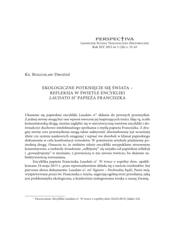 Ekologiczne potknięcie się świata – refleksja w świetle encykliki Laudato si’… 33 perspec†iva Legnickie Studia Teologiczno-Historyczne Rok XIV 2015 nr 1 (26) s. 33-43 Ks. Bogusław Drożdż Ekologiczne potknięcie się świata – refleksja w świetle encykliki Laudato si’ papieża Franciszka Ukazanie się papieskiej encykliki Laudato si’1 skłania do pewnych przemyśleń. Z jednej strony mogą być one wprost owocem jej inspirujących treści. Idąc tą, ściśle komentatorską drogą, można zagłębić się w merytoryczną warstwę encykliki i doświadczyć duchowo-intelektualnego spotkania z myślą papieża Franciszka. Z drugiej strony owe przemyślenia mogą także uaktywnić sformułowany już wcześniej zbiór czy system naukowych osiągnięć i wpisać ów dorobek w klimat papieskiego dokumentu w celu konfrontacji wniosków. W poniższym artykule pójdziemy pośrednią drogą. Oznacza to, że niektóre teksty encykliki uwypuklimy stosownym komentarzem, a niekiedy świadomie „odbijemy” się niejako od papieskiej refleksji i „powędrujemy” w nieznane, z pewnością w nie zawsze twórcze, bo skażone subiektywnością rozważania. Encyklika papieża Franciszka Laudato si’. W trosce o wspólny dom, opublikowana 24 maja 2015 r., poza wprowadzeniem składa się z sześciu rozdziałów. Już pierwsze słowa dokumentu: Laudato si’, mi’ Signore – Pochwalny bądź, Panie mój, wyśpiewywane przez św. Franciszka z Asyżu, sugerują ogólną treść przesłania, jaką jest problematyka ekologiczna, a konkretnie zintegrowana troska o naszą Ziemię. Franciszek. Encyklika Laudato si’. W trosce o wspólny dom (24.05.2015) [dalej: LS]. 1 Ks. Bogusław Drożdż 34 Papież kieruje […] naglące wezwanie, by ponowić dialog dotyczący sposobu, w jaki budujemy przyszłość naszej planety. Potrzebujemy konfrontacji, która nas wszystkich połączy, ponieważ wyzwanie ekologiczne i jego ludzkie korzenie dotyczą i dotykają nas wszystkich (LS 14). Wprowadzenie papieskie do dokumentu podkreśla, że dla Kościoła nic ze spraw tego świata nie jest i nie może być obojętne2. Stąd też zagadnienie ochrony i troski o środowisko naturalne było, jest i zawsze będzie dla niego istotne. Papież Franciszek przypomina, że refleksję teologiczną wokół spraw ekologicznych poruszali zarówno Paweł VI, np. w encyklice Pacem in terris, jak i św. Jan Paweł II, który m.in. zachęcał do „nawrócenia ekologicznego”3, ale również Benedykt XVI, który w encyklice Caritas in veritate zaznaczył, że „degradacja natury jest ściśle związana z kulturą kształtującą współżycie ludzkie”4. 1. Stwierdzić Pierwszy rozdział ekologicznej encykliki został przez papieża Franciszka zatytułowany następująco: Co się dzieje w naszym domu. Odnajdujemy tutaj siedem szerszych zagadnień, które diagnozują obecną sytuację przedmiotową problematyki ekologicznej. Papież wychodzi w swoich spostrzeżeniach od kwestii zanieczyszczenia oraz globalnego ocieplenia. Porusza następnie problem wody, uznając, że […] czysta woda pitna jest sprawą najwyższej wagi, ponieważ jest niezbędna do życia człowieka oraz wspierania ekosystemów lądowych i wodnych (LS 28). Franciszek w dalszej części tego rozdziału mówi o pogorszeniu jakości życia, upadku społecznym, globalnej niesprawiedliwości. Te sprawy jednakże nie są właściwie rozwiązywane z powodu słabości reakcji tych, którzy winni wziąć zdecydowanie większą odpowiedzialność za dobro wspólne, jak i tych, którzy uciekając w jałowe dysputy, generalnie „zamiatają sprawy pod dywan”. Papież widzi tutaj dwa ścierające się bieguny interpretacyjne: Na jednym biegunie niektórzy za wszelką cenę podtrzymują mit postępu i twierdzą, że problemy środowiskowe rozwiążą się po prostu poprzez zastosowanie nowych technik, bez rozważań etycznych ani dogłębnych zmian. Na Tekst wprowadzający komponują cztery cząstkowe tytuły: Nic ze spraw tego świata nie jest nam obce (LS 3-6); Zjednoczeni wspólną troską (LS 7-9); Święty Franciszek z Asyżu (10-12); Moje wezwanie (LS 13-16). 3 Jan Paweł II. Przemówienie podczas audiencji generalnej (17.01.2001). „L’Osservatore Romano” 22:2001 nr 4 s. 44 (4). 4 Benedykt XVI. Encyklika Caritas in veritate o integralnym rozwoju ludzkim w miłości i prawdzie (29.06.2009) (51). 2 Ekologiczne potknięcie się świata – refleksja w świetle encykliki Laudato si’… 35 drugim biegunie inni twierdzą, że rodzaj ludzki, ze wszystkimi jego ingerencjami, może być jedynie zagrożeniem i zaszkodzić globalnemu ekosystemowi, dlatego trzeba ograniczyć jego obecność na planecie i powstrzymać go od ingerencji wszelkiego rodzaju (LS 60). Odkrycie prawdy o rzeczywistej sytuacji ekologicznej naszego świata jest możliwe i konieczne. Nie należy ustawać w badaniach naturalnego środowiska. Z pomocą przychodzi nauka, która – na ile to możliwe – musi wyzwalać się spod ideologicznych wpływów. Zainteresowani bezsprzecznie wiedzą, że nauka obok religii, moralności i sztuki jest fragmentem całościowo rozumianej kultury. Obecnie jednak nauka zbyt porywczo odchodzi od swojego klasycznego wzorca nie tyle drogą porzucenia szukania prawdy, co raczej skrajnego koncentrowania się na prawdzie jednego rodzaju – fizycznej i biologicznej. A już na pewno model współczesnego rozumienia nauki porzucił cnotę. Dlatego nie trzeba dziwić się, że niemoralni naukowcy podejmują się niemoralnych eksperymentów i to nie tylko medycznych, także gospodarczych i społeczno-politycznych, a na pewno kulturowych – wycinając z kultury jej pionowy wymiar. I wszystko dla prostych i kruchych, często bardzo egoistycznych celów, ale ze strasznymi konsekwencjami, sięgającymi wnętrza człowieka i żywej tkanki społecznej, raniąc osobę w tajemnicy jej ducha i w tajemnicy jej uczestnictwa w życiu wspólnym. Rodzi się wtedy, a lepiej jest powie