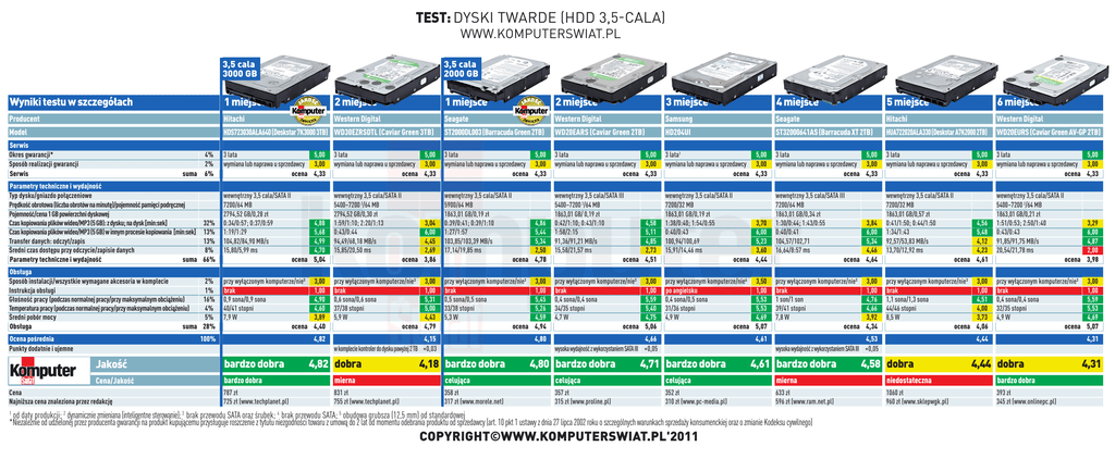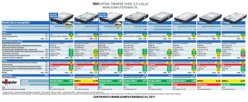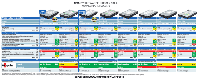 TEST: DYSKI TWARDE (HDD 3,5-CALA) WWW.KOMPUTERSWIAT.PL 3,5 cala 3000 GB 3,5 cala 2000 GB Wyniki testu w szczegółach 1 miejsce 2 miejsce 1 miejsce 2 miejsce 3 miejsce 4 miejsce 5 miejsce 6 miejsce Producent Hitachi Western Digital Seagate Western Digital Samsung Seagate Hitachi Western Digital Model HDS723030ALA640 (Deskstar 7K3000 3TB) WD30EZRSDTL (Caviar Green 3TB) ST2000DL003 (Barracuda Green 2TB) WD20EARS (Caviar Green 2TB) HD204UI ST32000641AS (Barracuda XT 2TB) HUA722020ALA330 (Deskstar A7K2000 2TB) WD20EURS (Caviar Green AV-GP 2TB) 4% 2% 6% 3 lata 5,00 wymiana lub naprawa u sprzedawcy 3,00 ocena 4,33 3 lata 5,00 wymiana lub naprawa u sprzedawcy 3,00 ocena 4,33 3 lata 5,00 wymiana lub naprawa u sprzedawcy 3,00 ocena 4,33 3 lata 5,00 wymiana lub naprawa u sprzedawcy 3,00 ocena 4,33 3 lata1 5,00 wymiana lub naprawa u sprzedawcy 3,00 ocena 4,33 3 lata 5,00 wymiana lub naprawa u sprzedawcy 3,00 ocena 4,33 3 lata 5,00 wymiana lub naprawa u sprzedawcy 3,00 ocena 4,33 3 lata 5,00 wymiana lub naprawa u sprzedawcy 3,00 ocena 4,33 32% 13% 13% 8% 66% wewnętrzny 3,5 cala/SATA II 7200/64 MB 2794,52 GB/0,28 zł 0:34/0:57; 0:37/0:59 1:19/1:29 104,82/84,90 MB/s 15,80/5,99 ms ocena 4,88 5,68 4,99 4,70 5,04 wewnętrzny 3,5 cala/SATA II 5400–7200 2/64 MB 2794,52 GB/0,30 zł 1:59/1:10; 2:20/1:13 0:43/0:44 94,49/68,18 MB/s 15,85/20,50 ms ocena 3,04 6,00 4,45 2,69 3,86 wewnętrzny 3,5 cala/SATA II 5900/64 MB 1863,01 GB/0,19 zł 0:39/0:41; 0:39/1:10 1:27/1:57 103,85/103,39 MB/s 17,14/19,85 ms ocena 4,86 5,44 5,34 2,50 4,78 wewnętrzny 3,5 cala/SATA III 5400–7200 2/64 MB 1863,01 GB/ 0,19 zł 0:42/1:10; 0:43/1:10 1:58/2:15 91,36/91,21 MB/s 15,58/21,57 ms ocena 4,58 5,11 4,85 2,73 4,51 wewnętrzny 3,5 cala/SATA II 7200/32 MB 1863,01 GB/0,19 zł 1:38/0:40; 1:54/0:55 0:40/0:43 100,94/100,69 15,91/14,46 ms ocena 3,70 6,00 5,23 3,60 4,44 wewnętrzny 3,5 cala/SATA III 7200/64 MB 1863,01 GB/0,34 zł 1:30/0:44; 1:43/0:55 0:40/0:41 104,57/102,71 16,64/8:57 ms ocena 3,84 6,00 5,34 4,46 4,64 wewnętrzny 3,5 cala/SATA II 7200/32 MB 1863,01 GB/0,57 zł 0:41/1:50; 0:44/1:50 1:34/1:43 92,57/53,83 MB/s 13,70/12,92 ms ocena 4,56 5,48 4,12 4,23 4,61 wewnętrzny 3,5 cala/SATA II 5400–7200 2/64 MB 1863,01 GB/0,21 zł 1:51/0:53; 2:50/1:40 0:43/0:43 91,85/91,75 MB/s 20,54/21,78 ms ocena 3,29 6,00 4,87 2,00 3,98 Obsługa Sposób instalacji/wszystkie wymagane akcesoria w komplecie 2% Instrukcja obsługi 1% Głośność pracy (podczas normalnej pracy/przy maksymalnym obciążeniu) 16% Temperatura pracy (podczas normalnej pracy/przy maksymalnym obciążeniu) 4% Średni pobór mocy 5% Obsługasuma 28% przy wyłączonym komputerze/nie3 brak 0,9 sona/0,9 sona 40/41 stopni 7,9 W ocena 3,00 1,00 4,90 4,60 3,89 4,40 przy wyłączonym komputerze/nie3 brak 0,6 sona/0,6 sona 37/38 stopni 5,9 W ocena 3,00 1,00 5,31 5,00 4,43 4,79 przy wyłączonym komputerze/nie3 brak 0,5 sona/0,5 sona 33/38 stopni 5,3 W ocena 3,00 1,00 5,45 5,26 4,59 4,94 przy wyłączonym komputerze/nie3 brak 0,4 sona/0,4 sona 34/35 stopni 4,7 W ocena 3,00 1,00 5,59 5,40 4,75 5,06 przy wyłączonym komputerze/nie4 po angielsku 0,4 sona/0,5 sona 31/36 stopni 4,9 W ocena 3,50 1,00 5,53 5,53 4,69 5,07 przy wyłączonym komputerze/nie3 brak 1 son/1 son 39/41 stopni 7,8 W ocena 3,00 1,00 4,76 4,66 3,92 4,34 przy wyłączonym komputerze/nie3 brak 1,1 sona/1,3 sona 44/46 stopni 8,5 W ocena 3,00 1,00 4,51 4,00 3,73 4,06 przy wyłączonym komputerze/nie3 brak 0,4 sona/0,4 sona 32/35 stopni 4,9 W ocena 3,00 1,00 5,59 5,53 4,69 5,07 4,82 4,15 w komplecie kontroler do dysku powyżej 2 TB +0,03 4,80 4,66 wysoka wydajność z wykorzystaniem SATA III +0,05 4,61 4,53 wysoka wydajność z wykorzystaniem SATA III +0,05 Serwis Okres gwarancji* Sposób realizacji gwarancji Serwissuma Parametry techniczne i wydajność Typ dysku/gniazdo połączeniowe Prędkość obrotowa (liczba obrotów na minutę)/pojemność pamięci podręcznej Pojemność/cena 1 GB powierzchni dyskowej Czas kopiowania plików wideo/MP3 (5 GB): z dysku; na dysk [min:sek] Czas kopiowania plików wideo/MP3 (5 GB) w innym procesie kopiowania [min:sek] Transfer danych: odczyt/zapis Średni czas dostępu przy odczycie/zapisie danych Parametry techniczne i wydajność suma Ocena pośrednia Punkty dodatnie i ujemne 100% Jakość Cena/Jakość Cena Najniższa cena znaleziona przez redakcję bardzo dobra 4,82 dobra4,18 bardzo dobra 4,80 bardzo dobra 4,71 bardzo dobra 4,61 bardzo dobra 4,44 4,31 4,58 dobra4,44 dobra4,31 bardzo dobra mierna celująca celująca celująca mierna niedostateczna bardzo dobra 787 zł 725 zł (www.techplanet.pl) 831 zł 755 zł (www.techplanet.pl) 358 zł 317 zł (www.morele.net) 357 zł 315 zł (www.proline.pl) 352 zł 310 zł (www.pc-media.pl) 633 zł 596 zł (www.ram.net.pl) 1060 zł 960 zł (www.sklepwgk.pl) 393 zł 345 zł (www.onlinepc.pl) od daty produkcji; 2 dynamicznie zmieniana (inteligentne sterowanie); 3 brak przewodu SATA oraz śrubek; 4 brak przewodu SATA; 5 obudowa grubsza (12,5 mm) od standardowej *Niezależnie od udzielonej przez producenta gwarancji na produkt kupującemu przysługuje roszczenie z tytułu niezgodności towaru z umową do 2 lat od momentu odebrania produktu od sprzedawcy (art. 10 pkt 1 ustawy z dnia 27 lipca 2002 roku o szczególnych warunkach sprzedaży konsumenckiej oraz o zmianie Kodeksu cywilnego) 1 COPYRIGHT©WWW.KOMPUTERSWIAT.PL'2011