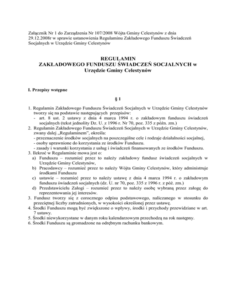 Załącznik Nr 1 do Zarządzenia Nr 107/2008 Wójta Gminy Celestynów z dnia 29.12.2008r w sprawie ustanowienia Regulaminu Zakładowego Funduszu Świadczeń Socjalnych w Urzędzie Gminy Celestynów REGULAMIN ZAKŁADOWEGO FUNDUSZU ŚWIADCZEŃ SOCJALNYCH w Urzędzie Gminy Celestynów I. Przepisy wstępne §1 1. Regulamin Zakładowego Funduszu Świadczeń Socjalnych w Urzędzie Gminy Celestynów tworzy się na podstawie następujących przepisów: - art. 8 ust. 2 ustawy z dnia 4 marca 1994 r. o zakładowym funduszu świadczeń socjalnych (tekst jednolity Dz. U. z 1996 r. Nr 70, poz. 335 z późn. zm.) 2. Regulamin Zakładowego Funduszu Świadczeń Socjalnych w Urzędzie Gminy Celestynów, zwany dalej „Regulaminem”, określa: - przeznaczenie środków socjalnych na poszczególne cele i rodzaje działalności socjalnej, - osoby uprawnione do korzystania ze środków Funduszu. - zasady i warunki korzystania z usług i świadczeń finansowanych ze środków Funduszu. 3. Ilekroć w Regulaminie mowa jest o: a) Funduszu – rozumieć przez to naleŜy zakładowy fundusz świadczeń socjalnych w Urzędzie Gminy Celestynów, b) Pracodawcy – rozumieć przez to naleŜy Wójta Gminy Celestynów, który administruje środkami Funduszu c) ustawie – rozumieć przez to naleŜy ustawę z dnia 4 marca 1994 r. o zakładowym funduszu świadczeń socjalnych (dz. U. nr 70, poz. 335 z 1996 r. z póź. zm.) d) Przedstawicielu Załogi – rozumieć przez to naleŜy osobę wybraną przez załogę do reprezentowania jej interesów. 3. Fundusz tworzy się z corocznego odpisu podstawowego, naliczanego w stosunku do przeciętnej liczby zatrudnionych, w wysokości określonej przez ustawę. 4. Środki Funduszu mogą być zwiększone o wpływy, środki i przychody przewidziane w art. 7 ustawy. 5. Środki niewykorzystane w danym roku kalendarzowym przechodzą na rok następny. 6. Środki Funduszu są gromadzone na odrębnym rachunku bankowym. II. Przeznaczenie Zakładowego Funduszu Świadczeń Socjalnych. §2 1. Środki Funduszu przeznacza się na finansowanie działalności socjalnej organizowanej na rzecz osób uprawnionych do korzystania z Funduszu w tym : a) zapomogi pienięŜne bezzwrotne w razie wypadków losowych, długotrwałej choroby lub ubóstwa, b) dofinansowanie raz w roku kalendarzowym wypoczynku urlopowego pracowników, c) dofinansowanie działalności kulturalno-oświatowej w postaci zakupu biletów na imprezy artystyczne, kulturalne, rozrywkowe i sportowe oraz sprzętu sportowego do wspólnego uŜytku, d) poŜyczki zwrotne na cele mieszkaniowe. III. Osoby uprawnione do korzystania z Zakładowego Funduszu Świadczeń Socjalnych. §3 1. Ze świadczeń Funduszu mają prawo korzystać : a) pracownicy zatrudnieni w Urzędzie Gminny Celestynów niezaleŜnie od rodzaju umowy o pracę oraz od wymiaru czasu pracy, b) pracownicy przebywający na urlopach wychowawczych, c) emeryci i renciści, zatrudnieni przed przejściem na emeryturę lub rentę w Urzędzie Gminy Celestynów, d) członkowie rodzin osób wymienionych w pkt. a - c. 2. Członkami rodzin, o których mowa w pkt. 1 lit. d) są : a) współmałŜonkowie, b) pozostające na utrzymaniu i wychowaniu osoby uprawnionej dzieci własne, dzieci przysposobione oraz przyjęte na wychowanie w ramach rodziny zastępczej do lat 18, a jeŜeli kształcą się w szkole – do czasu ukończenia nauki, nie dłuŜej jednak niŜ do ukończenia 25 lat, a osoby niepełnosprawne bez względu na wiek. IV. Zasady i warunki przyznawania świadczeń socjalnych. §4 1. Przyznanie i wysokość świadczenia ze środków Funduszu uzaleŜniona jest od sytuacji Ŝyciowej, rodzinnej i materialnej, a w przypadku pomocy mieszkaniowej równieŜ od sytuacji mieszkaniowej i ma charakter uznaniowy. Osoby korzystające ze świadczeń socjalnych są obowiązane informować Pracodawcę o zmianach ich sytuacji Ŝyciowej, rodzinnej i materialnej, mających wpływ na uprawnienia do świadczeń z Funduszu. 2. Świadczenia w postaci zapomóg pienięŜnych, dofinansowania wypoczynku, a takŜe poŜyczki zwrotnej na cele mieszkaniowe udzielane są na podstawie wniosków osób uprawnionych. 3. Sytuacja materialna jest ustalana według kryterium dochodu przypadającego na jednego członka rodziny osoby uprawnionej w okresie 6 miesięcy przed złoŜeniem wniosku. 4. Przy ustalaniu dochodu brutto przypadającego na jedną osobę w rodzinie przyjmuje się wszystkie stałe dochody pracownika, jego współmałŜonka oraz innych osób z nim zamieszkujących i wspólnie prowadzących gospodarstwo domowe. 5. Ubiegający się o świadczenie socjalne wykazuje w/w dochód w pisemnym oświadczeniu, wraz z załączonymi kopiami zeznań wszystkich zamieszkujących i prowadzących wspólne gospodarstwo domowe o wysokości osiągniętego dochodu w roku podatkowym (PIT) za rok poprzedni. Pracodawca jest upowaŜniony do sprawdzenia danych zawartych w oświadczeniu i Ŝądania dodatkowych wyjaśnień lub dokumentów. W przypadku stwierdzenia nieprawidłowości w złoŜonym oświadczeniu, wnioskujący traci prawo do świadczenia socjalnego w danym roku kalendarzowym 6. W przypadku dzieci pozostających na utrzymaniu w wieku powyŜej 18 lat kształcących się w szkole - do ukończenia nauki, nie dłuŜej niŜ do ukończenia 25 roku, osoba występująca o świadczenie socjalne, powinna przedstawić zaświadczenie o pobieraniu nauki przez dane dziecko. 7. MałŜonkowie zatrudnieni u tego samego Pracodawcy korzystają z dopłat do wypoczynku dla dzieci i młodzieŜy tylko z tytułu zatrudnienie tylko jednego z nich. §5 1. Osoba ubiegająca się o świadczenie socjalne w postaci dofinansowania do wypoczynku składa wniosek na formularzu, którego wzór stanowi załącznik nr 1 do Regulaminu. 2. Pracownik ubiegający się o dopłatę do wypoczynku powinien złoŜyć stosowny wniosek do końca pierwszego kwartału danego roku kalendarzowego i wykorzystać w danym roku jednorazowo urlop wypoczynkowy w wymiarze co najmniej 14 