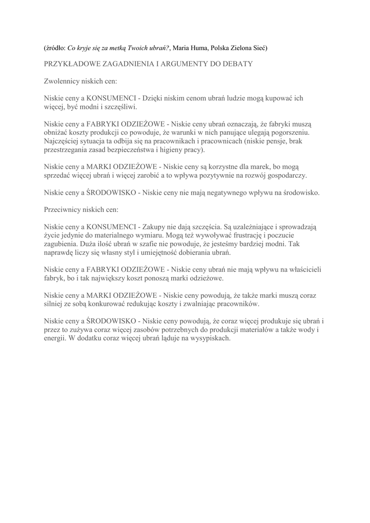 (źródło: Co kryje się za metką Twoich ubrań?, Maria Huma, Polska Zielona Sieć) PRZYKŁADOWE ZAGADNIENIA I ARGUMENTY DO DEBATY Zwolennicy niskich cen: Niskie ceny a KONSUMENCI - Dzięki niskim cenom ubrań ludzie mogą kupować ich więcej, być modni i szczęśliwi. Niskie ceny a FABRYKI ODZIEŻOWE - Niskie ceny ubrań oznaczają, że fabryki muszą obniżać koszty produkcji co powoduje, że warunki w nich panujące ulegają pogorszeniu. Najczęściej sytuacja ta odbija się na pracownikach i pracownicach (niskie pensje, brak przestrzegania zasad bezpieczeństwa i higieny pracy). Niskie ceny a MARKI ODZIEŻOWE - Niskie ceny są korzystne dla marek, bo mogą sprzedać więcej ubrań i więcej zarobić a to wpływa pozytywnie na rozwój gospodarczy. Niskie ceny a ŚRODOWISKO - Niskie ceny nie mają negatywnego wpływu na środowisko. Przeciwnicy niskich cen: Niskie ceny a KONSUMENCI - Zakupy nie dają szczęścia. Są uzależniające i sprowadzają życie jedynie do materialnego wymiaru. Mogą też wywoływać frustrację i poczucie zagubienia. Duża ilość ubrań w szafie nie powoduje, że jesteśmy bardziej modni. Tak naprawdę liczy się własny styl i umiejętność dobierania ubrań. Niskie ceny a FABRYKI ODZIEŻOWE - Niskie ceny ubrań nie mają wpływu na właścicieli fabryk, bo i tak największy koszt ponoszą marki odzieżowe. Niskie ceny a MARKI ODZIEŻOWE - Niskie ceny powodują, że także marki muszą coraz silniej ze sobą konkurować redukując koszty i zwalniając pracowników. Niskie ceny a ŚRODOWISKO - Niskie ceny powodują, że coraz więcej produkuje się ubrań i przez to zużywa coraz więcej zasobów potrzebnych do produkcji materiałów a także wody i energii. W dodatku coraz więcej ubrań ląduje na wysypiskach.