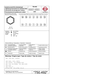 Anziehvorschrift für Zylinderkopf Tightening Instructions for Cylinder Head Instructions de serrage pour culasse 750.492 passend für / suitable for adaptable à / adaptable a BMW Prescripciones de apriete para culatas Schraubenkopf / Head shape Tête de vis / Cabeza de tornillo Anziehreihenfolge/Tightening sequence/Ordre de serrage/Orden de apriete 802.700 M 12 x 157 Anziehen/ Tightening/ Serrage/ Apriete ❂ ● ✱ ➤ 58 - 62 Nm 25 min 78 - 82 Nm 80°C 30° - 40° Zeichenerklärung / Explanations / Explication / Explicacion ❂ neue Zylinderkopfschrauben verwenden use new cylinder head bolts utiliser des vis neuves emplar tornillos nuevos ✱ Warmlauf (80°C) warm up time (80°C) chauffage (80°C) calentamiento (80°C) ❏ Schrauben einzeln lösen und wieder anziehen loosen and tighten each bolt deserrer et serrer vis par vis aflojar y apretar tornillo a tornillo ● Setzzeit relaxation time durée de tassement tiempo de espera ➤ Drehwinkel torque angle angle de serrage ángulo de giro Motortyp / Engine type / Type de moteur / Tipo de motor Mot. M30 B35, 3430cm³ E28 528i, 535i, M535i E24 635CSi 05/1982®06/1987 E23 735i 09/1982®, 745i ®05/1983 E34 535i E32 735i,iL Ø 93,5 mm ¿ 2,07mm (+0,3) ElringKlinger AG, Max-Eyth-Str.2 72581 Dettingen / Erms. Tel. 07123/724 601 *750.492*