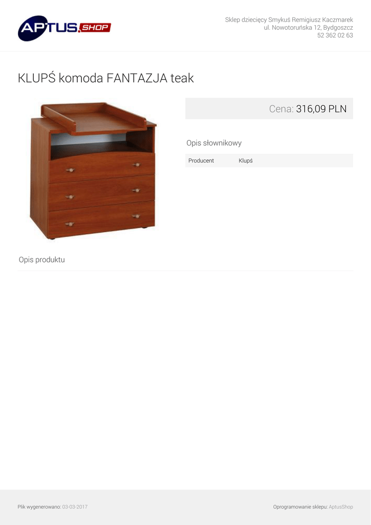 Sklep dziecięcy Smykuś Remigiusz Kaczmarek ul. Nowotoruńska 12, Bydgoszcz 52 362 02 63 KLUPŚ komoda FANTAZJA teak Cena: 316,09 PLN Opis słownikowy Producent Klupś Opis produktu Plik wygenerowano: 03-03-2017 Powered by TCPDF (www.tcpdf.org) Oprogramowanie sklepu: AptusShop