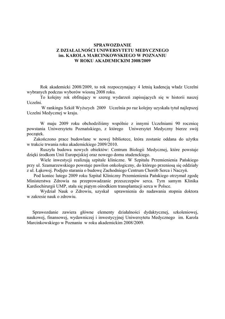 SPRAWOZDANIE Z DZIAŁALNOŚCI UNIWERSYTETU MEDYCZNEGO im. KAROLA MARCINKOWSKIEGO W POZNANIU W ROKU AKADEMICKIM 2008/2009 Rok akademicki 2008/2009, to rok rozpoczynający 4 letnią kadencją władz Uczelni wybranych podczas wyborów wiosną 2008 roku. To kolejny rok obfitujący w szereg wydarzeń zapisujących się w historii naszej Uczelni. W rankingu Szkół Wyższych 2009 Uczelnia po raz kolejny uzyskała tytuł najlepszej Uczelni Medycznej w kraju. W maju 2009 roku obchodziliśmy wspólnie z innymi Uczelniami 90 rocznicę powstania Uniwersytetu Poznańskiego, z którego Uniwersytet Medyczny bierze swój początek. Zakończono prace budowlane w nowej bibliotece, która zostanie oddana do użytku w trakcie trwania roku akademickiego 2009/2010. Ruszyła budowa nowych obiektów: Centrum Biologii Medycznej, które powstaje dzięki środkom Unii Europejskiej oraz nowego domu studenckiego. Wiele inwestycji realizują szpitale kliniczne. W Szpitalu Przemienienia Pańskiego przy ul. Szamarzewskiego powstaje pawilon onkologiczny, do którego przeniosą się oddziały z ul. Łąkowej. Podjęto starania o budowę Zachodniego Centrum Chorób Serca i Naczyń. Pod koniec lutego 2009 roku Szpital Kliniczny Przemienienia Pańskiego otrzymał zgodę Ministerstwa Zdrowia na przeprowadzanie przeszczepów serca. Tym samym Klinika Kardiochirurgii UMP, stała się piątym ośrodkiem transplantacji serca w Polsce. Wydział Nauk o Zdrowiu, uzyskał uprawnienia do nadawania stopnia doktora w zakresie nauk o zdrowiu. Sprawozdanie zawiera główne elementy działalności dydaktycznej, szkoleniowej, naukowej, finansowej, wydawniczej i inwestycyjnej Uniwersytetu Medycznego im. Karola Marcinkowskiego w Poznaniu w roku akademickim 2008/2009. KSZTAŁCENIE W roku akademickim 2008/2009 na czterech wydziałach i jedenastu kierunkach studiów stacjonarnych oraz dziewięciu kierunkach studiów niestacjonarnych kształciło się łącznie studentów: 8270 w tym: - na studiach stacjonarnych - 4654 - na studiach niestacjonarnych - 2641 - obcokrajowców 975 ( w tym 932 odbywających studia w j. angielskim) Liczbę studentów na poszczególnych kierunkach przedstawia tabela nr 1. Tabela nr 1 Liczba studiujących na poszczególnych kierunkach ( dane statystyczne dla GUS) Kierunek studiów Studia stacjonarne Studia niestacjonarne Lekarski - tym obcokrajowcy 1278 22 Lekarski – w jęz. angielskim 648 Lekarsko-Dentystyczny - tym obcokrajowcy lekarsko-dentystyczny – w jęz. angielskim Techniki dentystyczne studia I stopnia Biotechnologia -studia I stopnia - magisterskie Farmacja - tym obcokrajowcy farmacja w jęz. angielskim Analityka medyczna Kosmetologia - studia I stopnia - studia II stopnia Pielęgniarstwo - studia I stopnia - studia II stopnia - magisterskie 402 14 266 91 44 44 60 19 834 5 18 165 1 Położnictwo - studia I stopnia - studia II stopnia Zdrowie Publiczne -studia I stopnia -studia II stopnia Fizjoterapia - studia I stopnia -studia II stopnia w tym obcokrajowcy Dietetyka Ratownictwo medyczne - studia I stopnia RAZEM 227 65 - 74 - 87 80 270 153 - 408 464 8 224 133 125 211 275 144 210 164 249 144 2 170 189 131 98 5629 97 2641 2 W roku akademickim 2008/2009 studia ukończyło: 365 lekarzy w tym: - 84 osoby studiujące w języku angielskim: w programie 4-letnim - 53 w programie 6-letnim – 31 2 obcokrajowców 117 lekarzy dentystów w tym: - 33 osoby studiujące w języku angielskim w programie 5 letnim - 2 obcokrajowców 166 magistrów farmacji w tym: 2 osoby studiujące w języku angielskim w programie 5-letnim farmacja 43 magistrów analityki medycznej Studia stacjonarne 105 osób z tytułem licencjata - pielęgniarstwo 85 osób z tytułem licencjata - położnictwo 74 osoby z tytułem licencjata - fizjoterapia 67 osób z tytułem licencjata – zdrowie publiczne 20 osób z tytułem licencjata – ratownictwo medyczne 15 osób z tytułem licencjata – techniki dentystyczne 6 osób z tytułem licencjata – zdrowie publiczne, specj. higiena dentystyczna 24 osoby z tytułem licencjata - kosmetologia Studia niestacjonarne 211 osób z tytułem licencjata – pielęgniarstwo 52 osoby z tytułem licencjata – fizjoterapia 119 osób z tytułem licencjata – położnictwo 41 osób z tytułem licencjata – zdrowie publiczne 14 osób z tytułem licencjata – ratownictwo medyczne 12 osób z tytułem licencjata – techniki dentystyczne 4 osoby z tytułem licencjata – zdrowie publiczne, specj. higiena dentystyczna 13 osób z tytułem licencjata - kosmetologia Studia stacjonarne 51 magistrów fizjoterapii 55 magistrów zdrowia publicznego 30 magistrów pielęgniarstwa 37 magistrów położnictwa Studia niestacjonarne 148 magistrów pielęgniarstwa 38 magistrów fizjoterapii 40 magistrów zdrowia publicznego 62 magistrów położnictwa Łączna liczba absolwentów - 2014 3 Pomoc stypendialna W roku akademickim 2008/2009 przyznano: - stypendia socjalne 789 stypendia naukowe 1002 stypendia Ministra Zdrowia 8 stypendia dla osoby niepełnosprawnej 50 stypendia Rządu RP dla cudzoziemców 12 Organizacje studenckie W Uczelni działają następujące organizacje studenckie: - Rada Uczelniana Samorządu Studenckiego - Studenckie Towarzystwo Naukowe - Akademicki Związek Sportowy - Chór Akademicki - Międzynarodowe Stowarzyszenie Studentów Medycyny IFMSA-Poland -Redakcja Gazety „Puls UM” - Młoda Farmacja - Polskie Towarzystwo Studentów Stomatologii - American Student Government - Poznan Taiwanese Student Government - The American Medical Student Association - AMSA (oddział) - The North American Dental Association – NADA (oddział) - Akademickie Stowarzyszenie Medycyny Ratunkowej Wszystkie organizacje poza organizacjami anglojęzycznymi, otrzymują przydzieloną przez Prorektora ds. Studenckich pomoc finansową na podstawie algorytmu umożliwiającego gospodarowanie środkami pieniężnymi przez studentów. Rada Uczelniana Samorządu Studenckiego bierze udział w pracach wszystkich ciał kolegialnych Uczelni, jej czło