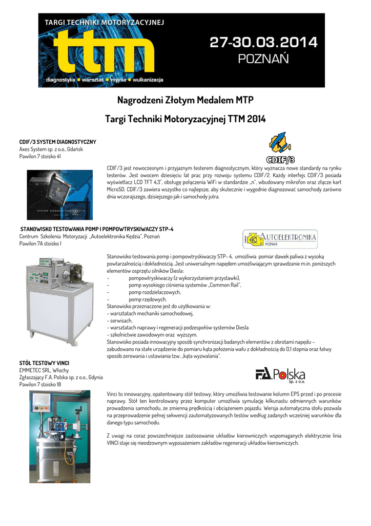 Nagrodzeni Złotym Medalem MTP Targi Techniki Motoryzacyjnej TTM 2014 CDIF/3 SYSTEM DIAGNOSTYCZNY Axes System sp. z o.o., Gdańsk Pawilon 7 stoisko 41 CDIF/3 jest nowoczesnym i przyjaznym testerem diagnostycznym, który wyznacza nowe standardy na rynku testerów. Jest owocem dziesięciu lat prac przy rozwoju systemu CDIF/2. Każdy interfejs CDIF/3 posiada wyświetlacz LCD TFT 4,3'', obsługę połączenia WiFi w standardzie „n”, wbudowany mikrofon oraz złącze kart MicroSD. CDIF/3 zawiera wszystko co najlepsze, aby skutecznie i wygodnie diagnozować samochody zarówno dnia wczorajszego, dzisiejszego jak i samochody jutra. STANOWISKO TESTOWANIA POMP I POMPOWTRYSKIWACZY STP-4 Centrum Szkolenia Motoryzacji „Autoelektronika Kędzia”, Poznań Pawilon 7A stoisko 1 Stanowisko testowania pomp i pompowtryskiwaczy STP- 4, umożliwia pomiar dawek paliwa z wysoką powtarzalnością i dokładnością. Jest uniwersalnym napędem umożliwiającym sprawdzanie m.in. poniższych elementów osprzętu silników Diesla: pompowtryskiwaczy (z wykorzystaniem przystawki), pomp wysokiego ciśnienia systemów „Common Rail”, pomp rozdzielaczowych, pomp rzędowych. Stanowisko przeznaczone jest do użytkowania w: - warsztatach mechaniki samochodowej, - serwisach, - warsztatach naprawy i regeneracji podzespołów systemów Diesla - szkolnictwie zawodowym oraz wyższym. Stanowisko posiada innowacyjny sposób synchronizacji badanych elementów z obrotami napędu – zabudowano na stałe urządzenie do pomiaru kąta położenia wału z dokładnością do 0,1 stopnia oraz łatwy sposób zerowania i ustawiania tzw. „kąta wyzwalania”. STÓŁ TESTOWY VINCI EMMETEC SRL, Włochy Zgłaszający F.A. Polska sp. z o.o., Gdynia Pawilon 7 stoisko 18 Vinci to innowacyjny, opatentowany stół testowy, który umożliwia testowanie kolumn EPS przed i po procesie naprawy. Stół ten kontrolowany przez komputer umożliwia symulację kilkunastu odmiennych warunków prowadzenia samochodu, ze zmienną prędkością i obciążeniem pojazdu. Wersja automatyczna stołu pozwala na przeprowadzenie pełnej sekwencji zautomatyzowanych testów według zadanych wcześniej warunków dla danego typu samochodu. Z uwagi na coraz powszechniejsze zastosowanie układów kierowniczych wspomaganych elektrycznie linia VINCI staje się nieodzownym wyposażeniem zakładów regeneracji układów kierowniczych. ELEKTRONICZNY TESTER USTAWIENIA REFLEKTORÓW Z SYSTEMEM KAMEROWYM TYP MLT 3000 MAHA Maschinenbau Haldenwang GmbH & CO.KG Zgłaszający: MAHA Polska Sp. z o.o., Tarnowskie Góry Pawilon 7A stoisko 9 Przyrząd do kontroli i regulacji reflektorów samochodowych MLT 3000 to krok w przyszłość w diagnostyce oświetlania samochodowego. Nowoczesne reflektory samochodowe wymagają coraz bardziej inteligentnych urządzeń kontrolnych, optyczny odczyt prawidłowego promienia reflektora nie jest już taki prosty. W tym celu firma MAHA stworzyła produkt, który wykluczy możliwość pomyłki, a pomiar i regulacja reflektorów stają się dziecinnie proste. Dzięki intuicyjnemu sterowaniu z poziomu wyświetlacza dotykowego MLT 3000 pozwala mierzyć WSZYSTKIE dostępne na rynku reflektory samochodowe. TACHODRIVE 4 MATT R.P. Trączyńscy sp.j. Kościan Pawilon 8A stoisko 5 TachoDrive4 to profesjonalne urządzenie nowej generacji, służące do pobierania, analizy i archiwizacji danych z tachografu cyfrowego oraz karty kierowcy. TachoDrive4 umożliwia pobranie danych z karty kierowcy (wbudowany czytnik kart) oraz z pamięci masowej tachografu. Pobrane dane można przeanalizować, a wyniki analizy wyświetlić na wbudowanym wyświetlaczu LCD lub wydrukować bezprzewodowo na drukarce. TD4 przeznaczony jest dla firmy transportowych, służby kontrolnych, serwisów tachografów. Program-AUTODATA ONLINE 3 Autodata Limited, Anglia Zgłaszający : Precyzja -Service, Bydgoszcz Pawilon 7A stoisko 11 Autodata Online jest najnowszym osiągnięciem komputerowej techniki warsztatowej adresowanym przede wszystkim do niezależnych warsztatów samochodowych. Autodata Online, dostarcza jeszcze więcej wszechstronnych informacji technicznych niż zebranych dotychczas na płytach CD czy DVD, przez co pozwala mechanikom, diagnostom, elektrykom i elektronikom samochodowym na dostęp do stale uaktualnianych danych zapewniając nieprzerwana możliwość korzystania z precyzyjnej i kompleksowej informacji. GEOTRUCK – KOMPUTEROWY PRZYRZĄD DO POMIARU GEOMETRII USTAWIENIA KÓŁ I OSI POJAZDU O DMC POWYŻEJ 3,5 T Precyzja –Technik sp. z o.o., Bydgoszcz Zgłaszający: Precyzja – Service, Bydgoszcz Pawilon 7A stoisko 11 GeoTruck - komputerowy przyrząd do pomiaru geometrii kół i osi różnych rodzajów pojazdów o DMC powyżej 3,5t, posiadających dowolną ilość osi jezdnych niekierowanych i kierowanych z kołami w zakresie średnic 14” ÷ 26”. Radiowa komunikacja między zespołami pomiarowymi i komputerem. Do pomiaru parametrów geometrii w płaszczyźnie poziomej wykorzystywane są dwie kamery CCD oraz sześć przetworników ultradźwiękowych a do pomiaru kątów pionowych oraz kątów skrętu kół – czujniki przyspieszeniowe. LAMPY DIODOWE ZESPOLONE TYLNE SERII „HAMBURGER” ( ULTRA –PŁASKIE) W91, W92, W93. W94, W95 Przetwórstwo Tworzyw Sztucznych ”WAŚ” Józef i Leszek Waś sp.j., Godzikowice Pawilon 8A stoisko 12 Seria nowych lamp W91-W95, to ultranowoczesne i ultra –płaskie lampy tylne zespolone, które mogą być montowane np. na naczepach, przyczepach czy lawetach. Grubość lampy bez pierścienia wynosi 25mm. Występują w dwóch wersjach: 3-światłowej (światło pozycyjne, hamowania i kierunku jazdy) oraz co jest ich ogromną zaletą, w wersji 5-śwatłowej gdzie wszystkie funkcje świetlne zintegrowane są w jednej lampie (światło pozycyjne , hamowania, kierunku jazdy, cofania i przeciwmgielne). ZESTAW NARZĘDZI DO TESTOWANIA SYSTEMÓW: DENOXTRONIC 1-0986610800, DENOXTRONIC 2-0986610450, DENOXTRONIC 3.1-0986610500 Robert Bosch GmbH 