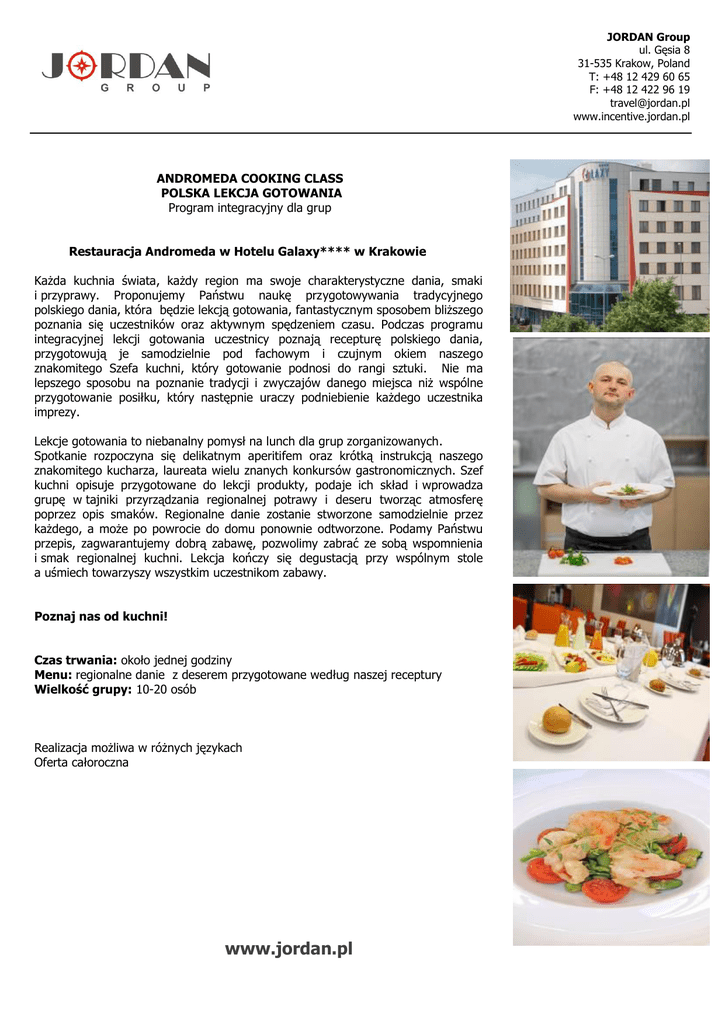 JORDAN Group ul. Gęsia 8 31-535 Krakow, Poland T: +48 12 429 60 65 F: +48 12 422 96 19 [email protected] www.incentive.jordan.pl ANDROMEDA COOKING CLASS POLSKA LEKCJA GOTOWANIA Program integracyjny dla grup Restauracja Andromeda w Hotelu Galaxy**** w Krakowie Każda kuchnia świata, każdy region ma swoje charakterystyczne dania, smaki i przyprawy. Proponujemy Państwu naukę przygotowywania tradycyjnego polskiego dania, która będzie lekcją gotowania, fantastycznym sposobem bliższego poznania się uczestników oraz aktywnym spędzeniem czasu. Podczas programu integracyjnej lekcji gotowania uczestnicy poznają recepturę polskiego dania, przygotowują je samodzielnie pod fachowym i czujnym okiem naszego znakomitego Szefa kuchni, który gotowanie podnosi do rangi sztuki. Nie ma lepszego sposobu na poznanie tradycji i zwyczajów danego miejsca niż wspólne przygotowanie posiłku, który następnie uraczy podniebienie każdego uczestnika imprezy. Lekcje gotowania to niebanalny pomysł na lunch dla grup zorganizowanych. Spotkanie rozpoczyna się delikatnym aperitifem oraz krótką instrukcją naszego znakomitego kucharza, laureata wielu znanych konkursów gastronomicznych. Szef kuchni opisuje przygotowane do lekcji produkty, podaje ich skład i wprowadza grupę w tajniki przyrządzania regionalnej potrawy i deseru tworząc atmosferę poprzez opis smaków. Regionalne danie zostanie stworzone samodzielnie przez każdego, a może po powrocie do domu ponownie odtworzone. Podamy Państwu przepis, zagwarantujemy dobrą zabawę, pozwolimy zabrać ze sobą wspomnienia i smak regionalnej kuchni. Lekcja kończy się degustacją przy wspólnym stole a uśmiech towarzyszy wszystkim uczestnikom zabawy. Poznaj nas od kuchni! Czas trwania: około jednej godziny Menu: regionalne danie z deserem przygotowane według naszej receptury Wielkość grupy: 10-20 osób Realizacja możliwa w różnych językach Oferta całoroczna www.jordan.pl