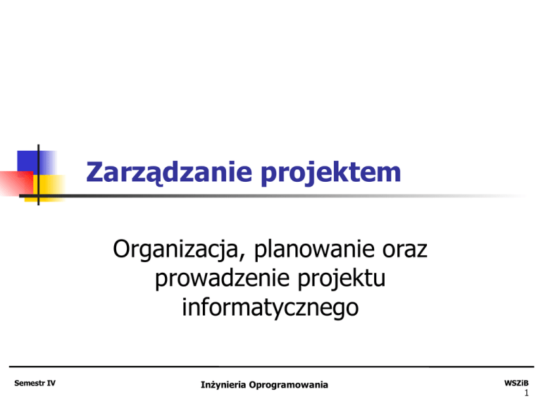 Zarządzanie projektem Organizacja, planowanie oraz prowadzenie projektu informatycznego Semestr IV Inżynieria Oprogramowania WSZiB 1 Zagadnienia Zadania związane z zarządzaniem Planowanie projektu Organizacja pracy Podział, planowanie pracy Zarządzanie zasobami Semestr IV Rodzaje planów projektowych Diagramy aktywności, wykorzystania zasobów Inżynieria Oprogramowania WSZiB 1 Znaczenie zarządzania Inżynieria oprogramowania jest aktywnością ekonomiczną i jako taka podlega ekonomicznym a więc pozatechnicznym ograniczeniom Dobre zarządzanie nie gwarantuje sukcesu projektu. Źle zarządzany projekt prawie zawsze kończy się niepowodzeniem Wiele nieudanych projektów w latach 60 i wczesnych 70 Rozwiązania dobre i sprawdzone dla małych projektów nie sprawdzają się przeważnie przy większych projektach Celem kursu jest prezentacja technik i dobrych praktyk zarządzania, nie podajemy dokładnego “przepisu” jak być dobrym kierownikiem tu konieczna jest praktyka ... Semestr IV Inżynieria Oprogramowania WSZiB 1 Zarządzanie projektem informatycznym Profesjonalne tworzenie oprogramowania ograniczeniom budżetowym i Zarządzanie realizacją projektu w sposób umożliwiający spełnienie wymagań Klienta przy równoczesnym zachowaniu określonych ograniczeń Proces tworzenia oprogramowania jest zgodny z polityką, celami i wymaganiami organizacji Zarządzanie ma na celu dostarczenie produktu Semestr IV podlega Zadania kierownika projektu ZAWSZE czasowym Na czas Zgodnie z planem kolejne etapy Zgodnie z wymaganiami Klienta organizacji tworzącej oprogramowanie Inżynieria Oprogramowania i standardami WSZiB 1 Cechy wyróżniające Produkt jest niematerialny Inżynieria oprogramowania nie jest dobrze opanowaną dyscypliną jak np. inżynieria mechaniczna czy budowlana Brak standaryzacji procesu tworzenia oprogramowania W zależności od typu produktu? Większość dużych projektów powstaje na zamówienie Semestr IV Jak monitorować postęp pracy? Brak doświadczeń z przeszłości prototyp Trudności w przewidywaniu problemów Inżynieria Oprogramowania WSZiB 1 Zarządzanie projektem – podstawowe zadania Przygotowanie oferty Wycena i kosztorysowanie projektu Planowanie i organizacja pracy Dobór personelu Wybór i zarządzanie podwykonawcami Monitorowanie oraz przeglądy Raportowanie stanu projektu Semestr IV Postęp prac w stosunku do planu Prezentacje, formalne, periodyczne raporty Inżynieria Oprogramowania WSZiB 1 Cechy wspólne Semestr IV Przedstawione zadania nie są charakterystyczne tylko dla projektów programistycznych Wiele technik równie dobrze stosuje się w innych dyscyplinach inżynierii Złożone techniczne systemy inżynieryjne napotykają podobne problemy jak systemy programistyczne Inżynieria Oprogramowania WSZiB 1 Podstawowe elementy oferty (1/2) Semestr IV Wstęp – referencje do innych dokumentów, słownik Przedmiot oferty Streszczenie dla kierownictwa Okres ważności oferty Zakres oferty – funkcjonalność systemu, wyłączenia, ograniczenia Sposób realizacji systemu – architektura, sprzęt i oprogramowani Realizacja oferty – procesy wytwórcze, zarządzanie jakością, zarządzanie zmianami Struktura zespołu Inżynieria Oprogramowania WSZiB 1 Podstawowe elementy oferty (2/2) Zasady współpracy – wspólna praca zespołów, wsparcie administracyjne, komitet sterujący Wstępny harmonogram realizacji projektu Wartość inwestycji – usługi, sprzęt, szkolenia Ogólne informacje o oferencie – podstawowe dane, dotychczasowe dokonania Warunki wsparcia technicznego Warunki przekazania systemu Oferta = wizerunek firmy Semestr IV Inżynieria Oprogramowania WSZiB 1 Dobór personelu Bardzo rzadko istnieje możliwość doboru “idealnego” personelu dla danego projektu Semestr IV Podstawowe ograniczenie: budżet nie pozwala na zatrudnienie wysoko kwalifikowanych a więc przeważnie drogich specjalistów Brak ludzi z odpowiednim doświadczeniem, często uczestnicy projektu nabywają doświadczenie w danej dziedzinie dopiero w czasie trwania projektu Brak “zgrania” zespołu - praca projektowa wprowadza dużą rotację osób (tymczasowość) Kierownik nie jest przeważnie przełożonym administracyjnym członków grupy projektowej Inżynieria Oprogramowania WSZiB 1 Formowanie zespołu projektowego Określenie struktury organizacyjnej projektu (role i udziałowcy, uprawnienia i odpowiedzialność) Utworzenie podstawowego składu zespołu z wewnątrz organizacji rekrutacja zewnętrzna Określenie zasad i reguł współpracy Określenie alternatyw dla poszczególnych ról w zespole Kontrola i utrzymanie zespołu (ewentualne zmiany w składzie zespołu) Semestr IV Inżynieria Oprogramowania WSZiB 1 Struktura organizacyjna Przykładowe role: Kierownik projektu Analityk Projektant/architekt Programista Tester Udziałowcy: Sponsor projektu Użytkownicy Grupa projektowa Semestr IV Inżynieria Oprogramowania WSZiB 1 Obowiązki Kierownika projektu względem grupy projektowej Motywowanie i Przydział zadań podtrzymywanie dobrego Ustalenie zasad pracy nastroju w zespole Obowiązki i przywileje (budowanie świadomości Zasady raportowania zespołowej) Komunikacja Rozwiązywanie konfliktów Szkolenia i zapewnienie możliwości zdobywanie niezbędnych umiejętności Ochrona członków zespołu (przepracowanie, “ataki” z zewnątrz) Zapewnienie miejsca pracy i niezbędnych narzędzi Semestr IV Inżynieria Oprogramowania WSZiB 1 Plan zarządzania personelem – obciążenie poszczególnych ról Obciążenie rólról ww projekcie Obci¹ ¿enie projekcie 50 45 Liczba osobo-dni 40 35 30 25 20 15 10 5 0 styczeñ luty marzec kwiecieñ Czas Semestr IV maj Programiœci Projektanci Testerzy Zapotrzebowanie dla poszczególnych ról wynika z podziału zadań i ograniczeń czasowych Plan zarządzania personelem wchodzi w skład ogólnego planu zarządzania projektem Zazwyczaj opiera się na uśrednionej mierze umiejętności członków grupy projektowej Inżynie