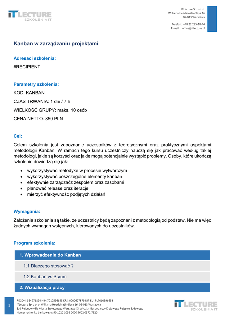 ITLecture Sp. z o. o. Williama HeerleinaLindleya 16 02-013 Warszawa Telefon: +48 22 295-18-44 E-mail: [email protected] Kanban w zarządzaniu projektami Adresaci szkolenia: #RECIPIENT Parametry szkolenia: KOD: KANBAN CZAS TRWANIA: 1 dni / 7 h WIELKOŚĆ GRUPY: maks. 10 osób CENA NETTO: 850 PLN Cel: Celem szkolenia jest zapoznanie uczestników z teoretycznymi oraz praktycznymi aspektami metodologii Kanban. W ramach tego kursu uczestniczy nauczą się jak pracować według takiej metodologi, jakie są korzyści oraz jakie mogą potencjalnie wystąpić problemy. Osoby, które ukończą szkolenie dowiedzą się jak: wykorzystywać metodykę w procesie wytwórczym wykorzystywać poszczególne elementy kanban efektywnie zarządzaćz zespołem oraz zasobami planować release oraz iteracje mierzyć efektywność podjętych działań Wymagania: Założenia szkolenia są takie, że uczestnicy będą zapoznani z metodologią od podstaw. Nie ma więc żadnych wymagań wstępnych, kierowanych do uczestników. Program szkolenia: 1. Wprowadzenie do Kanban 1.1 Dlaczego stosować ? 1.2 Kanban vs Scrum 2. Wizualizacja pracy 1 REGON: 364971894 NIP: 7010596653 KRS: 0000627879 NIP EU: PL7010596653 ITLecture Sp. z o. o. Williama HeerleinaLindleya 16, 02-013 Warszawa Sąd Rejonowy dla Miasta Stołecznego Warszawy XII Wydział Gospodarczy Krajowego Rejestru Sądowego Numer rachunku bankowego: 90 1020 1055 0000 9602 0372 7120 ITLecture Sp. z o. o. Williama HeerleinaLindleya 16 02-013 Warszawa Telefon: +48 22 295-18-44 E-mail: [email protected] 2.1. Ustalanie jasnych zasad 2.2. Tablica kanban 2.3. Kolejki 3. Pozycje zadań 3.1. Karty zadań 3.2. Typy pracy 3.3. Wskaźniki postępu 3.4. Rozmiar zadania 3.5. Zbieranie danych o przepływie 4. Praca cząstkowa 4.1. Zrozumieć pracę cząstkową 4.2. Efekty zbyt dużej ilości WIP 5. Ograniczanie pracy cząstkowej 5.1. Poszukiwanie limitów WIP 5.2. Zasady ustalania limitów 5.3. Ograniczanie WIP dla kolumn 6. Zarządzanie przepływem 6.1. Pomóż pracy płynąć 6.2. Codzienne spotkania 6.3. Zarządzanie wąskimi gardłami 7. Klasy usług 7.1. Czym jest klasa usług ? 7.2. Zarządzanie klasami usług 2 REGON: 364971894 NIP: 7010596653 KRS: 0000627879 NIP EU: PL7010596653 ITLecture Sp. z o. o. Williama HeerleinaLindleya 16, 02-013 Warszawa Sąd Rejonowy dla Miasta Stołecznego Warszawy XII Wydział Gospodarczy Krajowego Rejestru Sądowego Numer rachunku bankowego: 90 1020 1055 0000 9602 0372 7120 ITLecture Sp. z o. o. Williama HeerleinaLindleya 16 02-013 Warszawa Telefon: +48 22 295-18-44 E-mail: [email protected] 8. Planowanie i szacowanie 8.1. Harmonogramowanie planowania: kiedy powinieneś planować ? 8.2. Techniki szacowania prac 8.3. Planowanie z wykorzystaniem kanban 9. Ulepszanie procesu 9.1. Retrospektywy 9.2. Analiza źródła 9.3. Kanban kata 10. Wykorzystanie wskaźników do sprawdzania ulepszeń 10.1. Powszechne wskaźniki 10.2. Wskaźniki jako przewodnicy po ulepszeniach 11. Pułapki kanban 11.1. Nie samą pracą żyje człowiek 11.2. Ramy czasowe są pożyteczne 12. Nauka kanban poprzez gry 13. Dobre praktyki 3 REGON: 364971894 NIP: 7010596653 KRS: 0000627879 NIP EU: PL7010596653 ITLecture Sp. z o. o. Williama HeerleinaLindleya 16, 02-013 Warszawa Sąd Rejonowy dla Miasta Stołecznego Warszawy XII Wydział Gospodarczy Krajowego Rejestru Sądowego Numer rachunku bankowego: 90 1020 1055 0000 9602 0372 7120