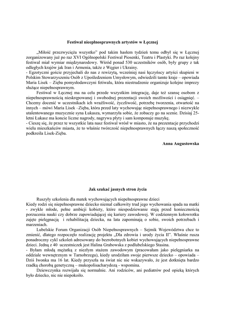 Festiwal nieepłnosprawnych artystów w Łęcznej „Miłość przezwycięŜa wszystko” pod takim hasłem tydzień temu odbył się w Łęcznej zorganizowany juŜ po raz XVI Ogólnopolski Festiwal Piosenki, Teatru i Plastyki. Po raz kolejny festiwal miał wymiar międzynarodowy. Wśród ponad 530 uczestników osób, były grupy z tak odległych krajów jak Iran i Armenia, takŜe z Węgier i Ukrainy. - Egzotyczni goście przyjechali do nas z rewizytą, wcześniej nasi łęczyńscy artyści skupieni w Polskim Stowarzyszeniu Osób z Upośledzeniem Umysłowym, odwiedzili tamte kraje – opowiada Maria Lisek – Zięba pomysłodawczyni fetiwalu, która niestrudzenie organizuje kolejne imprezy słuŜące niepełnosprawnym. Festiwal w Łęcznej ma na celu przede wszystkim integrację, daje teŜ szansę osobom z niepełnosprawnością nieskrępowanej i swobodnej prezentacji swoich moŜliwości i osiągnięć. – Chcemy docenić w uczestnikach ich wraŜliwość, Ŝyczliwość, potrzebę tworzenia, otwartość na innych – mówi Maria Lisek –Zięba, która przed laty wychowując niepełnosprawnego i niezwykle utalentowanego muzycznie syna Łukasza, wymarzyła sobie, Ŝe zobaczy go na scenie. Dzisiaj 25letni Łukasz ma koncie liczne nagrody, nagrywa płyty i sam komponuje muzykę. - Cieszę się, Ŝe przez te wszystkie lata nasz festiwal wrósł w miasto, Ŝe na prezentacje przychodzi wielu mieszkańców miasta, Ŝe to właśnie twórczość niepełnosprawnych łączy naszą społeczność podkreśla Lisek-Zięba. Anna Augustowska Jak szukać jasnych stron Ŝycia Ruszyły szkolenia dla matek wychowujących niepełnosprawne dzieci Kiedy rodzi się niepełnosprawne dziecko niemal całkowity trud jego wychowania spada na matki - zwykle młode, pełne ambicji kobiety, które niespodziewanie stają przed koniecznością porzucenia nauki czy dobrze zapowiadającej się kariery zawodowej. W codziennym kołowrotku zajęte pielęgnacją i rehabilitacją dziecka, na lata zapominają o sobie, swoich potrzebach i marzeniach. Lubelskie Forum Organizacji Osób Niepełnosprawnych – Sejmik Województwa chce to zmienić, dlatego rozpoczęło realizację projektu „Dla zdrowia i urody Ŝycia II”. Właśnie rusza ponadroczny cykl szkoleń adresowany do bezrobotnych kobiet wychowujących niepełnosprawne dzieci. Jedną z 40 uczestniczek jest Halina Grabowska z podlubelskiego Stasina. - Byłam młodą męŜatką z niezłym staŜem zawodowym (pracowałam jako pielęgniarka na oddziale wewnętrznym w Tarnobrzegu), kiedy urodziłam swoje pierwsze dziecko – opowiada – Dziś Iwonka ma 16 lat. Kiedy przyszła na świat nic nie wskazywało, Ŝe jest dotknięta bardzo rzadką chorobą genetyczną – mukopolisacharydozą - wspomina. Dziewczynka rozwijała się normalnie. Ani rodziców, ani pediatrów pod opieką których było dziecko, nic nie niepokoiło. Grabowscy zamieszkali pod Lublinem. – Dostałam etat w szpitalu przy al. Kraśnickiej w Lublinie. Wkrótce urodziła się Monika. Zdecydowałam się na urlop wychowawczy. Była połowa lat 90-siątych. Nagle pozornie harmonijny rozwój dziewczynek zaczął budzić niepokój rodziców. - Były strasznie ruchliwe. DraŜliwe. Nie dawały się utulić, uspokoić. Zaczęły się wędrówki po lekarzach i psychologach. Ciągle słyszałam, Ŝe to nadpobudliwość, Ŝe ADHD. Nie dawały sobie rady w szkole, musiałam zgodzić się na nauczanie indywidualne, w domu – opowiada Halina Grabowska. Prawidłową diagnozę postawiono dopiero kiedy kilka lat temu dziewczynki trafiły do Centrum Zdrowia Dziecka. - Świat mi się zawalił. Mukopolisacharydoza typ III – to brzmiało jak wyrok: choroba bez szans na wyleczenie, bez szans nawet na zatrzymanie postępującej, degradującej organizm choroby. Musiałam się zająć dziewczynkami, ich stan z kaŜdym rokiem się pogarsza. JuŜ nie mówią, nie sygnalizują potrzeb fizjologicznych, nie potrafią same jeść. Z czasem przestaną chodzić, dla Iwonki juŜ w zasadzie trzeba myśleć o wózku inwalidzki – opowiada Grabowska. Takich dzieci nie moŜna zostawić samych. W wyjątkowych sytuacjach pomagali sąsiedzi, zawsze Ŝyczliwie nastawieni, nie odmawiający pomocy. Jednak o powrocie do pracy nie było mowy. Dziewczynki potrzebowały stałej opieki. Sytuacja zmieniła się zaledwie kilka tygodni temu, we wrześniu. – Obie zostały przyjęte do ośrodka dla dzieci niepełnosprawnych w Matczynie. Dla mnie to niesamowite bo nagle mam osiem godzin dla siebie, nie przewijam, nie karmię, nie pilnuję. A przy tym wiem, Ŝe moje córeczki mają w tym czasie zajęcia z reedukacji, są w grupie rówieśników, wśród innych ludzi. Uczestniczą w rehabilitacji. To wielka ulga, bo one całe Ŝycie spędziły w domu! - Zaczęłam myśleć co robić z tym czasem. Tak się złoŜyło, Ŝe usłyszałam o szkoleniu przygotowanym dla kobiet takich jak ja. Postanowiłam spróbować. Mam 42 lata i sporo do nadrobienia. Po pierwsze chciałabym nauczyć się obsługi komputera – juŜ trochę ćwiczę wieczorami i zrobić prawo jazdy a potem jak się wszystko ułoŜy skończyć kurs z rachunkowości, moŜe księgowości – w głosie Haliny Grabowskiej słychać ukrytą radość. – Do pielęgniarstwa juŜ nie wrócę. Zbyt długo jestem poza zawodem. Chciałabym zacząć coś całkiem nowego – podkreśla. – Jeśli zdobędę nowe kwalifikacje mam szansę wypracować sobie emeryturę, poza tym ciągle rosną wydatki na dziewczynki. Leki wspomagające i pampersy to duŜy wydatek. Zasiłek juŜ nie wystarcza. - Myślę, Ŝe spotkam tam przyjaciół. Potrzebuję kontaktu z innymi, wsparcia. Mam obawy czy podołam ale wiem, Ŝe nie naleŜy się nigdy poddawać i uśmiechać się mimo róŜnych przeciwności. Zawsze szukać jasnej strony Ŝycia. Drunt to się nie poddawać - mówi. Anna Augustowska Szansa Do projektu „Dla zdrowia i urody Ŝycia”, który jest współfinansowany z EFS w ramach Programu Operacyjnego Kapitał Ludzki z