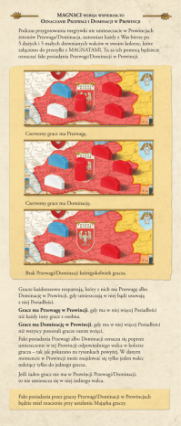 MAGNACI WERSJA WSPIERAM.TO OZNACZANIE PRZEWAGI I DOMINACJI W PROWINCJI Podczas przygotowania rozgrywki nie umieszczacie w Prowincjach żetonów Przewaga/Dominacja, natomiast każdy z Was bierze po 5 dużych i 5 małych drewnianych walców w swoim kolorze, które załączono do przesyłki z MAGNATAMI. To za ich pomocą będziecie oznaczać fakt posiadania Przewagi/Dominacji w Prowincji. Czerwony gracz ma Przewagę. Czerwony gracz ma Dominację. Brak Przewagi/Dominacji któregokolwiek gracza. Gracze każdorazowo rozpatrują, który z nich ma Przewagę albo Dominację w Prowincji, gdy umieszczają w niej bądź usuwają z niej Posiadłości. Gracz ma Przewagę w Prowincji, gdy ma w niej więcej Posiadłości niż każdy inny gracz z osobna. Gracz ma Dominację w Prowincji, gdy ma w niej więcej Posiadłości niż wszyscy pozostali gracze razem wzięci. Fakt posiadania Przewagi albo Dominacji oznacza się poprzez umieszczenie w tej Prowincji odpowiedniego walca w kolorze gracza – tak jak pokazano na rysunkach powyżej. W danym momencie w Prowincji może znajdować się tylko jeden walec należący tylko do jednego gracza. Jeśli żaden gracz nie ma w Prowincji Przewagi/Dominacji, to nie umieszcza się w niej żadnego walca. Fakt posiadania przez graczy Przewagi/Dominacji w Prowincjach będzie miał znaczenie przy ustalaniu Majątku graczy.
