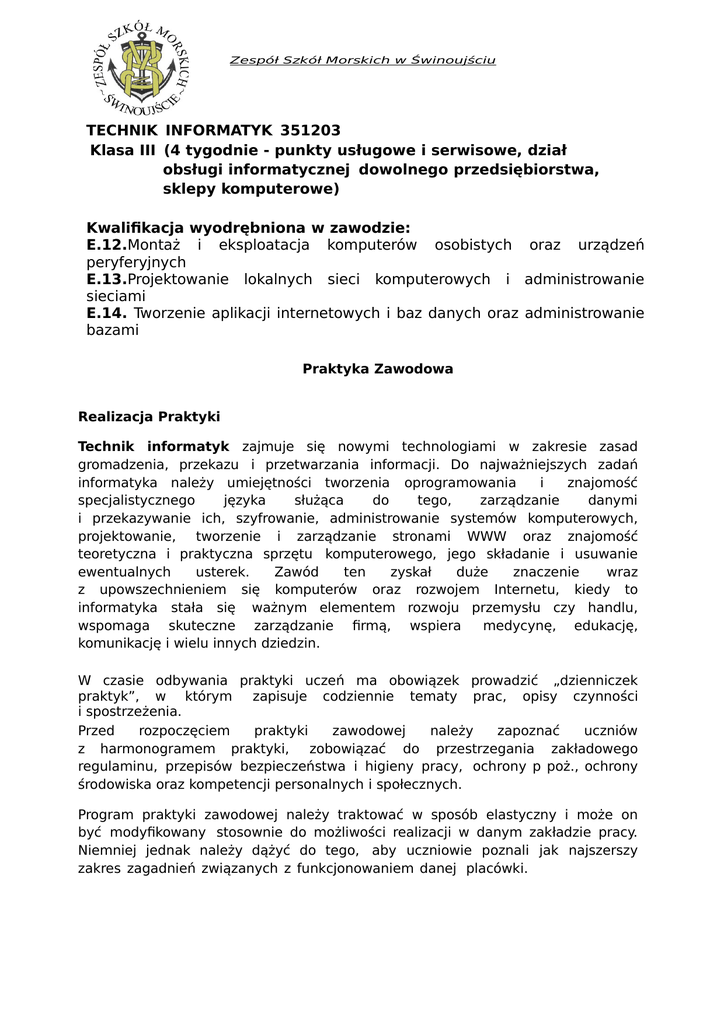 Zespół Szkół Morskich w Świnoujściu TECHNIK INFORMATYK 351203 Klasa III (4 tygodnie - punkty usługowe i serwisowe, dział obsługi informatycznej dowolnego przedsiębiorstwa, sklepy komputerowe) Kwalifikacja wyodrębniona w zawodzie: E.12.Montaż i eksploatacja komputerów osobistych oraz urządzeń peryferyjnych E.13.Projektowanie lokalnych sieci komputerowych i administrowanie sieciami E.14. Tworzenie aplikacji internetowych i baz danych oraz administrowanie bazami Praktyka Zawodowa Realizacja Praktyki Technik informatyk zajmuje się nowymi technologiami w zakresie zasad gromadzenia, przekazu i przetwarzania informacji. Do najważniejszych zadań informatyka należy umiejętności tworzenia oprogramowania i znajomość specjalistycznego języka służąca do tego, zarządzanie danymi i przekazywanie ich, szyfrowanie, administrowanie systemów komputerowych, projektowanie, tworzenie i zarządzanie stronami WWW oraz znajomość teoretyczna i praktyczna sprzętu komputerowego, jego składanie i usuwanie ewentualnych usterek. Zawód ten zyskał duże znaczenie wraz z upowszechnieniem się komputerów oraz rozwojem Internetu, kiedy to informatyka stała się ważnym elementem rozwoju przemysłu czy handlu, wspomaga skuteczne zarządzanie firmą, wspiera medycynę, edukację, komunikację i wielu innych dziedzin. W czasie odbywania praktyki uczeń ma obowiązek prowadzić „dzienniczek praktyk”, w którym zapisuje codziennie tematy prac, opisy czynności i spostrzeżenia. Przed rozpoczęciem praktyki zawodowej należy zapoznać uczniów z harmonogramem praktyki, zobowiązać do przestrzegania zakładowego regulaminu, przepisów bezpieczeństwa i higieny pracy, ochrony p poż., ochrony środowiska oraz kompetencji personalnych i społecznych. Program praktyki zawodowej należy traktować w sposób elastyczny i może on być modyfikowany stosownie do możliwości realizacji w danym zakładzie pracy. Niemniej jednak należy dążyć do tego, aby uczniowie poznali jak najszerszy zakres zagadnień związanych z funkcjonowaniem danej placówki. Zespół Szkół Morskich w Świnoujściu Program praktyk: 1. Bezpieczeństwo i organizacja pracy (BHP) 2. Umiejętności stanowiące podbudowę do kształcenia w zawodach: technik informatyk, technik tyfloinformatyk, technik teleinformatyk (PKZ) 3. Organizacja pracy małych zespołów (OMZ) 4. Język obcy ukierunkowany zawodowo (JOZ) USZCZEGÓŁOWIONE EFEKTY KSZTAŁCENIA DLA ZAWODU TECHNIK INFORMATYK: Uczeń po realizacji praktyki potrafi: BHP- zorganizować stanowisko montażowe zgodnie z obowiązującymi wymaganiami ergonomii, przepisami bezpieczeństwa i higieny pracy, ochrony przeciwpożarowej i ochrony środowiska; BHP- stosować środki ochrony indywidualnej i zbiorowej podczas wykonywania prac montażowych i instalacyjnych; BHP- przestrzegać wszystkich zasad bezpieczeństwa i higieny pracy oraz przepisów ochrony przeciwpożarowej podczas wykonywania prac montażowych i instalacyjnych; BHP- przestrzegać zasad ochrony środowiska podczas wykonywania prac montażowych i instalacyjnych; PKZ- zidentyfikować symbole graficzne podzespołów systemu komputerowego; PKZ- zidentyfikować oznaczenia podzespołów systemu komputerowego; PKZ- zanalizować oznaczenia podzespołów systemu komputerowego; PKZ- zidentyfikować podstawowe parametry techniczne elementów systemu komputerowego; PKZ- rozróżnić parametry sprzętu komputerowego; PKZ- użyć publikacji dokumentacji technicznej w formie elektronicznej; OMZ- ocenić jakość wykonania przydzielonych zadań; OMZ- planować pracę zespołu w celu wykonania przydzielonych zadań; OMZ- wprowadzić rozwiązania techniczne i organizacyjne wpływające na poprawę warunków i jakość pracy. OMZ- dobrać oprogramowanie użytkowe do realizacji określonych zadań w konfiguracji i monitoringu sieciowego; OMZ- zastosować metody zabezpieczenia sprzętu komputerowego pracującego w sieci; OMZ- zabezpieczyć dostęp do systemu operacyjnego komputerów pracujących w sieci; OMZ- rozróżniać rodzaje oprogramowania użytkowego; OMZ- scharakteryzować rodzaje oprogramowania użytkowego przy administrowaniu sieciowymi systemami operacyjnymi; OMZ- stosować różne rodzaje oprogramowania użytkowego do administrowania sieciowymi systemami operacyjnymi; Zespół Szkół Morskich w Świnoujściu JOZ- posłużyć się językiem angielskim w zakresie wspomagającym wykonywane zadań zawodowych technika informatyka z zastosowaniem poprawnej terminologii; E.12. zanalizować dokumentację techniczną informatycznych systemów komputerowych; E.12. zinterpretować zapisy zawarte w dokumentacji informatycznych systemów komputerowych; E.12. zaplanować kolejność prac montażowych; E.12. dobrać narzędzia i urządzenia do określonych czynności monterskich; E.12. dobrać podzespoły komputerowe według zaplanowanej konfiguracji; E.12. wykonać montaż zestawu komputerowego zgodnie z zaplanowaną konfiguracją; E.12. wykonać konfigurację BIOS SETUP; E.12. sporządzić dokumentacje rejestracyjną i sprawozdawczą dotyczącą obrotu zużytym sprzętem elektrycznym i elektronicznym; E.12. zainstalować różne systemy operacyjne; E.12. zaktualizować system operacyjny; E.12. użyć symboli wieloznacznych w poleceniach; E.12. stworzyć proste pliki wsadowe; E.12. zainstalować sterowniki różnych urządzeń; E.12. skonfigurować sterowniki urządzeń; E.12. dobrać elementy systemu operacyjnego; E.12. zmienić wygląd elementów systemu operacyjnego. E.12. zmontować lub przygotować do pracy urządzenie peryferyjne według dokumentacji produktu; E.12. połączyć urządzenie peryferyjne z komputerem osobistym za pomocą określonego interfejsu; E.12. dobrać odpowiedni sterownik do określonego urządzenia peryferyjnego; E.12. zainstalować sterownik dla określonego urządzenia peryferyjnego; E.12. wymienić materiały eksploatacyjne w różnych urządzeniach peryferyjnych; E.12. sporządzać dokumentację przekazy
