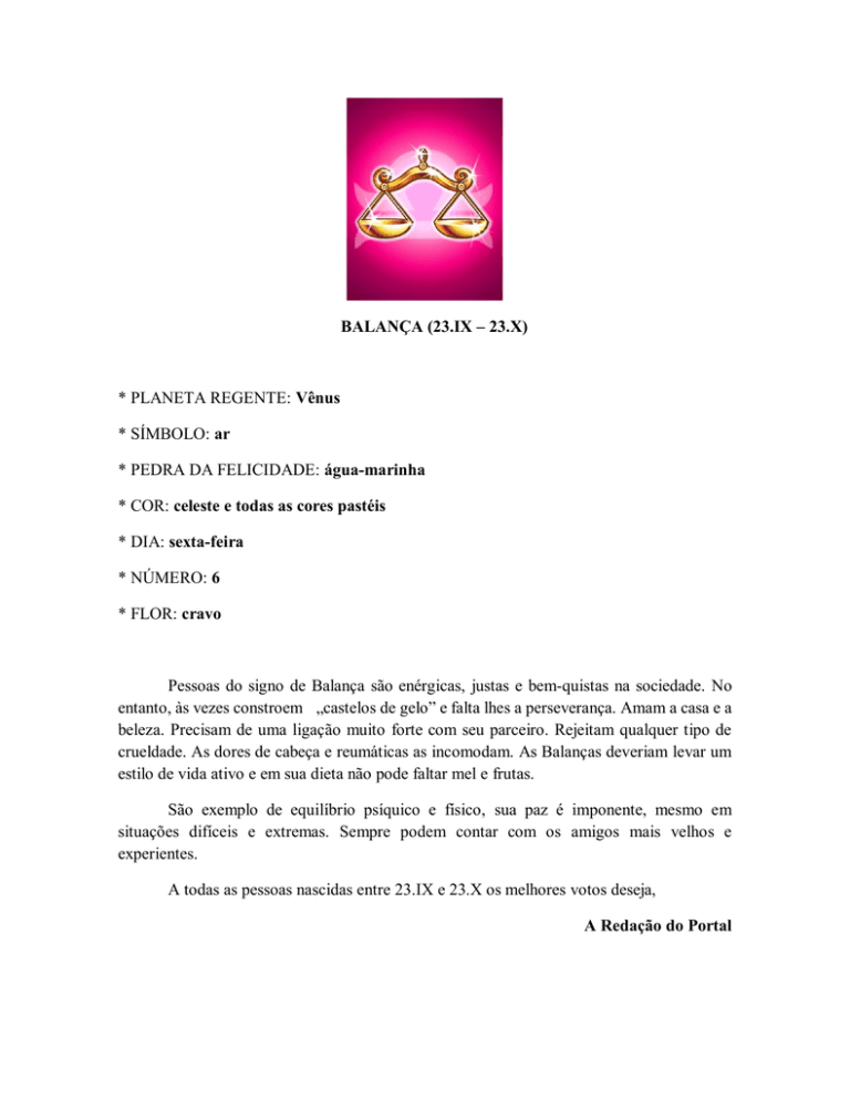 BALANÇA (23.IX – 23.X) * PLANETA REGENTE: Vênus * SÍMBOLO: ar * PEDRA DA FELICIDADE: água-marinha * COR: celeste e todas as cores pastéis * DIA: sexta-feira * NÚMERO: 6 * FLOR: cravo Pessoas do signo de Balança são enérgicas, justas e bem-quistas na sociedade. No entanto, às vezes constroem „castelos de gelo” e falta lhes a perseverança. Amam a casa e a beleza. Precisam de uma ligação muito forte com seu parceiro. Rejeitam qualquer tipo de crueldade. As dores de cabeça e reumáticas as incomodam. As Balanças deveriam levar um estilo de vida ativo e em sua dieta não pode faltar mel e frutas. São exemplo de equilíbrio psíquico e físico, sua paz é imponente, mesmo em situações difíceis e extremas. Sempre podem contar com os amigos mais velhos e experientes. A todas as pessoas nascidas entre 23.IX e 23.X os melhores votos deseja, A Redação do Portal Waga 23.IX - 23.X * PANUJĄCA PLANETA: Wenus * ZNAK POWIETRZNY * SZCZĘŚLIWY KLEJNOT : akwamaryn * KOLOR: błękitny i wszystkie kolory pastelowe * DZIEŃ: piątek * LICZBA: 6 * KWIAT: goździk Osoby spod znaku wagi są energiczne, sprawiedliwe i lubiane w towarzystwie. Czasami jednak budują „zamki na lodzie” i brak im wytrwałości. Kochają dom i piękno. Potrzebują szczególnie mocnej więzi ze swoim partnerem. Odrzucają wszelkie okrucieństwo. Dokuczają im migreny i bóle reumatyczne. Wagi powinny prowadzić aktywny styl życia a w ich diecie nie może zabraknąć miodu i owoców. Są wzorem równowagi psychicznej i fizycznej, imponują spokojem - nawet w trudnych i skrajnych sytuacjach. Zawsze mogą liczyć na starych, sprawdzonych przyjaciół. Wszystkim Wagom najserdeczniejsze życzenia urodzinowe składa Redakcja.