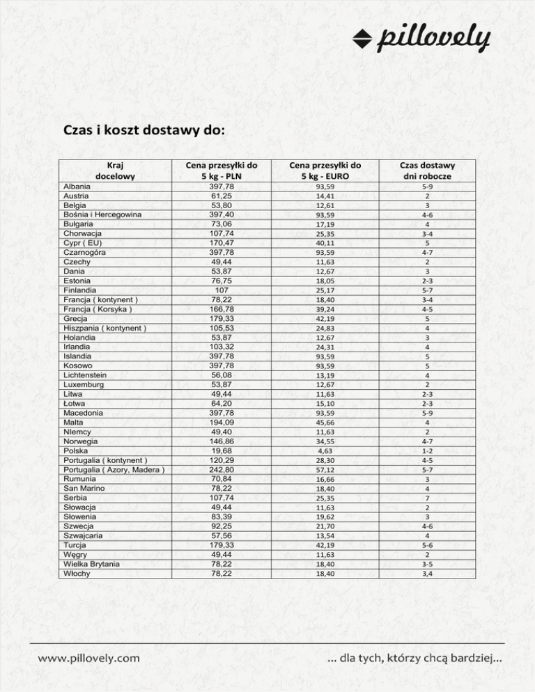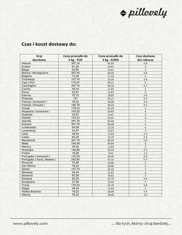 Czas i koszt dostawy do: Kraj docelowy Cena przesyłki do 5 kg - PLN Cena przesyłki do 5 kg - EURO Czas dostawy dni robocze Albania Austria Belgia Bośnia i Hercegowina Bułgaria Chorwacja Cypr ( EU) Czarnogóra Czechy Dania Estonia Finlandia Francja ( kontynent ) Francja ( Korsyka ) Grecja Hiszpania ( kontynent ) Holandia Irlandia Islandia Kosowo Lichtenstein Luxemburg Litwa Łotwa Macedonia Malta NIemcy Norwegia Polska Portugalia ( kontynent ) Portugalia ( Azory, Madera ) Rumunia San Marino Serbia Słowacja Słowenia Szwecja Szwajcaria Turcja Węgry Wielka Brytania Włochy 397,78 61,25 53,80 397,40 73,06 107,74 170,47 397,78 49,44 53,87 76,75 107 78,22 166,78 179,33 105,53 53,87 103,32 397,78 397,78 56,08 53,87 49,44 64,20 397,78 194,09 49,40 146,86 19,68 120,29 242,80 70,84 78,22 107,74 49,44 83,39 92,25 57,56 179,33 49,44 78,22 78,22 93,59 14,41 12,61 93,59 17,19 25,35 40,11 93,59 11,63 12,67 18,05 25,17 18,40 39,24 42,19 24,83 12,67 24,31 93,59 93,59 13,19 12,67 11,63 15,10 93,59 45,66 11,63 34,55 4,63 28,30 57,12 16,66 18,40 25,35 11,63 19,62 21,70 13,54 42,19 11,63 18,40 18,40 5-9 2 3 4-6 4 3-4 5 4-7 2 3 2-3 5-7 3-4 4-5 5 4 3 4 5 5 4 2 2-3 2-3 5-9 4 2 4-7 1-2 4-5 5-7 3 4 7 2 3 4-6 4 5-6 2 3-5 3,4