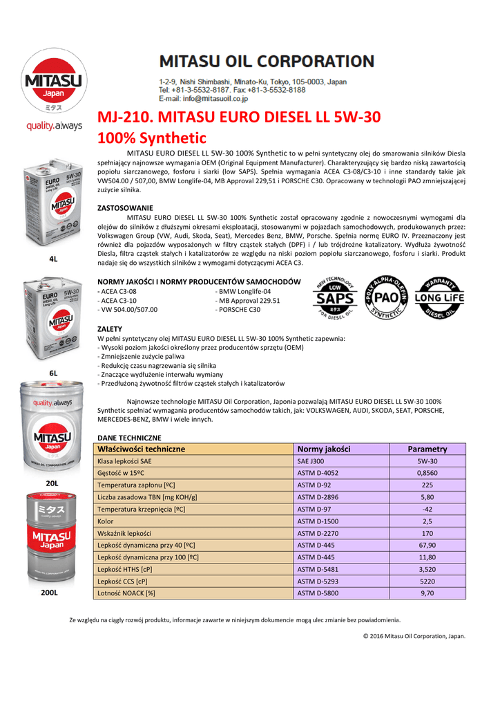 MJ-210. MITASU EURO DIESEL LL 5W-30 100% Synthetic MITASU EURO DIESEL LL 5W-30 100% Synthetic to w pełni syntetyczny olej do smarowania silników Diesla spełniający najnowsze wymagania OEM (Original Equipment Manufacturer). Charakteryzujący się bardzo niską zawartością popiołu siarczanowego, fosforu i siarki (low SAPS). Spełnia wymagania ACEA C3-08/C3-10 i inne standardy takie jak VW504.00 / 507,00, BMW Longlife-04, MB Approval 229,51 i PORSСHE C30. Opracowany w technologii PAO zmniejszającej zużycie silnika. ZASTOSOWANIE MITASU EURO DIESEL LL 5W-30 100% Synthetic został opracowany zgodnie z nowoczesnymi wymogami dla olejów do silników z dłuższymi okresami eksploatacji, stosowanymi w pojazdach samochodowych, produkowanych przez: Volkswagen Group (VW, Audi, Skoda, Seat), Mercedes Benz, BMW, Porsche. Spełnia normę EURO IV. Przeznaczony jest również dla pojazdów wyposażonych w filtry cząstek stałych (DPF) i / lub trójdrożne katalizatory. Wydłuża żywotność Diesla, filtra cząstek stałych i katalizatorów ze względu na niski poziom popiołu siarczanowego, fosforu i siarki. Produkt nadaje się do wszystkich silników z wymogami dotyczącymi ACEA C3. NORMY JAKOŚCI I NORMY PRODUCENTÓW SAMOCHODÓW - ACEA C3-08 - ACEA C3-10 - VW 504.00/507.00 - BMW Longlife-04 - MB Approval 229.51 - PORSCHE C30 ZALETY W pełni syntetyczny olej MITASU EURO DIESEL LL 5W-30 100% Synthetic zapewnia: - Wysoki poziom jakości określony przez producentów sprzętu (OEM) - Zmniejszenie zużycie paliwa - Redukcję czasu nagrzewania się silnika - Znaczące wydłużenie interwału wymiany - Przedłużoną żywotność filtrów cząstek stałych i katalizatorów Najnowsze technologie MITASU Oil Corporation, Japonia pozwalają MITASU EURO DIESEL LL 5W-30 100% Synthetic spełniać wymagania producentów samochodów takich, jak: VOLKSWAGEN, AUDI, SKODA, SEAT, PORSCHE, MERCEDES-BENZ, BMW i wiele innych. DANE TECHNICZNE Właściwości techniczne Normy jakości Klasa lepkości SAE SAE J300 Parametry 5W-30 Gęstość w 15ºC ASTM D-4052 0,8560 Temperatura zapłonu [ºC] ASTM D-92 225 Liczba zasadowa TBN [mg KOH/g] ASTM D-2896 5,80 Temperatura krzepnięcia [ºC] ASTM D-97 -42 Kolor ASTM D-1500 2,5 Wskaźnik lepkości ASTM D-2270 170 Lepkość dynamiczna przy 40 [ºC] ASTM D-445 67,90 Lepkość dynamiczna przy 100 [ºC] ASTM D-445 11,80 Lepkość HTHS [cP] ASTM D-5481 3,520 Lepkość CCS [cP] ASTM D-5293 5220 Lotność NOACK [%] ASTM D-5800 9,70 Ze względu na ciągły rozwój produktu, informacje zawarte w niniejszym dokumencie mogą ulec zmianie bez powiadomienia. © 2016 Mitasu Oil Corporation, Japan.