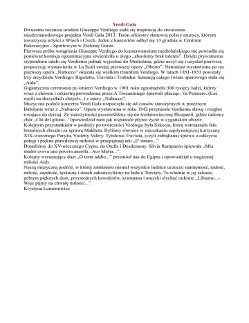 Verdi Gala Dwusetna rocznica urodzin Giuseppe Verdiego stała się inspiracją do stworzenia międzynarodowego projektu Verdi Gala 2013. Trzon orkiestry stanowią polscy muzycy, którym towarzyszą artyści z Włoch i Czech. Jeden z koncertów odbył się 13 grudnia w Centrum Rekreacyjno - Sportowym w Zielonej Górze. Pierwsza próba wstąpienia Giuseppe Verdiego do konserwatorium mediolańskiego nie powiodła się ponieważ komisja egzaminacyjna stwierdziła u niego „absolutny brak talentu”. Dzięki prywatnemu stypendium udało się Verdiemu jednak wyjechać do Mediolanu, gdzie uczył się i uzyskał pierwszą propozycję wystawienia w La Scali swojej pierwszej opery „Oberto”. Natomiast wystawiona po raz pierwszy opera „Nabucco” okazała się wielkim triumfem Verdiego. W latach 1851-1853 powstały trzy arcydzieła Verdiego: Rigoletto, Traviata i Trubadur. Sensacją całego świata operowego stała się „Aida”. Gigantyczna ceremonia po śmierci Verdiego w 1901 roku zgromadziła 300 tysięcy ludzi, którzy wraz z chórem i orkiestrą prowadzoną przez A.Toscaniniego śpiewali płacząc: Va Pensiero..(Leć myśli na skrzydłach złotych...) z opery „Nabucco”. Muzyczna podróż koncertu Verdi Gala rozpoczęła się od czasów starożytnych w potężnym Babilonie wraz z „Nabucco”. Opera wystawiona w roku 1842 przyniosła Verdiemu sławę i rozgłos trwające do dzisiaj. Ze starożytności przenieśliśmy się do średniowiecznej Hiszpanii, gdzie radosny chór „Chi del gitano...”opowiedział nam jak wspaniale płynie życie w cygańskim obozie. Kolejnym przystankiem w podróży po twórczości Verdiego była Szkocja, którą wstrząsnęła fala brutalnych zbrodni za sprawą Makbeta. Byliśmy również w mieszkaniu najsłynniejszej kurtyzany XIX-wiecznego Paryża, Violetty Valery. Tytułowa Traviata, (czyli zabłąkana) śpiewa o odkryciu potegi i piękna prawdziwej miłości w przepięknej arii „E' strano...” Dotarliśmy do XV-wiecznego Cypru, do Otella i Desdemony. Silvia Rampazzo śpiewała „Mia madre aveva una povera ancella...Ave Maria...”. Kolejny wzruszający duet „O terra addio...” przeniósł nas do Egiptu i opowiedział o tragicznej miłości Aidy. Naszą muzyczną podróż, w której zamknięto niemal wszystkie ludzkie uczucia: namiętność, radość, miłość, zazdrość, tęsknotę i strach zakończyliśmy na balu u Traviaty. To właśnie w jej salonie, pełnym pięknych dam, przystojnych kawalerów, szampana i muzyki słychać radosne „Libiamo...Więc pijmy na chwałę miłości...”. Krystyna Łomonowicz