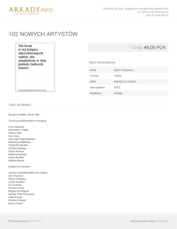 Dobra28 sp zoo. księgarnia wysyłkowa arkady.info ul. Dobra 28, Warszawa +48 22 444 86 97 102 NOWYCH ARTYSTÓW Cena: 49,00 PLN Opis słownikowy Autor Gavin Francesca Format 19x29 ISBN 978-83-213-4755-4 Rok wydania 2012 Wydawca Arkady Opis produktu Oprawa miękka, Stron 336 Twórcy przedstawieni w książce: Futo Akiyoshi Alterazioni Video Özlem Altin Dan Arps Lea Asja Pagenkemper Mahmoud Bakhshi Charlotte Becket Andres Bedoya Steve Bishop Melanie Bonajo Harry Burden Nadine Byrne Guillermo Caivano Jacobo CastellanoMarcos Castro Ajit Chauhan Paolo Chiasera Louie Cordero Eli Cortinas Rosson Crow Regina de Miguel Gardar Eide Einarsson Lilah Fowler Etsuko Fukaya Nuria Fuster Plik wygenerowano: 03-03-2017 Oprogramowanie sklepu: AptusShop Dobra28 sp zoo. księgarnia wysyłkowa arkady.info ul. Dobra 28, Warszawa +48 22 444 86 97 Geraldine Gliubislavich Sayre Gomez Plik wygenerowano: 03-03-2017 Powered by TCPDF (www.tcpdf.org) Oprogramowanie sklepu: AptusShop