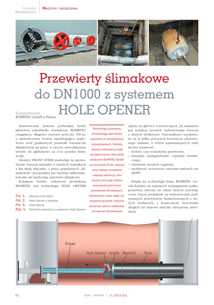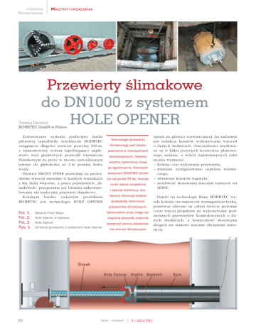 Inżynieria Bezwykopowa MASZYNY I URZĄDZENIA Przewierty ślimakowe do DN1000 z systemem HOLE OPENER Tomasz Derwich BOHRTEC GmbH w Polsce Zastosowanie systemu podwójnej żerdzi pilotowej umożliwiło wiertnicom BOHRTEC osiągnięcie długości wierceń powyżej 100 m, a opatentowany system zapobiegający napływowi wód gruntowych pozwolił wiertnicom ślimakowym na pracę w mocno nawodnionym terenie do głębokości aż 3 m poniżej lustra wody. Głowice FRONT STEER pozwalają na prowadzenie wierceń niemalże w każdych warunkach z litą skałą włącznie, a praca popularnych „ślimakówek” przypomina już bardziej mikrotunelowanie niż tradycyjny przewiert ślimakowy. Kolejnym bardzo ciekawym produktem BOHRTEC jest technologia HOLE OPENER Technologia przewiertu ślimakowego jest bardzo popularna w rozwiązaniach bezwykopowych. Niestety wszyscy wykonawcy znają jej ograniczenia. Niemiecki producent BOHRTEC GmbH już od ponad 25 lat, tworząc coraz lepsze urządzenia i osprzęt wiertniczy, skutecznie eliminuje kolejne przeszkody techniczne przewiertów ślimakowych. Fot. 1. Fot. 2. Fot. 3. Rys. 1. 60 Głowice Front Steer Hole Opener w wykopie Hole Opener Schemat przewiertu z systemem Hole Opener Opracowane przez niego rozwiązania pozwoliły znacznie poszerzyć zakres zastosowania wierceń ślimakowych lipiec - wrzesień 3 / 2013 [51] oparta na głowicy rozwiercającej. Jej zadaniem jest redukcja kosztów wykonywania wierceń o dużych średnicach. Oszczędności uzyskiwane są w kilku pozycjach kosztorysu planowanego zadania, a wśród najistotniejszych zalet można wymienić: – krótszy czas wykonania przewiertu, – mniejsze zaangażowanie osprzętu wiertniczego, – obniżenie kosztów logistyki, – możliwość stosowania znacznie tańszych rur HDPE. Dzięki tej technologii firma BOHRTEC wyszła kolejny raz naprzeciw wymaganiom rynku, ponieważ obecnie na całym świecie powstaje coraz więcej projektów na wykonywanie podziemnych przewiertów kontrolowanych o dużych średnicach, a konieczność stosowania drogich rur stanowi znaczne obciążenie inwestycji. MASZYNY I URZĄDZENIA Głowica HOLE OPENER umożliwia stosunkowo niewielkim kosztem z milimetrową dokładnością układanie rur z tworzyw sztucznych w trudnych, mocno zakamienionych gruntach, dlatego z powodzeniem konkuruje z technologią przewiertu sterowanego HDD i przewiertami mikrotunelowymi. Proces wiercenia odbywa się w kilku etapach. Po precyzyjnym ustawieniu urządzenia wykonywany jest przewiert pilotowy, a następnie jest on rozwiercany specjalnym zestawem wiercącym. Pierwszy etap przewiertu jest podobny do tradycyjnych wierceń ślimakowych z tą jednak różnicą, iż przewiert pilotowy BOHRTEC wykonywany jest przy zastosowaniu podwójnej żerdzi pilotowej i w razie potrzeby używa się również grodzi zabezpieczającej napływ wód gruntowych. Urobek odprowadzany jest na zewnątrz do studni startowej dzięki ślimakom. Po przeciągnięciu ślimaka w studni docelowej instalowana jest głowica HOLE OPENER, która rozwierca otwór na wymaganą średnicę. Bezpośrednio za głowicą wciągana jest rura z tworzywa. Dla zmniejszenia tarcia i stabilizacji gruntu instalowany przewód smarowany jest bentonitem. Standardowa wiertnica ślimakowa wyposażona w system HOLE OPENER może wykonywać przewierty o średnicy DN1000 w dowolnym gruncie, wykorzystując przy tym siły sięgające 100 t. HOLE OPENER to kompletny samodzielny system kompatybilny z wiertnicami ślimakowymi innych producentów, średnice i adaptery firma BOHRTEC wykonuje wg indywidualnych potrzeb każdego zainteresowanego. lipiec - wrzesień Fot. 4. Rys. 2. Inżynieria Bezwykopowa Głowica HoleOpener 590 Przekrój wiertnicy Bohrtec BM 400 3 / 2013 [51] 61