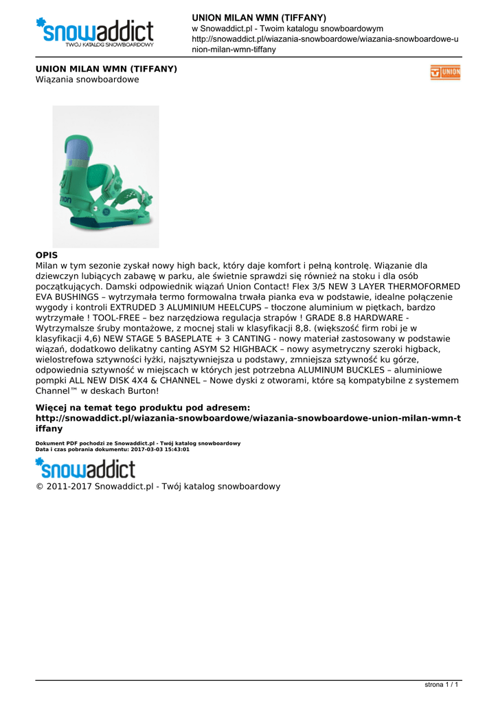 UNION MILAN WMN (TIFFANY) w Snowaddict.pl - Twoim katalogu snowboardowym http://snowaddict.pl/wiazania-snowboardowe/wiazania-snowboardowe-u nion-milan-wmn-tiffany UNION MILAN WMN (TIFFANY) Wiązania snowboardowe OPIS Milan w tym sezonie zyskał nowy high back, który daje komfort i pełną kontrolę. Wiązanie dla dziewczyn lubiących zabawę w parku, ale świetnie sprawdzi się również na stoku i dla osób początkujących. Damski odpowiednik wiązań Union Contact! Flex 3/5 NEW 3 LAYER THERMOFORMED EVA BUSHINGS – wytrzymała termo formowalna trwała pianka eva w podstawie, idealne połączenie wygody i kontroli EXTRUDED 3 ALUMINIUM HEELCUPS – tłoczone aluminium w piętkach, bardzo wytrzymałe ! TOOL-FREE – bez narzędziowa regulacja strapów ! GRADE 8.8 HARDWARE Wytrzymalsze śruby montażowe, z mocnej stali w klasyfikacji 8,8. (większość firm robi je w klasyfikacji 4,6) NEW STAGE 5 BASEPLATE + 3 CANTING - nowy materiał zastosowany w podstawie wiązań, dodatkowo delikatny canting ASYM S2 HIGHBACK – nowy asymetryczny szeroki higback, wielostrefowa sztywności łyżki, najsztywniejsza u podstawy, zmniejsza sztywność ku górze, odpowiednia sztywność w miejscach w których jest potrzebna ALUMINUM BUCKLES – aluminiowe pompki ALL NEW DISK 4X4 & CHANNEL – Nowe dyski z otworami, które są kompatybilne z systemem Channel™ w deskach Burton! Więcej na temat tego produktu pod adresem: http://snowaddict.pl/wiazania-snowboardowe/wiazania-snowboardowe-union-milan-wmn-t iffany Dokument PDF pochodzi ze Snowaddict.pl - Twój katalog snowboardowy Data i czas pobrania dokumentu: 2017-03-03 15:43:01 © 2011-2017 Snowaddict.pl - Twój katalog snowboardowy strona 1 / 1 Powered by TCPDF (www.tcpdf.org)