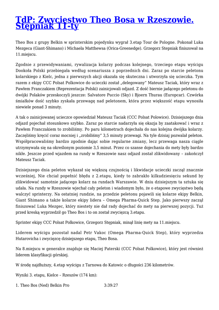 TdP: Zwycięstwo Theo Bosa w Rzeszowie. Stępniak 11-ty Theo Bos z grupy Belkin w sprinterskim pojedynku wygrał 3.etap Tour de Pologne. Pokonał Luka Mezgeca (Giant-Shimano) i Michaela Matthewsa (Orica-Greenedge). Grzegorz Stepniak finiszował na 11.miejscu. Zgodnie z przewidywaniami, rywalizacja kolarzy podczas kolejnego, trzeciego etapu wyścigu Dookoła Polski przebiegała według scenariusza z poprzednich dni. Zaraz po starcie peletonu kolarskiego z Kielc, jedna z pierwszych akcji okazała się skuteczna i utworzyła się ucieczka. Tym razem z ekipy CCC Polsat Polkowice do ucieczki został „delegowany” Mateusz Taciak, który wraz z Pawłem Franczakiem (Reprezentacja Polski) zainicjowali odjazd. Z dość biernie jadącego peletonu do dwójki Polaków przeskoczyli jeszcze: Salvatore Puccio (Sky) i Bjoern Thurau (Europcar). Czwórka śmiałków dość szybko zyskała przewagę nad peletonem, która przez większość etapu wynosiła niewiele ponad 3 minuty. A tak o zainicjowanej ucieczce opowiedział Mateusz Taciak (CCC Polsat Polowice). Dzisiejszego dnia odjazd pojechał stosunkowo szybko. Zaraz po starcie nadarzyła się okazja by zaatakować i wraz z Pawłem Franczakiem to zrobiliśmy. Po paru kilometrach dojechała do nas kolejna dwójka kolarzy. Zaczęliśmy kręcić coraz mocniej i „zrobiliśmy” 3,5 minuty przewagi. Na tyle dzisiaj pozwalał peleton. Współpracowaliśmy bardzo zgodnie dając sobie regularne zmiany, lecz przewaga nasza ciągle utrzymywała się na określonym poziomie 3,5 minut. Przez co szanse dojechania do mety były bardzo nikłe. Jeszcze przed wjazdem na rundy w Rzeszowie nasz odjazd został zlikwidowany – zakończył Mateusz Taciak. Dzisiejszego dnia peleton wykazał się większą czujnością i likwidacje ucieczki zaczął znacznie wcześniej, Nie chciał popełnić błędu z 2.etapu, kiedy to zabrakło kilkudziesięciu sekund by zlikwidować samotnie jadącego kolarz na rundach Warszawie. W dniu dzisiejszym ta sztuka się udała. Na rundy w Rzeszowie wjechał cały peleton i wiadomym było, że o etapowe zwycięstwo będą walczyć sprinterzy. Na ostatniej rundzie, na przedzie peletonu pojawili się kolarze ekipy Belkin, Giant Shimano a także kolarze ekipy lidera – Omega Pharma-Quick Step. Jako pierwszy zaczął finiszować Luka Mezgec, który niestety nie dał rady dojechać do mety na pierwszej pozycji. Tuż przed kreską wyprzedził go Theo Bos i to on został zwycięzcą 3.etapu. Sprinter ekipy CCC Polsat Polkowice, Grzegorz Stępniak, minął linię mety na 11.miejscu. Liderem wyścigu pozostał nadal Petr Vakoc (Omega Pharma-Quick Step), który wyprzedza Hutarovicha i zwycięzcę dzisiejszego etapu, Theo Bosa. Na 8.miejscu w generalce znajduje się Maciej Paterski (CCC Polsat Polkowice), który jest również liderem klasyfikacji górskiej. W środę najdłuższy, 4.etap wyścigu z Tarnowa do Katowic o długości 236 kilometrów. Wyniki 3. etapu, Kielce – Rzeszów (174 km): 1. Theo Bos (Ned) Belkin Pro 3:39:27 2. Luka Mezgec (Slo) Team Giant-Shimano 3. Michael Matthews (Aus) Orica Greenedge 11. Grzegorz Stępniak 33. Bartłomiej Matysiak 52. Maciej Paterski 72. Marek Rutkiewicz 75. Branislau Samiolau 80. Tomasz Marczyński 115. Davide Rebellin 164. Mateusz Taciak 6:11 info: A.Dyszyński