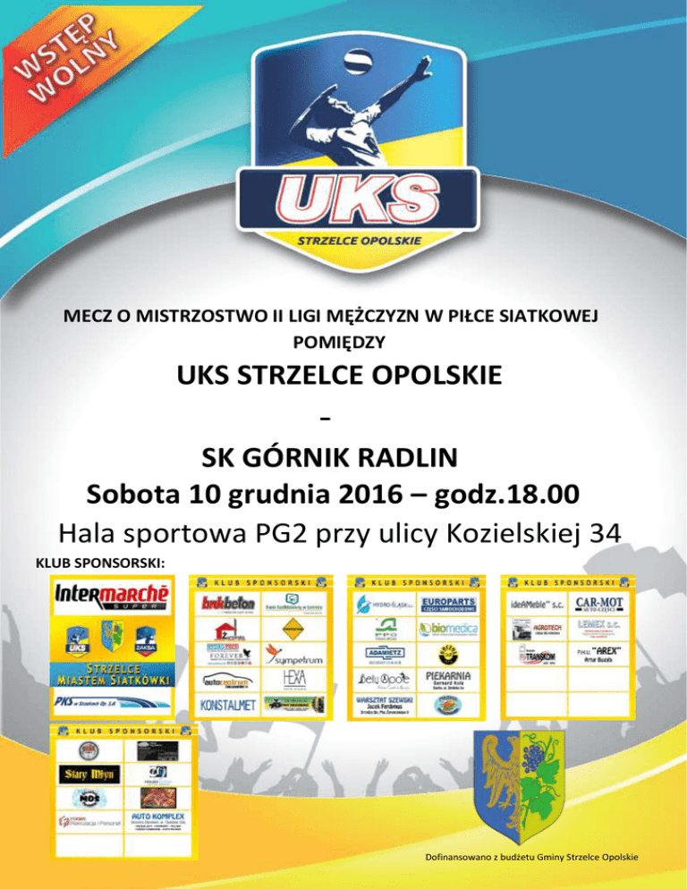 MECZ O MISTRZOSTWO II LIGI MĘŻCZYZN W PIŁCE SIATKOWEJ POMIĘDZY UKS STRZELCE OPOLSKIE SK GÓRNIK RADLIN Sobota 10 grudnia 2016 – godz.18.00 Hala sportowa PG2 przy ulicy Kozielskiej 34 KLUB SPONSORSKI: Dofinansowano z budżetu Gminy Strzelce Opolskie