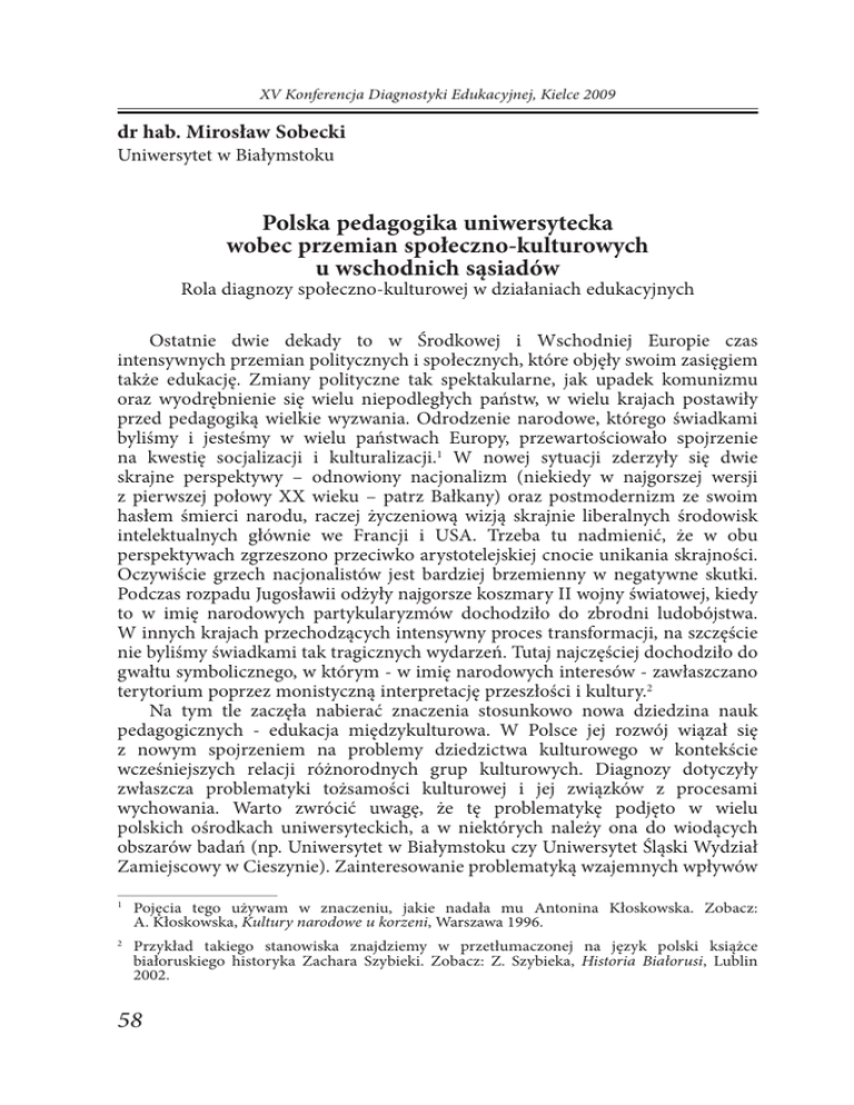 XV Konferencja Diagnostyki Edukacyjnej, Kielce 2009 dr hab. Mirosław Sobecki Uniwersytet w Białymstoku Polska pedagogika uniwersytecka wobec przemian społeczno-kulturowych u wschodnich sąsiadów Rola diagnozy społeczno-kulturowej w działaniach edukacyjnych Ostatnie dwie dekady to w Środkowej i Wschodniej Europie czas intensywnych przemian politycznych i społecznych, które objęły swoim zasięgiem także edukację. Zmiany polityczne tak spektakularne, jak upadek komunizmu oraz wyodrębnienie się wielu niepodległych państw, w wielu krajach postawiły przed pedagogiką wielkie wyzwania. Odrodzenie narodowe, którego świadkami byliśmy i jesteśmy w wielu państwach Europy, przewartościowało spojrzenie na kwestię socjalizacji i kulturalizacji.1 W nowej sytuacji zderzyły się dwie skrajne perspektywy – odnowiony nacjonalizm (niekiedy w najgorszej wersji z pierwszej połowy XX wieku – patrz Bałkany) oraz postmodernizm ze swoim hasłem śmierci narodu, raczej życzeniową wizją skrajnie liberalnych środowisk intelektualnych głównie we Francji i USA. Trzeba tu nadmienić, że w obu perspektywach zgrzeszono przeciwko arystotelejskiej cnocie unikania skrajności. Oczywiście grzech nacjonalistów jest bardziej brzemienny w negatywne skutki. Podczas rozpadu Jugosławii odżyły najgorsze koszmary II wojny światowej, kiedy to w imię narodowych partykularyzmów dochodziło do zbrodni ludobójstwa. W innych krajach przechodzących intensywny proces transformacji, na szczęście nie byliśmy świadkami tak tragicznych wydarzeń. Tutaj najczęściej dochodziło do gwałtu symbolicznego, w którym - w imię narodowych interesów - zawłaszczano terytorium poprzez monistyczną interpretację przeszłości i kultury.2 Na tym tle zaczęła nabierać znaczenia stosunkowo nowa dziedzina nauk pedagogicznych - edukacja międzykulturowa. W Polsce jej rozwój wiązał się z nowym spojrzeniem na problemy dziedzictwa kulturowego w kontekście wcześniejszych relacji różnorodnych grup kulturowych. Diagnozy dotyczyły zwłaszcza problematyki tożsamości kulturowej i jej związków z procesami wychowania. Warto zwrócić uwagę, że tę problematykę podjęto w wielu polskich ośrodkach uniwersyteckich, a w niektórych należy ona do wiodących obszarów badań (np. Uniwersytet w Białymstoku czy Uniwersytet Śląski Wydział Zamiejscowy w Cieszynie). Zainteresowanie problematyką wzajemnych wpływów Pojęcia tego używam w znaczeniu, jakie nadała mu Antonina Kłoskowska. Zobacz: A. Kłoskowska, Kultury narodowe u korzeni, Warszawa 1996. 1 Przykład takiego stanowiska znajdziemy w przetłumaczonej na język polski książce białoruskiego historyka Zachara Szybieki. Zobacz: Z. Szybieka, Historia Białorusi, Lublin 2002. 2 58 Badania międzynarodowe i wzory zagraniczne w diagnostyce edukacyjnej kulturowych i ich znaczeniem dla wychowania naturalnie doprowadziło do nawiązania współpracy z zagranicznymi ośrodkami, zwłaszcza tymi, które znajdowały się na obszarze analizowanej interakcji kultur. Badacze z szeregu uniwersytetów aktywnie zaangażowali się w analizy rzeczywistości społecznej krajów postradzieckiego obszaru, niekiedy próbując aktywnie uczestniczyć w jej przemianach. W niniejszym tekście chciałbym się skoncentrować na doświadczeniach związanych z partnerami zza wschodniej granicy. W dużej części dotyczą one funkcjonowania w tych krajach szkolnictwa dla polskiej autochtonicznej mniejszości pozostawionej po Jałcie poza granicami Macierzy. Czasami praca badawcza zdecydowanie wykracza poza fazę diagnostyczną, zmierzając ku prawdziwemu przekształcaniu rzeczywistości. Marta Urlińska z Uniwersytetu Mikołaja Kopernika w Toruniu przez wiele lat pilotowała eksperyment edukacyjny na Łotwie.3 Dotyczył on uruchomienia i działalności szkoły polskiej w Rydze. Badaczka próbowała odpowiedzieć na pytanie, na ile szkoła polska na Łotwie stanowi „medium w procesie kształtowania tożsamości swoich uczniów”4 W połowie lat 90. minionego wieku, w początkowej fazie eksperymentu, zorganizowano jedną z pierwszych w Polsce szeroko zakrojoną debatę poświęconą funkcjonowaniu szkół dla mniejszości narodowych, której finałem była konferencja w Rabce w 1994 roku. Oprócz pedagogów uczestniczyli w niej czołowi przedstawiciele innych dyscyplin wspomagających pedagogów w analizie.5 Trzeba tu zaznaczyć, że diagnozy sytuacji edukacyjnej mniejszości narodowych od początku prowadzenia tego typu analiz w Polsce zasadniczo koncentrowały się na dwu sferach. Pierwszą z nich była tożsamość kulturowa uczestników procesu edukacyjnego, przede wszystkim uczniów, rzadziej nauczycieli i rodziców, drugą zaś funkcjonowanie instytucji edukacyjnych. W badaniach koordynowanych przez Martę Urlińską skoncentrowano się w jednakowym stopniu na obydwu sferach. W badaniach tych Uniwersytet Mikołaja Kopernika z Torunia współpracował z Uniwersytetem Łotewskim w Rydze (Latvijas Universitetas). Koordynatorem przedsięwzięcia ze strony łotewskiej był prof. Oskars Zids. Relacja z całego przedsięwzięcia zawarta jest w pracy Marty Urlińskiej „Szkoła polska na obczyźnie wobec dylematów tożsamościowych”.6 Praca stanowi obszerny raport stanowiący pogłębioną diagnozę problemu wraz ze szczegółowym wyłuszczeniem szeregu aspektów stanowiących oryginalny kontekst przedsięwzięcia. Okazuje się, że oparta na uczciwych założeniach inicjatywa badawczo-wdrożeniowa może ulec daleko idącej destrukcji w wyniku ingerencji tych elementów rzeczywistości społecznej, których na początku zupełnie się nie spodziewano. Efekty tego eksperymentu zostały opisane w pracy: M. Urlińska, Szkoła polska na obczyźnie wobec dylematów tożsamościowych, Toruń 2007. 3 M. Urlińska, Szkoła polska na obczyźnie… op. cit. s. 17. 4 Interdyscyplinarne podejście zauważamy już w składzie samego zespołu badawczego. Pisze o tym Marta Urlińs