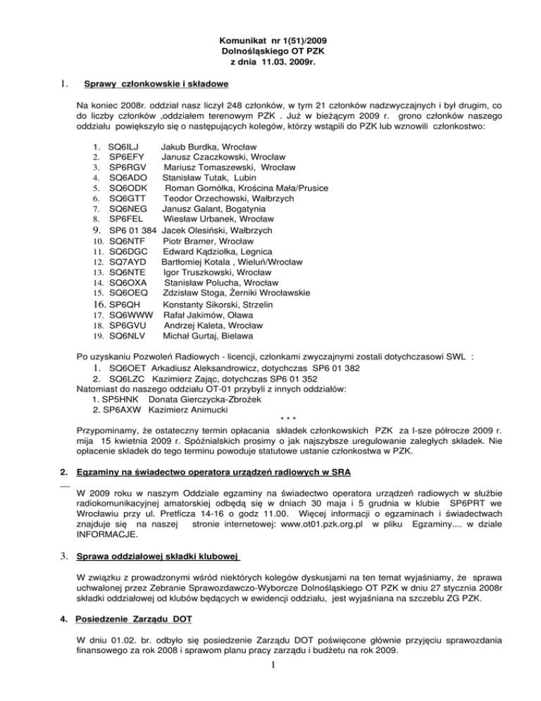 Komunikat nr 1(51)/2009 Dolnośląskiego OT PZK z dnia 11.03. 2009r. 1. Sprawy członkowskie i składowe Na koniec 2008r. oddział nasz liczył 248 członków, w tym 21 członków nadzwyczajnych i był drugim, co do liczby członków ,oddziałem terenowym PZK . Już w bieżącym 2009 r. grono członków naszego oddziału powiększyło się o następujących kolegów, którzy wstąpili do PZK lub wznowili członkostwo: 1. SQ6ILJ Jakub Burdka, Wrocław 2. SP6EFY Janusz Czaczkowski, Wrocław 3. SP6RGV Mariusz Tomaszewski, Wrocław 4. SQ6ADO Stanisław Tutak, Lubin 5. SQ6ODK Roman Gomółka, Krościna Mała/Prusice 6. SQ6GTT Teodor Orzechowski, Wałbrzych 7. SQ6NEG Janusz Galant, Bogatynia 8. SP6FEL Wiesław Urbanek, Wrocław 9. SP6 01 384 Jacek Olesiński, Wałbrzych 10. SQ6NTF Piotr Bramer, Wrocław 11. SQ6DGC Edward Kądziołka, Legnica 12. SQ7AYD Bartłomiej Kotala , Wieluń/Wrocław 13. SQ6NTE Igor Truszkowski, Wrocław 14. SQ6OXA Stanisław Polucha, Wrocław 15. SQ6OEQ Zdzisław Stoga, Żerniki Wrocławskie 16. SP6QH Konstanty Sikorski, Strzelin 17. SQ6WWW Rafał Jakimów, Oława 18. SP6GVU Andrzej Kaleta, Wrocław 19. SQ6NLV Michał Gurtaj, Bielawa Po uzyskaniu Pozwoleń Radiowych licencji, członkami zwyczajnymi zostali dotychczasowi SWL : 1. SQ6OET Arkadiusz Aleksandrowicz, dotychczas SP6 01 382 2. SQ6LZC Kazimierz Zając, dotychczas SP6 01 352 Natomiast do naszego oddziału OT01 przybyli z innych oddziałów: 1. SP5HNK Donata GierczyckaZbrożek 2. SP6AXW Kazimierz Animucki * * * Przypominamy, że ostateczny termin opłacania składek członkowskich PZK za Isze półrocze 2009 r. mija 15 kwietnia 2009 r. Spóźnialskich prosimy o jak najszybsze uregulowanie zaległych składek. Nie opłacenie składek do tego terminu powoduje statutowe ustanie członkostwa w PZK. 2. Egzaminy na świadectwo operatora urządzeń radiowych w SRA W 2009 roku w naszym Oddziale egzaminy na świadectwo operatora urządzeń radiowych w służbie radiokomunikacyjnej amatorskiej odbędą się w dniach 30 maja i 5 grudnia w klubie SP6PRT we Wrocławiu przy ul. Pretficza 1416 o godz 11.00. Więcej informacji o egzaminach i świadectwach znajduje się na naszej stronie internetowej: www.ot01.pzk.org.pl w pliku Egzaminy.... w dziale INFORMACJE. 3. Sprawa oddziałowej składki klubowej W związku z prowadzonymi wśród niektórych kolegów dyskusjami na ten temat wyjaśniamy, że sprawa uchwalonej przez Zebranie SprawozdawczoWyborcze Dolnośląskiego OT PZK w dniu 27 stycznia 2008r składki oddziałowej od klubów będących w ewidencji oddziału, jest wyjaśniana na szczeblu ZG PZK. 4. Posiedzenie Zarządu DOT W dniu 01.02. br. odbyło się posiedzenie Zarządu DOT poświęcone głównie przyjęciu sprawozdania finansowego za rok 2008 i sprawom planu pracy zarządu i budżetu na rok 2009. 1 Przyjęto bilans DOT za rok 2008 i plan pracy zarządu na rok 2009. Ze względu na brak danych o stanie funduszy z 1 % OPP będących na koncie ZG PZK do dyspozycji naszego oddziału, uchwalenie budżetu oddziału przeniesiono na kolejne posiedzenie zarządu DOT. W bieżącym roku znaczącą pozycją budżetu będzie zakup sprzętu radiowego na potrzeby stacji oddziałowej i dla wspierania działalności klubów terenowych oraz wyposażenia DASR. Spośród innych spraw do załatwienia to naprawa instalacji antenowej przemiennika SR6G. 5. Zespół redakcyjny komunikatów oddziałowych Zarząd DOT PZK pragnie wznowić nadawanie komunikatów radiowych po zakupie transceivera dla oddziału , lecz zanim to nastąpi , przystępuje do tworzenia zespołu redakcyjnego tych komunikatów. Potrzebne są osoby do zbierania materiałów, redagowania komunikatów i nadawania ich z anteny radiowej. Osoby chętne do tej pracy proszone są o kontakt osobisty, telefoniczny lub mailowy z zarządem DOT. 6. Lokalizacja przemiennika SR6R Przypominamy ,że obecna lokalizacja „wrocławskiego” przemiennika jest tymczasowa. W dalszym ciągu aktualna jest sprawa przeniesienia przemiennika SR6R do docelowej lokalizacji we Wrocławiu i oczekujemy wskazania przez kolegów takiej lokalizacji. Ponownie zwracamy się z apelem do kolegów o rozeznanie możliwych miejsc w swoich okolicach i zaproponowanie nowej, lepszej i stałej już lokalizacji. 7. Apel QSL Managera OT 01 QSL manager naszego OT, kol. Michał SQ6IYV prosi o odpowiednie przygotowywanie kart QSL do wysyłki. Karty winny być poukładane prefiksami. Dla stacji polskich karty układać okręgami ( SP1, SQ1, SP2, SQ2, itd.), dla stacji zagranicznych układać krajami, dla stacji USA obowiązkowo układać prefiksami. W ostatnich miesiącach miała miejsce duża aktywność polskich stacji okolicznościowych. Dla tych stacji należy zawsze podawać ich managerów, nr biura ( OT ) albo przynajmniej okręg. Są koledzy, którzy znakomicie już wstępnie sortują karty wg określonych zasad, ale nie będziemy wymieniać ich znaków, aby nie poczuli się urażeni ci, którzy dostarczają po 100200 kart w zupełnej rozsypce. Wtedy na każdej karcie trzeba zidentyfikować odbiorcę, co jest bardzo pracochłonne. Dla przyśpieszenia obiegu kart QSL prosimy kolegów o dostosowanie się do tego apelu. 8. Z ostatniej chwili W dniu 09 marca 2009 r. odszedł od nas na zawsze nasz Kolega Antoni Rudnicki SP6DHF. Członek klubu SP6KYU z Ziębic, członek PZK DOT 01. Będzie nam Go bardzo brakowało. Odszedł z naszego grona wspaniały człowiek i konstruktor urządzeń radiowych. Komunikat przygotowali Staszek SP6IXU i Staszek SP6BCC. Prosimy o przysyłanie materiałów do wydań internetowych naszych komunikatów. Informacje najlepiej przesyłać pocztą elektroniczną do sekretarza oddziału lub innych członków Zarządu, do których kontakty są podane na naszej stronie internetowej www.ot01.pzk.org.pl . 2