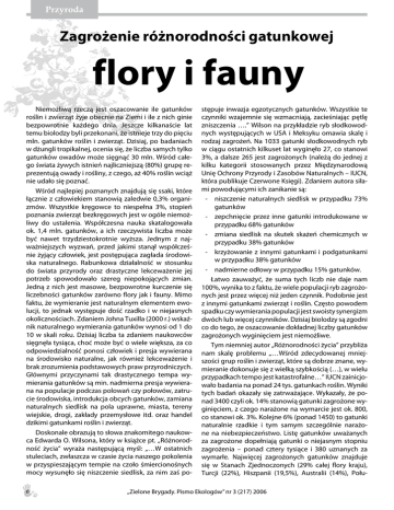 Przyroda Zagrożenie różnorodności gatunkowej flory i fauny Niemożliwą rzeczą jest oszacowanie ile gatunków roślin i zwierząt żyje obecnie na Ziemi i ile z nich ginie bezpowrotnie każdego dnia. Jeszcze kilkanaście lat temu biolodzy byli przekonani, że istnieje trzy do pięciu mln. gatunków roślin i zwierząt. Dzisiaj, po badaniach w dżungli tropikalnej, ocenia się, że liczba samych tylko gatunków owadów może sięgnąć 30 mln. Wśród całego świata żywych istnień najliczniejszą (80%) grupę reprezentują owady i rośliny, z czego, aż 40% roślin wciąż nie udało się poznać. Wśród najlepiej poznanych znajdują się ssaki, które łącznie z człowiekiem stanowią zaledwie 0,3% organizmów. Wszystkie kręgowce to niespełna 3%, stopień poznania zwierząt bezkręgowych jest w ogóle niemożliwy do ustalenia. Współczesna nauka skatalogowała ok. 1,4 mln. gatunków, a ich rzeczywista liczba może być nawet trzydziestokrotnie wyższa. Jednym z najważniejszych wyzwań, przed jakimi stanął współcześnie żyjący człowiek, jest postępująca zagłada środowiska naturalnego. Rabunkowa działalność w stosunku do świata przyrody oraz drastyczne lekceważenie jej potrzeb spowodowało szereg niepokojących zmian. Jedną z nich jest masowe, bezpowrotne kurczenie się liczebności gatunków zarówno flory jak i fauny. Mimo faktu, że wymieranie jest naturalnym elementem ewolucji, to jednak występuje dość rzadko i w niejasnych okolicznościach. Zdaniem Johna Tuxilla (2000 r.) wskaźnik naturalnego wymierania gatunków wynosi od 1 do 10 w skali roku. Dzisiaj liczba ta zdaniem naukowców sięgnęła tysiąca, choć może być o wiele większa, za co odpowiedzialność ponosi człowiek i presja wywierana na środowisko naturalne, jak również lekceważenie i brak zrozumienia podstawowych praw przyrodniczych. Głównymi przyczynami tak drastycznego tempa wymierania gatunków są min. nadmierna presja wywierana na populacje podczas polowań czy połowów, zatrucie środowiska, introdukcja obcych gatunków, zamiana naturalnych siedlisk na pola uprawne, miasta, tereny wiejskie, drogi, zakłady przemysłowe itd. oraz handel dzikimi gatunkami roślin i zwierząt. Doskonale obrazują to słowa znakomitego naukowca Edwarda O. Wilsona, który w książce pt. „Różnorodność życia” wyraża następującą myśl: „…W ostatnich stuleciach, zwłaszcza w czasie życia naszego pokolenia w przyspieszającym tempie na czoło śmiercionośnych mocy wysunęło się niszczenie siedlisk, za nim zaś po stępuje inwazja egzotycznych gatunków. Wszystkie te czynniki wzajemnie się wzmacniają, zacieśniając pętlę zniszczenia ….” Wilson na przykładzie ryb słodkowodnych występujących w USA i Meksyku omawia skalę i rodzaj zagrożeń. Na 1033 gatunki słodkowodnych ryb w ciągu ostatnich kilkuset lat wyginęło 27, co stanowi 3%, a dalsze 265 jest zagrożonych (należą do jednej z kilku kategorii stosowanych przez Międzynarodową Unię Ochrony Przyrody i Zasobów Naturalnych – IUCN, która publikuje Czerwone Księgi). Zdaniem autora siłami powodującymi ich zanikanie są: - niszczenie naturalnych siedlisk w przypadku 73% gatunków - zepchnięcie przez inne gatunki introdukowane w przypadku 68% gatunków - zmiana siedlisk na skutek skażeń chemicznych w przypadku 38% gatunków - krzyżowanie z innymi gatunkami i podgatunkami w przypadku 38% gatunków - nadmierne odłowy w przypadku 15% gatunków. Łatwo zauważyć, że suma tych liczb nie daje nam 100%, wynika to z faktu, że wiele populacji ryb zagrożonych jest przez więcej niż jeden czynnik. Podobnie jest z innymi gatunkami zwierząt i roślin. Często powodem spadku czy wymierania populacji jest swoisty synergizm dwóch lub więcej czynników. Dzisiaj biolodzy są zgodni co do tego, że oszacowanie dokładnej liczby gatunków zagrożonych wyginięciem jest niemożliwe. Tym niemniej autor „Różnorodności życia” przybliża nam skalę problemu „…Wśród zdecydowanej mniejszości grup roślin i zwierząt, które są dobrze znane, wymieranie dokonuje się z wielką szybkością (…), w wielu przypadkach tempo jest katastrofalne…” IUCN zainicjowało badania na ponad 24 tys. gatunkach roślin. Wyniki tych badań okazały się zatrważające. Wykazały, że ponad 3400 czyli ok. 14% stanowią gatunki zagrożone wyginięciem, z czego narażone na wymarcie jest ok. 800, co stanowi ok. 3%. Kolejne 6% (ponad 1450) to gatunki naturalnie rzadkie i tym samym szczególnie narażone na niebezpieczeństwo. Listę gatunków uważanych za zagrożone dopełniają gatunki o niejasnym stopniu zagrożenia – ponad cztery tysiące i 380 uznanych za wymarłe. Najwięcej zagrożonych gatunków znajduje się w Stanach Zjednoczonych (29% całej flory kraju), Turcji (22%), Hiszpanii (19,5%), Australii (14%), Połu- „Zielone Brygady. Pismo Ekologów” nr 3 (217) 2006 dniowej Afryce (14%) i Panamie (13%). Warto zauważyć, że ponad 90% wszystkich zagrożonych stanowią gatunki endemiczne, przez co znajdujące się w większym niebezpieczeństwie. Dość wspomnieć, że wśród 108 udokumentowanych gatunków ptaków, które wyginęły w ciągu czterystu lat 97 z nich stanowią ptaki zamieszkujące wyspy. Równie zagrożone są organizmy zamieszkujące izolowane ekosystemy w głębi lądu jak np. wielka panda na terenie Chin. Spośród 9600 gatunków ptaków żyjących na Ziemi jedynie populacja 3000 gatunków nie zmienia się lub wzrasta, u pięciu tysięcy zanotowano spadek populacji, tysiąc jest zagrożonych wyginięciem a sześćset blisko zagrożenia wyginięciem. Wśród ssaków stopień zagrożenia jest równie wysoki, wg danych World Resources z 1992 r. w USA istnieje 49 zagrożonych gatunków, we Francji 59 gatunków, Portugalii 42. Mowa tu o krajach zrzeszonych w OECD. Historia obfituje w przykłady zupełnego wyniszczenia gatunków roślin i zwierząt. W przeszłości na skutek intensywnych polowań zni