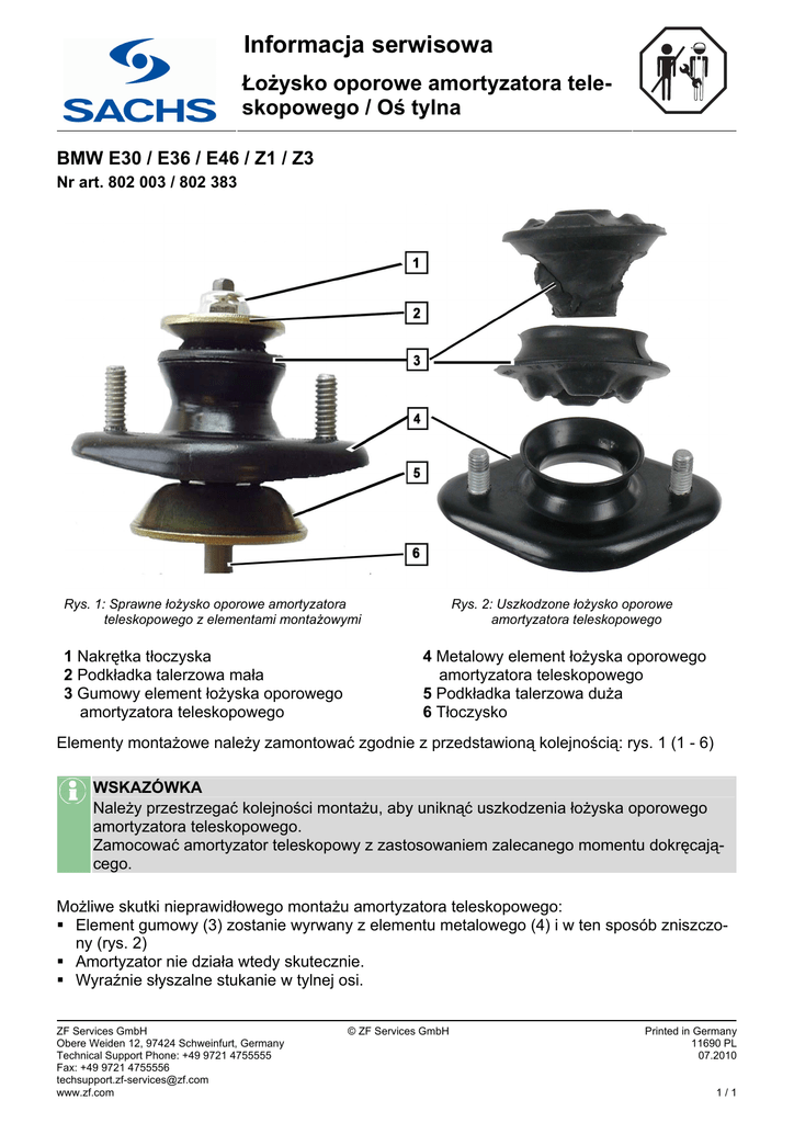 Informacja serwisowa Łożysko oporowe amortyzatora teleskopowego / Oś tylna BMW E30 / E36 / E46 / Z1 / Z3 Nr art. 802 003 / 802 383 Rys. 1: Sprawne łożysko oporowe amortyzatora teleskopowego z elementami montażowymi 1 Nakrętka tłoczyska 2 Podkładka talerzowa mała 3 Gumowy element łożyska oporowego amortyzatora teleskopowego Rys. 2: Uszkodzone łożysko oporowe amortyzatora teleskopowego 4 Metalowy element łożyska oporowego amortyzatora teleskopowego 5 Podkładka talerzowa duża 6 Tłoczysko Elementy montażowe należy zamontować zgodnie z przedstawioną kolejnością: rys. 1 (1 - 6) WSKAZÓWKA Należy przestrzegać kolejności montażu, aby uniknąć uszkodzenia łożyska oporowego amortyzatora teleskopowego. Zamocować amortyzator teleskopowy z zastosowaniem zalecanego momentu dokręcającego. Możliwe skutki nieprawidłowego montażu amortyzatora teleskopowego: Element gumowy (3) zostanie wyrwany z elementu metalowego (4) i w ten sposób zniszczony (rys. 2) Amortyzator nie działa wtedy skutecznie. Wyraźnie słyszalne stukanie w tylnej osi. ZF Services GmbH Obere Weiden 12, 97424 Schweinfurt, Germany Technical Support Phone: +49 9721 4755555 Fax: +49 9721 4755556 [email protected] www.zf.com © ZF Services GmbH Printed in Germany 11690 PL 07.2010 1/1
