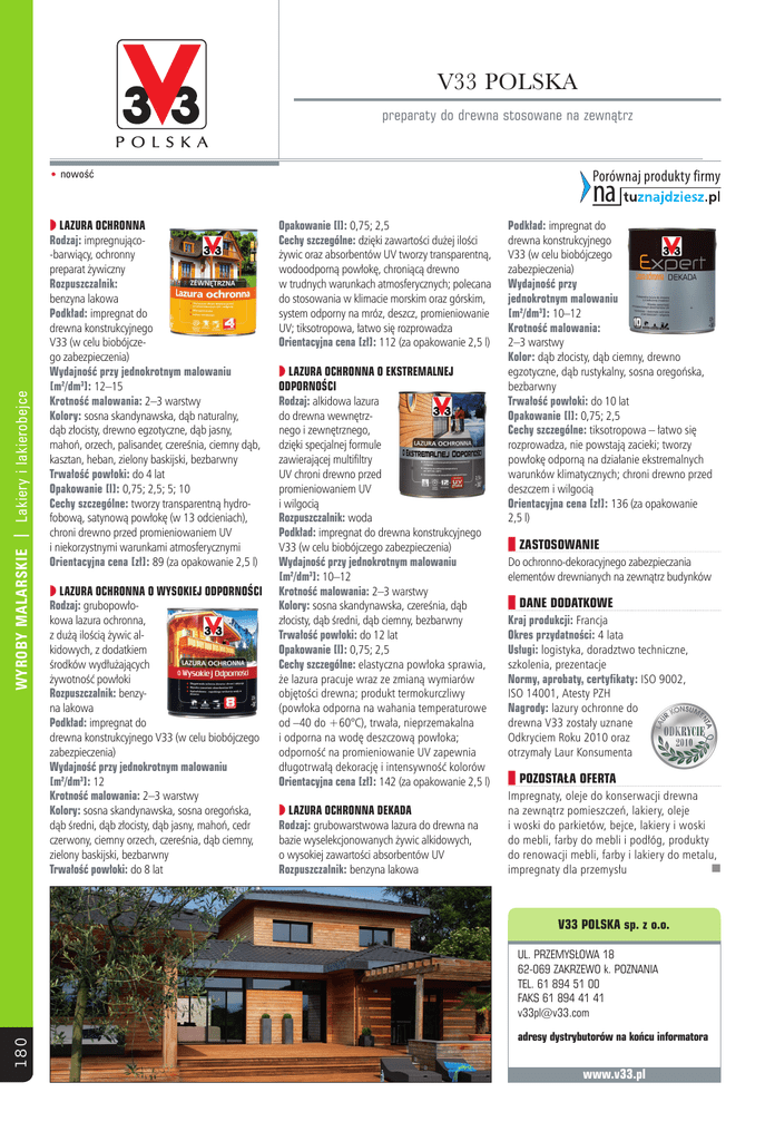 V33 POLSKA preparaty do drewna stosowane na zewnątrz Porównaj produkty firmy • nowość wyroby malarskie | Lakiery i lakierobejce ◗ Lazura ochronna Rodzaj: impregnująco-barwiący, ochronny preparat żywiczny Rozpuszczalnik: benzyna lakowa Podkład: impregnat do drewna konstrukcyjnego V33 (w celu biobójczego zabezpieczenia) Wydajność przy jednokrotnym malowaniu [m2/dm3]: 12–15 Krotność malowania: 2–3 warstwy Kolory: sosna skandynawska, dąb naturalny, dąb złocisty, drewno egzotyczne, dąb jasny, mahoń, orzech, palisander, czereśnia, ciemny dąb, kasztan, heban, zielony baskijski, bezbarwny Trwałość powłoki: do 4 lat Opakowanie [l]: 0,75; 2,5; 5; 10 Cechy szczególne: tworzy transparentną hydrofobową, satynową powłokę (w 13 odcieniach), chroni drewno przed promieniowaniem UV i niekorzystnymi warunkami atmosferycznymi Orientacyjna cena [zł]: 89 (za opakowanie 2,5 l) ◗ LAZURA OCHRONNA O WYSOKIEJ ODPORNOŚCI Rodzaj: grubopowłokowa lazura ochronna, z dużą ilością żywic alkidowych, z dodatkiem środków wydłużających żywotność powłoki Rozpuszczalnik: benzyna lakowa Podkład: impregnat do drewna konstrukcyjnego V33 (w celu biobójczego zabezpieczenia) Wydajność przy jednokrotnym malowaniu [m2/dm3]: 12 Krotność malowania: 2–3 warstwy Kolory: sosna skandynawska, sosna oregońska, dąb średni, dąb złocisty, dąb jasny, mahoń, cedr czerwony, ciemny orzech, czereśnia, dąb ciemny, zielony baskijski, bezbarwny Trwałość powłoki: do 8 lat na Opakowanie [l]: 0,75; 2,5 Cechy szczególne: dzięki zawartości dużej ilości żywic oraz absorbentów UV tworzy transparentną, wodoodporną powłokę, chroniącą drewno w trudnych warunkach atmosferycznych; polecana do stosowania w klimacie morskim oraz górskim, system odporny na mróz, deszcz, promieniowanie UV; tiksotropowa, łatwo się rozprowadza Orientacyjna cena [zł]: 112 (za opakowanie 2,5 l) ◗ LAZURA OCHRONNA O EKSTREMALNEJ ODPORNOŚCI Rodzaj: alkidowa lazura do drewna wewnętrznego i zewnętrznego, dzięki specjalnej formule zawierającej multifiltry UV chroni drewno przed promieniowaniem UV i wilgocią Rozpuszczalnik: woda Podkład: impregnat do drewna konstrukcyjnego V33 (w celu biobójczego zabezpieczenia) Wydajność przy jednokrotnym malowaniu [m2/dm3]: 10–12 Krotność malowania: 2–3 warstwy Kolory: sosna skandynawska, czereśnia, dąb złocisty, dąb średni, dąb ciemny, bezbarwny Trwałość powłoki: do 12 lat Opakowanie [l]: 0,75; 2,5 Cechy szczególne: elastyczna powłoka sprawia, że lazura pracuje wraz ze zmianą wymiarów objętości drewna; produkt termokurczliwy (powłoka odporna na wahania temperaturowe od –40 do +60°C), trwała, nieprzemakalna i odporna na wodę deszczową powłoka; odporność na promieniowanie UV zapewnia długotrwałą dekorację i intensywność kolorów Orientacyjna cena [zł]: 142 (za opakowanie 2,5 l) ◗ LAZURA OCHRONNA DEKADA Rodzaj: grubowarstwowa lazura do drewna na bazie wyselekcjonowanych żywic alkidowych, o wysokiej zawartości absorbentów UV Rozpuszczalnik: benzyna lakowa Podkład: impregnat do drewna konstrukcyjnego V33 (w celu biobójczego zabezpieczenia) Wydajność przy jednokrotnym malowaniu [m2/dm3]: 10–12 Krotność malowania: 2–3 warstwy Kolor: dąb złocisty, dąb ciemny, drewno egzotyczne, dąb rustykalny, sosna oregońska, bezbarwny Trwałość powłoki: do 10 lat Opakowanie [l]: 0,75; 2,5 Cechy szczególne: tiksotropowa – łatwo się rozprowadza, nie powstają zacieki; tworzy powłokę odporną na działanie ekstremalnych warunków klimatycznych; chroni drewno przed deszczem i wilgocią Orientacyjna cena [zł]: 136 (za opakowanie 2,5 l) ■ ZASTOSOWANIE Do ochronno-dekoracyjnego zabezpieczania elementów drewnianych na zewnątrz budynków ■ DANE DODATKOWE Kraj produkcji: Francja Okres przydatności: 4 lata Usługi: logistyka, doradztwo techniczne, szkolenia, prezentacje Normy, aprobaty, certyfikaty: ISO 9002, ISO 14001, Atesty PZH Nagrody: lazury ochronne do drewna V33 zostały uznane Odkryciem Roku 2010 oraz otrzymały Laur Konsumenta ■ PozostaŁa oferta Impregnaty, oleje do konserwacji drewna na zewnątrz pomieszczeń, lakiery, oleje i woski do parkietów, bejce, lakiery i woski do mebli, farby do mebli i podłóg, produkty do renowacji mebli, farby i lakiery do metalu, ■ impregnaty dla przemysłu V33 POLSKA sp. z o.o. 180 UL. PRZEMYSŁOWA 18 62-069 ZAKRZEWO k. POZNANIA TEL. 61 894 51 00 FAKS 61 894 41 41 [email protected] adresy dystrybutorów na końcu informatora www.v33.pl
