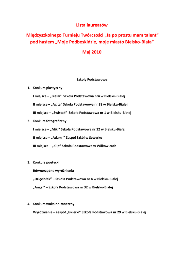 Lista laureatów Międzyszkolnego Turnieju Twórczości „Ja po prostu mam talent” pod hasłem „Moje Podbeskidzie, moje miasto Bielsko-Biała” Maj 2010 Szkoły Podstawowe 1. Konkurs plastyczny I miejsce – „Bielik” Szkoła Podstawowa nr4 w Bielsku-Białej II miejsce – „Agita” Szkoła Podstawowa nr 38 w Bielsku-Białej III miejsce – „Świstak” Szkoła Podstawowa nr 1 w Bielsku-Białej 2. Konkurs fotograficzny I miejsce – „Miki” Szkoła Podstawowa nr 32 w Bielsku-Białej II miejsce – „Adam ” Zespół Szkół w Szczyrku III miejsce – „Klip” Szkoła Podstawowa w Wilkowicach 3. Konkurs poetycki Równorzędne wyróżnienia „Dzięciołek” – Szkoła Podstawowa nr 4 w Bielsku-Białej „Angel” – Szkoła Podstawowa nr 32 w Bielsku-Białej 4. Konkurs wokalno-taneczny Wyróżnienie – zespół „Iskierki” Szkoła Podstawowa nr 29 w Bielsku-Białej Gimnazja 1. Konkurs plastyczny I miejsce – „Foka” Gimnazjum nr 11 w Bielsku-Białej II miejsce – „Kroka” Gimnazjum nr 4 w Bielsku-Białej III miejsce – „Dęboś” Gimnazjum nr 9 w Bielsku-Białej 2. Konkurs fotograficzny I miejsce – „Schagia” Gimnazjum nr 8 w Bielsku-Białej II miejsce – „ Djglok ” Gimnazjum nr 14 w Bielsku-Białej III miejsce – „A.A.” Gimnazjum nr 6 w Bielsku-Białej 3. Konkurs poetycki Równorzędne wyróżnienia „Skrzat” – Gimnazjum nr 15 w Bielsku-Białej „Ryba” – Gimnazjum nr 14 w Bielsku-Białej „Krzyś” – Gimnazjum nr 4 w Bielsku-Białej 4. Konkurs wokalno-taneczny Nagroda GRAND PRIX – Angelika Kolat Gimnazjum nr 6 w Bielsku-Białej