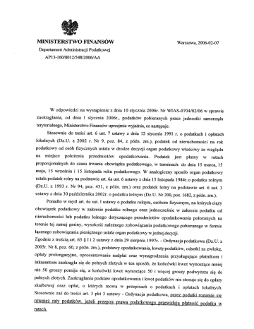 MINISTERSTWO FINANSÓW Warszawa, 2006-02-07 Oepartament Administracji Podatkowej AP13-160/8012/548/2006/AA W odpowiedzi na wystąpienie z dnia 10 stycznia 2006r. Nr WIAS-0704/02/06 w sprawie zaokrąglania, od dnia l stycznia 2006r., podatków pobieranych przez jednostki samorządu terytorialnego,Ministerstwo Finansów uprzejmiewyjaśnia, co następuje: Stosownie do treści art. 6 ust. 7 ustawy z dnia 12 stycznia 1991 r. o podatkach i opłatach lokalnych (Oz.U. z 2002 r. Nr 9, poz. 84, z późno zm.), podatek od nieruchomości na rok podatkowy od osób fizycznych ustala w drodze decyzji organ podatkowy właściwy ze względu na miejsce położenia przedmiotów opodatkowania. Podatek jest płatny w ratach proporcjonalnych do czasu trwania obowiązku podatkowego, w terminach: do dnia 15 marca, 15 maja, 15 września i 15 listopada roku podatkowego. W analogiczny sposób organ podatkowy ustala podatek rolny na podstawie art. 6a ust. 6 ustawy z dnia 15 listopada 1984r. o podatku rolnym (Oz.U. z 1993 r. Nr 94, poz. 431, z późno zm.) oraz podatek leśny na podstawie art. 6 ust. 3 ustawy z dnia 30 października 2002r. o podatku leśnym (Oz.U. Nr 200, poz. 1682, z późnozm.). Ponadto w myśl art. 6c ust. l ustawy o podatku rolnym, osobom fizycznym, na którychciąży obowiązek podatkowy w zakresie podatku rolnego oraz jednocześnie w zakresie podatku od nieruchomości lub podatku leśnego dotyczącego przedmiotów opodatkowania położonych na terenie tej samej gminy, wysokość należnego zobowiązania podatkowego pobieranego w formie łącznego zobowiązania pieniężnego ustala organpodatkowy w jednej decyzji. Zgodnie z treścią art. 63 § l i 2 ustawy z dnia 29 sierpnia 1997r. - Ordynacja podatkowa (Oz.u. z 2005r. Nr 8, poz. 60, z późnozm.), podstawy opodatkowania, kwoty podatków, odsetki za zwłokę, opłaty prolongacyjne, oprocentowanie nadpłat oraz wynagrodzenia przysługujące płatnikom i inkasentom zaokrągla się do pełnych złotych w ten sposób, że końcówki kwot wynoszące mniej niż 50 groszy pomija się, a końcówki kwot wynoszące 50 i więcej groszy podwyższa się do pełnych złotych. Zaokrąglania podstaw opodatkowania i kwot podatków nie stosuje się do opłaty skarbowej oraz opłat, o których mowa w przepisach o podatkach i opłatach lokalnych. Stosownie zaś do treści art. 3 pkt 3 ustawy - Ordynacja podatkowa, przez podatki rozumie się również raty podatków. ieżeli przepisy ratach. prawa pod.m.kowego przewid.JJ.liLJ2łatność podJ!1kJJ..Jy Mając na uwadze powyższe uregulowania należy uznać, że w odniesieniu do zobowiązań podatkowych, płaconych zgodnie z przepisami prawa podatkowego w ratach, zaokrągleniu podlega rata podatku. Podobne zasady powinny być stosowane w przypadku łącznego zobowiązania pieniężnego, o którym mowa w art. 6c ustawy o podatku rolnym. Także w tym przypadku, zaokrągleniu podlega rata łącznego zobowiązania pieniężnego, a nie suma poszczególnych podatków składających się na ratę łącznego zobowiązania pieniężnego. Najpierw należy więc zsumować kwoty poszczególnych podatków wchodzących w skład łącznego zobowiązania (bez zaokrąglania), następnie powstałą w ten sposób kwotę łącznego zobowiązania podzielić na raty i dokonać zaokrąglenia każdej z powstałych w ten sposób rat łącznego zobowiązania. Przy zaokrąglaniu rat powinna być jednak zachowana zasada proporcjonalności wynikająca z poszczególnych ustaw podatkowych. Wobec powyższego, kwotę łącznego zobowiązania pieniężnego należy podzielić na odpowiednią liczbę rat wyrażonych w pełnych złotych, z czego rata pierwsza lub ostatnia może być niższa lub wyższa od pozostałych (rata wynikowa) - w załączeniu przykłady. W analogiczny sposób powinny być zaokrąglane raty podatku rolnego, podatku leśnego oraz podatku od nieruchomości ustalane w decyzji przez organ podatkowy, jak również raty podatku od nieruchomości, podatku rolnego i podatku leśnego wykazywane w deklaracjach składanych przez osoby prawne oraz jednostki organizacyjne nieposiadające osobowości prawnej. p o. Zastępcy Dyrektora Departamentu Administracji Podatkowej Honorata Łopianowska Do wiadomości: Regionalne Izby Obrachunkowe Przykład 1. Zobowiązanie podatkowe w podatku rolnym, leśnym i od nieruchomości (łączne zobowiązanie pieniężne). I I Podatek rolny Przedmiot podatku Rodzaj użytków Grunty grunty orne Grunty pastwiska Podstawa opodatkowania (powierzchnia w ha przeliczeniowych) 16,5 Stawka (w zł); 27,88 zł/q x 2,5 69,7 Kwota podatku 3 69,7 209,10 Stawka (w zł); 131,35zł/m3xO,220 28,897 Kwota podatku Stawka (w zł) Kwota podatku 0,56 71,12 1150,05 Podatek leśny Przedmiot podatku Las Podstawa opodatkowania (powierzchnia w ha fI.zycznych) 0,5 14,4485 Podatek od nieruchomości Przedmiot podatku Budynek mieszkalny Razem: Kwota Podstawa opodatkowania (powierzchnia użytkowa w m2) 127 1444,7185 łącznego zobowiązania pieniężnego Raty łącznego zobowiązania pieniężnego: 1445:4=361,25 I-III rata: 361 zł IV rata: 362 zł 1445 Przykład 2. Zobowiązanie podatkowe w podatku od nieruchomości Przedmiot podatku Podstawa opodatkowania (powierzchnia/powierzchnia Grunty pozostałe Budynki mieszkalne użytkowa I Stawka (w zł) w m2) I I 0,25 I 157,7 0,50 ! 361,75 I 78,85 440,60 Kwota podatku od nieruchomości: Raty podatku od nieruchomości: 441 :4=110,25 zł I rata: 110 zł II rata: 110 zł III rata: 110 zł I I 1447 Razem: Kwota podatku I 441 IV rata: 111 zł Przykład 3. Zobowiązanie podatkowe w podatku od nieruchomości Przedmiot podatku Grunty związane z prowadzeniem działalności Budynki związane z prowadzeniem działalności Budowle (silosy) Podstawa opodatkowania (nowierzchnia/oowierzchnia umtkowa w m2/wartość*) 637 Stawka Kwota podatku 0,32 zł 203,84 387 15,50 zł 5998,50 4952* 2% 99,04 Razem: Kwota 6301,38 podatku od nieruchomości: I Raty podatku od nieruchomości: 6301: 12-525,08(3) zł I-XI rata: 525 z