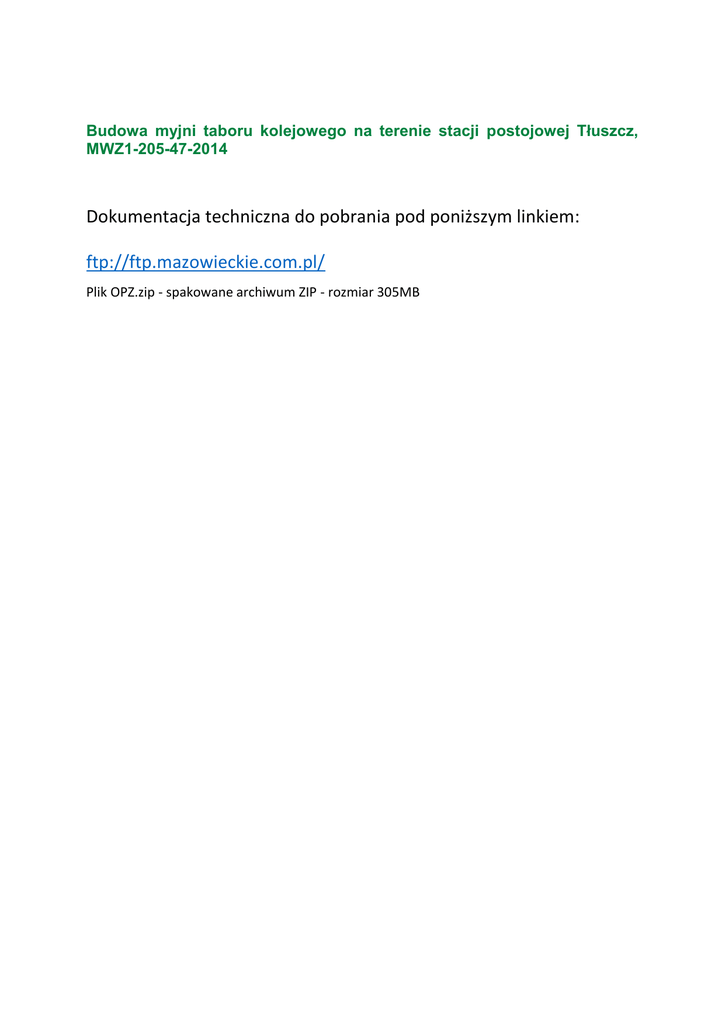 Budowa myjni taboru kolejowego na terenie stacji postojowej Tłuszcz, MWZ1-205-47-2014 Dokumentacja techniczna do pobrania pod poniższym linkiem: ftp://ftp.mazowieckie.com.pl/ Plik OPZ.zip - spakowane archiwum ZIP - rozmiar 305MB