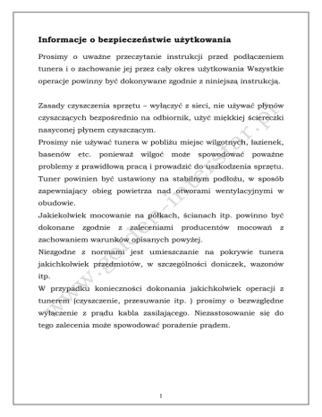 Informacje o bezpieczeństwie uŜytkowania Prosimy o uwaŜne przeczytanie instrukcji przed podłączeniem tunera i o zachowanie jej przez cały okres uŜytkowania Wszystkie operacje powinny być dokonywane zgodnie z niniejszą instrukcją. Zasady czyszczenia sprzętu – wyłączyć z sieci, nie uŜywać płynów czyszczących bezpośrednio na odbiornik, uŜyć miękkiej ściereczki nasyconej płynem czyszczącym. Prosimy nie uŜywać tunera w pobliŜu miejsc wilgotnych, łazienek, basenów etc. poniewaŜ wilgoć moŜe spowodować powaŜne problemy z prawidłową pracą i prowadzić do uszkodzenia sprzętu. Tuner powinien być ustawiony na stabilnym podłoŜu, w sposób zapewniający obieg powietrza nad otworami wentylacyjnymi w obudowie. Jakiekolwiek mocowanie na półkach, ścianach itp. powinno być dokonane zgodnie z zaleceniami producentów mocowań z zachowaniem warunków opisanych powyŜej. Niezgodne z normami jest umieszczanie na pokrywie tunera jakichkolwiek przedmiotów, w szczególności doniczek, wazonów itp. W przypadku konieczności dokonania jakichkolwiek operacji z tunerem (czyszczenie, przesuwanie itp. ) prosimy o bezwzględne wyłączenie z prądu kabla zasilającego. Niezastosowanie się do tego zalecenia moŜe spowodować poraŜenie prądem. 1 Spis treści 1. Wprowadzenie................................................................................................................ 4 1.1 Podstawowe parametry ........................................................................................... 4 1.2 Akcesoria .................................................................................................................... 5 2. Obsługa i cechy produktu ......................................................................................... 6 2.1 Panel przedni.............................................................................................................. 6 2.2 Panel tylny................................................................................................................... 7 2.3 Nadajnik zdalnego sterowania (pilot).................................................................. 9 3. Schemat podłączenia tunera .................................................................................. 12 3.1 Podłączenie do telewizora..................................................................................... 12 3.2 Podłączenie do telewizora oraz magnetowidu................................................ 12 3.3 Podłączenie do sprzętu audio.............................................................................. 13 3.4 Podłączenie do telewizora, magnetowidu oraz obrotnicy (Diseqc 1.2 lub USALS) ............................................................................................................................... 13 4. Obsługa tunera ........................................................................................................... 15 4.1 Informacje o odbieranym kanale ....................................................................... 15 4.2 Zmiana kanałów ...................................................................................................... 16 4.3 Poziom dźwięku ....................................................................................................... 16 4.4 Listy kanałów TV/Radio/Ulubione ................................................................... 17 4.5 Język Menu ............................................................................................................... 20 4.6 Zoom............................................................................................................................ 21 4.7 Teletekst ..................................................................................................................... 21 4.8 Napisy ekranowe ..................................................................................................... 22 5. Główne menu.................................................................................................................. 24 5.1 Instalacja ................................................................................................................... 24 5.1.1 Instalacja (konfiguracja anteny)................................................................. 24 5.1.2 Pozycja anteny (sterowanie obrotnicą) ..................................................... 29 5.2 Ustawienia Systemowe.......................................................................................... 32 5.2.1 Edycja kanałów................................................................................................ 32 5.2.2 Blokada rodzicielska ...................................................................................... 37 5.2.3 Ustawienia czasu............................................................................................. 39 5.2.4 Uaktualnienie odbiornika............................................................................. 41 5.2.5 Ustawienia fabryczne ..................................................................................... 42 5.2.6 Informacje o systemie .................................................................................... 42 5.2.7 Timer ................................................................................................................... 43 5.2.8 Klawisz Funkcyjny .......................................................................................... 45 5.2.9 Uaktualnienie oprogramowania przez USB............................................ 46 5.2.10 Lista USB – nieaktywne............................................................................. 46 5.3 Preferencje UŜytkownika ...................................................................................... 46 5.4 Gry ............................................................................................................................... 48 5.5 Interfejs moduł