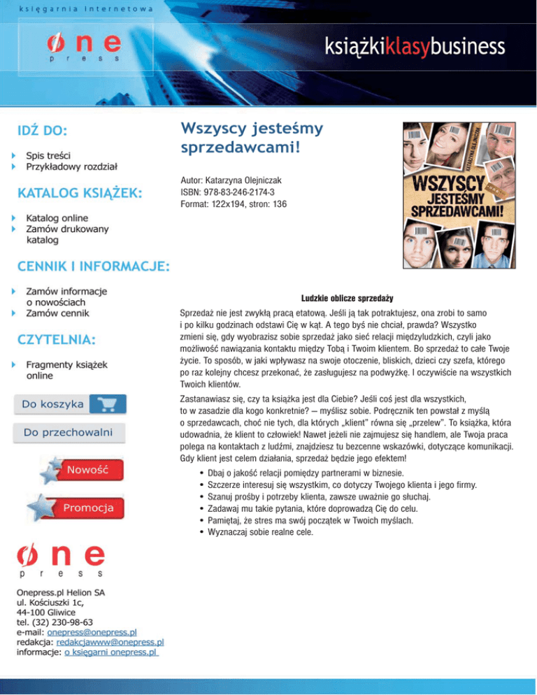 Wszyscy jesteśmy sprzedawcami! Autor: Katarzyna Olejniczak ISBN: 978-83-246-2174-3 Format: 122x194, stron: 136 Ludzkie oblicze sprzeda¿y Sprzeda¿ nie jest zwyk³¹ prac¹ etatow¹. Jeœli j¹ tak potraktujesz, ona zrobi to samo i po kilku godzinach odstawi Ciê w k¹t. A tego byœ nie chcia³, prawda? Wszystko zmieni siê, gdy wyobrazisz sobie sprzeda¿ jako sieæ relacji miêdzyludzkich, czyli jako mo¿liwoœæ nawi¹zania kontaktu miêdzy Tob¹ i Twoim klientem. Bo sprzeda¿ to ca³e Twoje ¿ycie. To sposób, w jaki wp³ywasz na swoje otoczenie, bliskich, dzieci czy szefa, którego po raz kolejny chcesz przekonaæ, ¿e zas³ugujesz na podwy¿kê. I oczywiœcie na wszystkich Twoich klientów. Zastanawiasz siê, czy ta ksi¹¿ka jest dla Ciebie? Jeœli coœ jest dla wszystkich, to w zasadzie dla kogo konkretnie? — myœlisz sobie. Podrêcznik ten powsta³ z myœl¹ o sprzedawcach, choæ nie tych, dla których „klient” równa siê „przelew”. To ksi¹¿ka, która udowadnia, ¿e klient to cz³owiek! Nawet je¿eli nie zajmujesz siê handlem, ale Twoja praca polega na kontaktach z ludŸmi, znajdziesz tu bezcenne wskazówki, dotycz¹ce komunikacji. Gdy klient jest celem dzia³ania, sprzeda¿ bêdzie jego efektem! • Dbaj o jakoœæ relacji pomiêdzy partnerami w biznesie. • Szczerze interesuj siê wszystkim, co dotyczy Twojego klienta i jego firmy. • Szanuj proœby i potrzeby klienta, zawsze uwa¿nie go s³uchaj. • Zadawaj mu takie pytania, które doprowadz¹ Ciê do celu. • Pamiêtaj, ¿e stres ma swój pocz¹tek w Twoich myœlach. • Wyznaczaj sobie realne cele. Spis treĂci WST P 5 1. SPRZEDA 11 2. PIERWSZE WRAENIE 23 3. TWÓJ KLIENT 49 4. SYSTEMY 59 5. TEMPERAMENT 65 6. KLUCZOWE PROGRAMY 69 7. ZAWSZE PAMI TAJ! 85 8. ORGANIZACJA 99 9. MAGIA PYTA 111 10. CO CI OGRANICZA? ZAKOCZENIE 121 131 TWÓJ KLIENT 49 ROZDZIA 3. TWÓJ KLIENT Jak ja nienawidz tego gocia! Jak czsto zdarzyo Ci si wypowiedzie takie lub podobne sowa o którym ze swoich klientów? Zapewne wielokrotnie. To dosy czste i zupenie niesuszne stwierdzenie nastawia Ci w bardzo negatywny sposób do kogo, kto przy odpowiednim traktowaniu moe zosta jednym z najlepszych i najwierniejszych Twoich klientów. Zastanawiasz si, czy to w ogóle moliwe? Zapewniam Ci, e tak. Sama nieraz w podobny sposób mylaam, a nawet wielokrotnie wypowiadaam gono takie sdy o kilku swoich klientach. Mówiam o nich w taki sposób do momentu, w którym zrozumiaam, co jest przyczyn sytuacji niezrozumienia pomidzy nami. Jak ju zapewne wiesz, najprzyjemniej i najswobodniej wspópracuje si z ludmi, których si lubi, czyli z takimi, którzy s do nas podobni. Podobiestw naley szuka na naprawd wielu poziomach, mog nimi by zainteresowania czy podobne spojrzenie na otaczajc rzeczywisto. Zdarza si je odnale na zupenie innym poziomie, na przykad w sposobie mówienia, czyli w podobnym zasobie 50 WSZYSCY JESTEMY SPRZEDAWCAMI! sów, tempie mowy. Dziki tym i wielu innym podobiestwom najzwyczajniej w wiecie zaczynasz lubi dan osob. Emocje, jakie wywouje w Tobie Twój klient i jakie Ty wywoujesz w nim, okazuj si niezwykle wane dla Waszej dalszej wspópracy. Jeli Ty nie znosisz swojego klienta, to pewne, e on te nie darzy Ci wielk sympati. W efekcie midzy Wami zaczynaj narasta nieporozumienia. Tymczasem w niezdrowej atmosferze cigych niedopowiedze nie uda si nawiza owocnej wspópracy. Pierwszy etap pracy nad Twoim biznesem to nawizanie jak najlepszych relacji pomidzy Tob a Twoim klientem. Pomyl, w jaki sposób tego dokona, jeli ju w pierwszej chwili midzy Wami nie zaiskrzyo. Rozwizanie jest bardzo proste: spraw, by Twój klient Ci pokocha! W tej chwili zapewne na Twojej twarzy maluje si promienny i lekko szyderczy umiech, a w gowie rodzi si podobnie nacechowana myl: Jasne, to zupenie proste… tylko jak to zrobi? Jeli taka bya Twoja pierwsza myl, masz racj. Jest to zupenie proste — ju za chwil poznasz kilka cennych wskazówek, w jaki sposób sprawi, by klient pokocha Ci jak adnego innego sprzedawc. Najpierw jednak opowiem Ci o tym, co mona zyska, jeli klient naprawd szczerze Ci polubi. O tym, e jedn z najistotniejszych kwestii jest sympatia, przekonaam si, kiedy postanowiam zmieni miejsce pracy. Zmieniam firm, ale nie bran. Kiedy przeno- TWÓJ KLIENT 51 siam si z firmy do firmy, kilku moich klientów przeszo razem ze mn. Zastanawiasz si, dlaczego nie wszyscy? Odpowied jest bardzo prosta: poniewa tylko cz z nich chciaam ze sob zabra. Decyzj o tym, których „zabieram ze sob”, a których nie, podjam oczywicie na podstawie tego, których sporód nich lubi najbardziej, bez systematycznych kontaktów z nimi czuabym si le. Poza tym uwaam, e zabieraj wszystko, co naznaczone ich nazwiskiem (a jeeli to moliwe — nawet wicej), tylko ci, którzy rozstaj si z firm w zoci, a ich najwiksz potrzeb jest pokazanie, e jej nie lubi, i zrobi wszystko, co tylko w ich mocy, eby uszczupli moliwoci znienawidzonej firmy. Cho w chwili mojego rozstania z firm faktycznie znalazoby si kilka osób, które otworzyyby szampana i witoway t okoliczno (moe nawet otworzyy?), byy te i takie osoby, którym po policzku spyna za. To osoby, dziki którym jestem w takim, a nie innym miejscu swojej kariery, od których nauczyam si wielu wanych rzeczy, które — dziki nim samym zreszt — kilka razy „pokonaam ich wasn broni”, za co oczywicie nie maj alu. Dlaczego tak rozczulam si nad tym dowiadczeniem? Poniewa jest to te bardzo cenna wskazówka dla Ciebie — nie tylko jako sprzedawcy, ale jako osoby, która czasem co zaczyna, a czasem koczy. Tu wanie przypomniao mi si ciekawe powiedzenie, które wydaje si najlepszym komentarzem do powyszych zda: Mczyzn poznaje si nie po tym, jak zaczyna, lecz po tym, jak koczy. Tak, wiem, znacznie bardziej stosowna bdzie parafraza tych sów. 52 WSZYSCY JESTEMY SPRZEDAWCAMI! A zatem jeszcze raz: Biznesmena poznaje si nie po tym, jak zaczyna, lecz po tym, jak koczy. Kocz zawsze w taki sposób, by byo warto o Tobie pamita. Czas wróci do gównego wtku. Mowa by