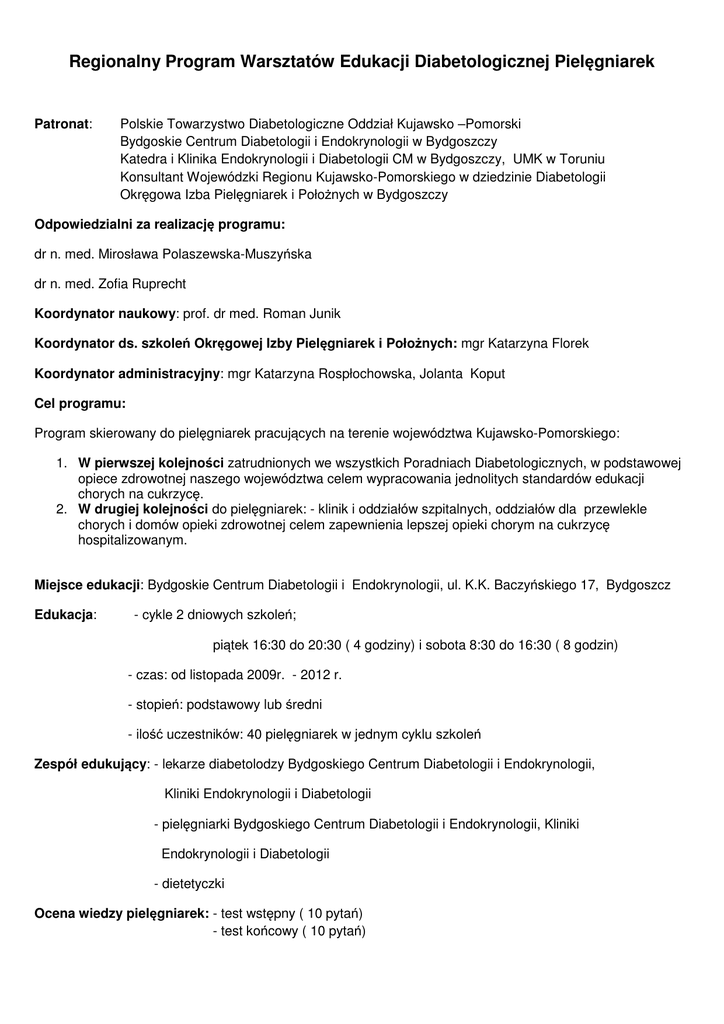 Regionalny Program Warsztatów Edukacji Diabetologicznej Pielęgniarek Patronat: Polskie Towarzystwo Diabetologiczne Oddział Kujawsko –Pomorski Bydgoskie Centrum Diabetologii i Endokrynologii w Bydgoszczy Katedra i Klinika Endokrynologii i Diabetologii CM w Bydgoszczy, UMK w Toruniu Konsultant Wojewódzki Regionu Kujawsko-Pomorskiego w dziedzinie Diabetologii Okręgowa Izba Pielęgniarek i Położnych w Bydgoszczy Odpowiedzialni za realizację programu: dr n. med. Mirosława Polaszewska-Muszyńska dr n. med. Zofia Ruprecht Koordynator naukowy: prof. dr med. Roman Junik Koordynator ds. szkoleń Okręgowej Izby Pielęgniarek i Położnych: mgr Katarzyna Florek Koordynator administracyjny: mgr Katarzyna Rospłochowska, Jolanta Koput Cel programu: Program skierowany do pielęgniarek pracujących na terenie województwa Kujawsko-Pomorskiego: 1. W pierwszej kolejności zatrudnionych we wszystkich Poradniach Diabetologicznych, w podstawowej opiece zdrowotnej naszego województwa celem wypracowania jednolitych standardów edukacji chorych na cukrzycę. 2. W drugiej kolejności do pielęgniarek: - klinik i oddziałów szpitalnych, oddziałów dla przewlekle chorych i domów opieki zdrowotnej celem zapewnienia lepszej opieki chorym na cukrzycę hospitalizowanym. Miejsce edukacji: Bydgoskie Centrum Diabetologii i Endokrynologii, ul. K.K. Baczyńskiego 17, Bydgoszcz Edukacja: - cykle 2 dniowych szkoleń; piątek 16:30 do 20:30 ( 4 godziny) i sobota 8:30 do 16:30 ( 8 godzin) - czas: od listopada 2009r. - 2012 r. - stopień: podstawowy lub średni - ilość uczestników: 40 pielęgniarek w jednym cyklu szkoleń Zespół edukujący: - lekarze diabetolodzy Bydgoskiego Centrum Diabetologii i Endokrynologii, Kliniki Endokrynologii i Diabetologii - pielęgniarki Bydgoskiego Centrum Diabetologii i Endokrynologii, Kliniki Endokrynologii i Diabetologii - dietetyczki Ocena wiedzy pielęgniarek: - test wstępny ( 10 pytań) - test końcowy ( 10 pytań) Piątek 16:00- 20:30 16:00 - 16:30 Rejestracja uczestników, podział na grupy warsztatowe Ankieta Lunch Test 10 pytań – 10 minut 16:30- 17:40 Wykłady (1 godzina i 10 minut) 16:30 -16:50 Podstawowe wiadomości na temat cukrzycy - definicja, objawy, typy cukrzycy, wykrywanie cukrzycy, przebieg choroby, terapia wieloczynnikowa w cukrzycy. Przegląd nowości (20 min) 16:50 -17:20 Ogólne zasady żywienia i planowanie posiłków w cukrzycy - składniki pokarmowe, zapotrzebowanie kaloryczne, rozkład węglowodanów w diecie, ograniczenia dietetyczne ( 30 minut) 17:20 -17:40 Insulinoterapia: działanie insuliny, rodzaje insulin, profile ich działania, modele insulinoterapii. Przegląd nowości (20 min) 17:40 -17:50 Przerwa na kawę 17:50 – 20:25 17:50 - 18:25 Warsztaty ( 2 godziny 45 minut) Warsztat I - ( 35 min) Dieta – obliczanie należnej masy ciała, obliczanie WHR, określanie wskaźnika masy ciała, obliczanie zapotrzebowania kalorycznego, wymienniki węglowodanowe, wymienniki białkowo – tłuszczowe, indeks glikemiczny, ładunek glikemiczny 18:30 - 19:05 Warsztat II - ( 35 min) Dieta - praktyczne przygotowanie posiłków w oparciu o atrapy produktów, dieta p/miażdżycowa, produkty dla diabetyków 19:10 - 19:45 Warsztat III - ( 35 min) Insulinoterapia - technika podawania insuliny, miejsca podawania insuliny, mieszanie insulin, relacja insulina a posiłek, przechowywanie insuliny, obsługa wstrzykiwaczy i praktyczne podanie insuliny 19:50 - 20:25 Warsztat IV - ( 35 min) Insulinoterapia - modyfikacja dawek insuliny, wpływ wysiłku fizycznego na zapotrzebowanie na insulinę Sobota 8:00 -16:30 8:00- 8:20 Rejestracja uczestników, podział na grupy Śniadanie 8:20- 10:20 Wykłady ( 2 godziny) 10:20 – 10:40 Leki doustne w leczeniu cukrzycy (20 min) 10:40 – 11:00 Hipoglikemia – definicja, przyczyny, objawy, postępowanie w zależności od czasu trwania, zapobieganie, wyciąganie wniosków z niedocukrzeń (20 min) 11:00 – 11:20 Hiperglikemia – definicja, przyczyny, objawy, postępowanie w trakcie dodatkowej choroby (20 min) 11:20 – 11:40 Omówienie kryteriów wyrównania cukrzycy (20 min). 11:40: 12:00 Późne powikłania cukrzycy, znaczenie właściwego leczenia i wyrównania cukrzycy oraz współdziałania chorego w ich zapobieganiu poprzez samokontrolę i modyfikację leczenia (20 min) 12:00 – 12:20 Promocja zdrowego stylu życia. Znaczenie aktywności fizycznej w leczeniu cukrzycy. Zapobieganie otyłości (20 min). 10:20- 10:35 Przerwa na kawę 10:35-16:15 Warsztaty (5 godzin) 10:35- 11:35 Warsztat I - (60 minut) Hipoglikemia – scenka, praktyczne postępowanie w hipoglikemii, technika podawania glukagonu. Wszystko co powinno się wiedzieć na temat insulin. 11:40-12:40 Warsztat II - (60 minut) Ogólne zasady prowadzenia samokontroli glikemii, ketonemii cukromoczu i ketonurii. Technika pomiaru ciśnienia tętniczego, technika nakłucia opuszki palca. Prowadzenie zeszytu samokontroli, interpretacja wydruków komputerowych z glukometrów . Obsługa glukometrów. Interpretacja przypadków ( cukrzyca, zespół metaboliczny). 12:45 -13:00 Przerwa na kawę 13:05- 14:05 Warsztat III- (60 minut) Układanie diety z uwzględnieniem WW- dla pacjentów leczonych metodą intensywnej insulinoterapii i metodą wielokrotnych wstrzyknięć insulin (4-5). Interpretacja profilów glikemii, modyfikacja wymienników węglowodanowych i modyfikacja dawek insuliny. 14:10 -15:10 Warsztat IV- (60 minut) Film- (10 minut) Pielęgnacja i badanie stóp u chorego na cukrzycę. Co możemy zrobić aby zmniejszyć ilość amputacji 15:15- 16:15 Warsztat V- (60 minut) Układanie diety dla pacjenta z cukrzycą typu 2 i otyłością leczonych lekami doustnymi. Układanie diety dla pacjenta z nefropatią cukrzycową i białkomoczem Umiejętność posługiwania się tabelami WW, znajomość indeksów glikemicznych, znajomość kaloryczności posiłków, praca na atrapach 16:15 -16:30 Podsumowanie Ankieta 16:30 Lunch