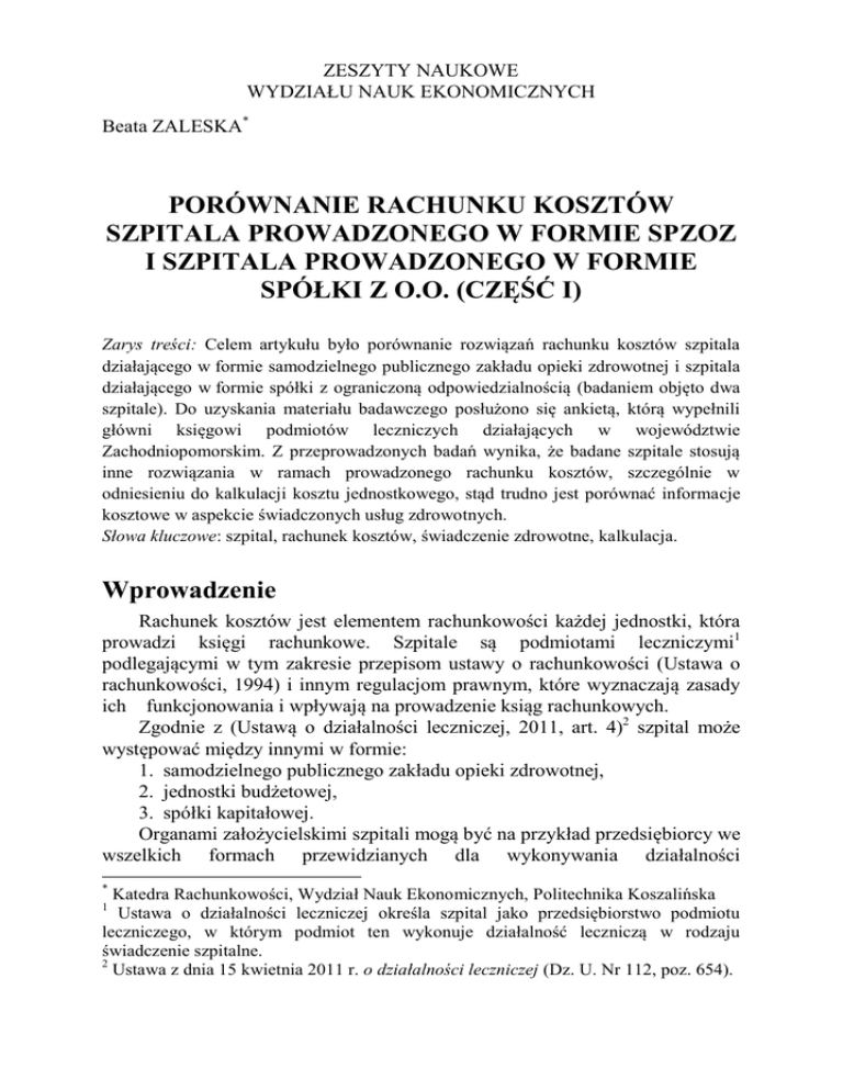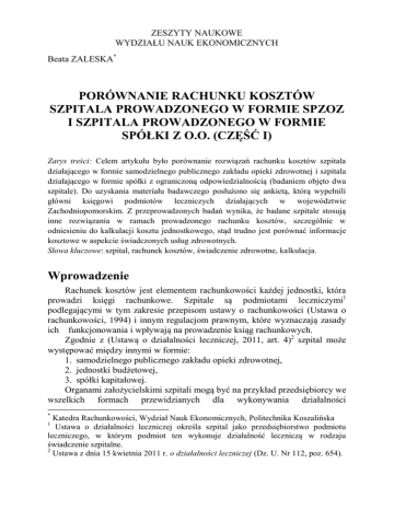 ZESZYTY NAUKOWE WYDZIAŁU NAUK EKONOMICZNYCH Beata ZALESKA* PORÓWNANIE RACHUNKU KOSZTÓW SZPITALA PROWADZONEGO W FORMIE SPZOZ I SZPITALA PROWADZONEGO W FORMIE SPÓŁKI Z O.O. (CZĘŚĆ I) Zarys treści: Celem artykułu było porównanie rozwiązań rachunku kosztów szpitala działającego w formie samodzielnego publicznego zakładu opieki zdrowotnej i szpitala działającego w formie spółki z ograniczoną odpowiedzialnością (badaniem objęto dwa szpitale). Do uzyskania materiału badawczego posłużono się ankietą, którą wypełnili główni księgowi podmiotów leczniczych działających w województwie Zachodniopomorskim. Z przeprowadzonych badań wynika, że badane szpitale stosują inne rozwiązania w ramach prowadzonego rachunku kosztów, szczególnie w odniesieniu do kalkulacji kosztu jednostkowego, stąd trudno jest porównać informacje kosztowe w aspekcie świadczonych usług zdrowotnych. Słowa kluczowe: szpital, rachunek kosztów, świadczenie zdrowotne, kalkulacja. Wprowadzenie Rachunek kosztów jest elementem rachunkowości każdej jednostki, która prowadzi księgi rachunkowe. Szpitale są podmiotami leczniczymi1 podlegającymi w tym zakresie przepisom ustawy o rachunkowości (Ustawa o rachunkowości, 1994) i innym regulacjom prawnym, które wyznaczają zasady ich funkcjonowania i wpływają na prowadzenie ksiąg rachunkowych. Zgodnie z (Ustawą o działalności leczniczej, 2011, art. 4)2 szpital może występować między innymi w formie: 1. samodzielnego publicznego zakładu opieki zdrowotnej, 2. jednostki budżetowej, 3. spółki kapitałowej. Organami założycielskimi szpitali mogą być na przykład przedsiębiorcy we wszelkich formach przewidzianych dla wykonywania działalności * Katedra Rachunkowości, Wydział Nauk Ekonomicznych, Politechnika Koszalińska Ustawa o działalności leczniczej określa szpital jako przedsiębiorstwo podmiotu leczniczego, w którym podmiot ten wykonuje działalność leczniczą w rodzaju świadczenie szpitalne. 2 Ustawa z dnia 15 kwietnia 2011 r. o działalności leczniczej (Dz. U. Nr 112, poz. 654). 1 90 Beata Zaleska gospodarczej3, jeżeli ustawa nie stanowi inaczej, Skarb Państwa reprezentowany przez ministra, centralny organ administracji rządowej albo wojewodę, jednostka samorządu terytorialnego czy uczelnia medyczna. Zasady funkcjonowania samodzielnych publicznych zakładów opieki zdrowotnej są bardziej sformalizowane niż spółek kapitałowych4. Przykładem jest obowiązujące do 1 lipca 2011 roku Rozporządzenie Ministra Zdrowia i Opieki Społecznej w sprawie szczegółowych zasad rachunku kosztów w publicznych zakładach opieki zdrowotnej z 1998 roku, które dotyczyło szpitali prowadzonych w formie samodzielnych publicznych zakładów opieki zdrowotnej. Obecnie trwają prace nad nowym rachunkiem kosztów, który zgodnie z opublikowanym projektem z dnia 15.07.2011 roku ustawy o zmianie ustawy o świadczeniach opieki zdrowotnej finansowanej ze środków publicznych oraz niektórych innych ustaw i uzasadnieniem do tego projektu5 obowiązywałby od 1 stycznia 2014 roku. Obowiązkowo stosowałyby go jednostki, które sprawozdawałyby dane kosztowe do instytucji zajmującej się wyceną świadczeń medycznych. Podmioty lecznicze do prowadzenia działalności medycznej wykorzystują przede wszystkim środki publiczne pochodzące ze składek ubezpieczenia społecznego. Powinny więc stosować jednolite zasady rachunku kosztów, co umożliwiłoby porównywanie informacji kosztowej i ocenę wykorzystania posiadanych zasobów. Celem artykułu jest próba porównania niektórych rozwiązań rachunku kosztów, które są stosowane w szpitalu prowadzonym w formie samodzielnego publicznego zakładu opieki zdrowotnej z rozwiązaniami rachunku kosztów stosowanymi w szpitalu prowadzonym w formie spółki z ograniczoną odpowiedzialnością (badaniem objęto dwa szpitale). Porównanie dokonane zostało w świetle rozwiązań obowiązującego do niedawna Rozporządzenia Ministra Zdrowia i Opieki Społecznej (Rozporządzenie MZIOS) w sprawie szczegółowych zasad rachunku kosztów w publicznych zakładach opieki zdrowotnej6. Do zebrania materiału badawczego posłużono się ankietą. Artykuł przedstawia pierwszą część wniosków z przeprowadzonych badań. 3 Formy przewidziane prawem to spółki prawa cywilnego (cywilna i cicha), spółki prawa handlowego: osobowe (jawna, partnerska, komandytowa i komandytowoakcyjna), kapitałowe (spółka z ograniczoną odpowiedzialnością i akcyjna). 4 Więcej na ten temat w (Zaleska, 2012, s. 379-383). 5 Informacje pozyskane ze strony internetowej Ministerstwa Zdrowia http://www.mz.gov.pl. 6 Badanie dotyczące zgodności prowadzonego rachunku kosztów z rozporządzeniem przeprowadziło w 2010 roku Ministerstwo Zdrowia w publicznych zakładach, dla których jest organem założycielskim (47 szpitali). W badaniu skoncentrowano się także na sposobie wykorzystania informacji o kosztach jednostkowych w zarządzaniu szpitalem (Baran, 2010). Porównanie rachunku kosztów… 91 Opis metody badawczej W badaniu wykorzystano ankietę, która składała się z pięciu części. W pierwszej części umieszczono pytania identyfikujące jednostkę (takie jak: forma organizacyjno-prawna, organ założycielski, wielkość miejscowości, w której funkcjonuje badana jednostka, rodzaj udzielanych świadczeń zdrowotnych itp7.). Druga część ankiety dotyczyła źródeł finansowania działalności medycznej, które należało uporządkować w kolejności od największej wartości do najmniejszej. Zawierała też pytania wskazujące metody finansowania świadczeń medycznych, stosowane przez publicznego płatnika czyli Narodowy Fundusz Zdrowia. W tej części ankiety należało podać dane finansowe takie jak przychody, koszty, wynik finansowy z roku 2011. Część trzecia zawierała pytania pozwalające na rozpoznanie czynności wykonywanych przez szpital w celu ustalenia cen świadczeń zdrowotnych. C