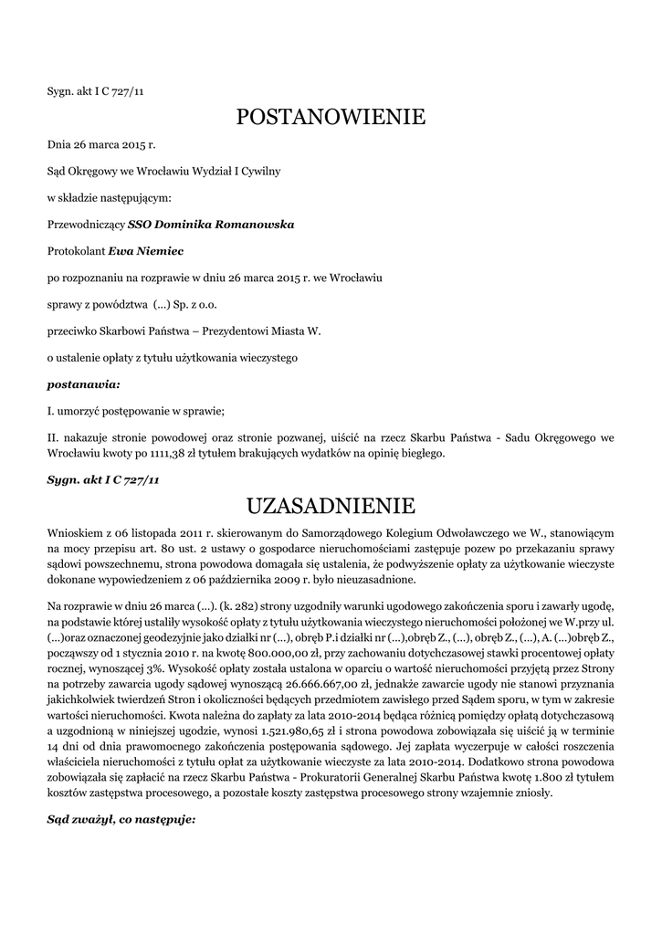 Sygn. akt I C 727/11 POSTANOWIENIE Dnia 26 marca 2015 r. Sąd Okręgowy we Wrocławiu Wydział I Cywilny w składzie następującym: Przewodniczący SSO Dominika Romanowska Protokolant Ewa Niemiec po rozpoznaniu na rozprawie w dniu 26 marca 2015 r. we Wrocławiu sprawy z powództwa (...) Sp. z o.o. przeciwko Skarbowi Państwa – Prezydentowi Miasta W. o ustalenie opłaty z tytułu użytkowania wieczystego postanawia: I. umorzyć postępowanie w sprawie; II. nakazuje stronie powodowej oraz stronie pozwanej, uiścić na rzecz Skarbu Państwa - Sadu Okręgowego we Wrocławiu kwoty po 1111,38 zł tytułem brakujących wydatków na opinię biegłego. Sygn. akt I C 727/11 UZASADNIENIE Wnioskiem z 06 listopada 2011 r. skierowanym do Samorządowego Kolegium Odwoławczego we W., stanowiącym na mocy przepisu art. 80 ust. 2 ustawy o gospodarce nieruchomościami zastępuje pozew po przekazaniu sprawy sądowi powszechnemu, strona powodowa domagała się ustalenia, że podwyższenie opłaty za użytkowanie wieczyste dokonane wypowiedzeniem z 06 października 2009 r. było nieuzasadnione. Na rozprawie w dniu 26 marca (...). (k. 282) strony uzgodniły warunki ugodowego zakończenia sporu i zawarły ugodę, na podstawie której ustaliły wysokość opłaty z tytułu użytkowania wieczystego nieruchomości położonej we W.przy ul. (...)oraz oznaczonej geodezyjnie jako działki nr (...), obręb P.i działki nr (...),obręb Z., (...), obręb Z., (...), A. (...)obręb Z., począwszy od 1 stycznia 2010 r. na kwotę 800.000,00 zł, przy zachowaniu dotychczasowej stawki procentowej opłaty rocznej, wynoszącej 3%. Wysokość opłaty została ustalona w oparciu o wartość nieruchomości przyjętą przez Strony na potrzeby zawarcia ugody sądowej wynoszącą 26.666.667,00 zł, jednakże zawarcie ugody nie stanowi przyznania jakichkolwiek twierdzeń Stron i okoliczności będących przedmiotem zawisłego przed Sądem sporu, w tym w zakresie wartości nieruchomości. Kwota należna do zapłaty za lata 2010-2014 będąca różnicą pomiędzy opłatą dotychczasową a uzgodnioną w niniejszej ugodzie, wynosi 1.521.980,65 zł i strona powodowa zobowiązała się uiścić ją w terminie 14 dni od dnia prawomocnego zakończenia postępowania sądowego. Jej zapłata wyczerpuje w całości roszczenia właściciela nieruchomości z tytułu opłat za użytkowanie wieczyste za lata 2010-2014. Dodatkowo strona powodowa zobowiązała się zapłacić na rzecz Skarbu Państwa - Prokuratorii Generalnej Skarbu Państwa kwotę 1.800 zł tytułem kosztów zastępstwa procesowego, a pozostałe koszty zastępstwa procesowego strony wzajemnie zniosły. Sąd zważył, co następuje: Zgodnie z art. 355 § 1 k.p.c. w zw. z art. 13 § 2 k.p.c. Sąd wydaje postanowienie o umorzeniu postępowania jeżeli wydanie postanowienia kończącego postępowanie stało się z innych przyczyn zbędne lub niedopuszczalne. Jedną z przesłanek umorzenia postępowania z powodu niedopuszczalności wydania merytorycznego rozstrzygnięcia jest zawarcie przez strony w toku postępowania ugody sądowej. W myśl art. 10 k.p.c. w sprawach, w których zawarcie ugody jest dopuszczalne, sąd powinien w każdym stanie postępowania dążyć do ich ugodowego załatwienia. Artykuł 223 § 1 k.p.c. stanowi z kolei, iż przewodniczący powinien we właściwej chwili skłaniać strony do pojednania, zwłaszcza na pierwszym posiedzeniu, po wstępnym wyjaśnieniu stanowiska stron. Osnowa ugody zawartej przed sądem powinna być wciągnięta do protokołu rozprawy i stwierdzona podpisami stron. Podobnie jak przy innych aktach dyspozycyjnych stron Sąd może uznać zawarcie ugody za niedopuszczalne tylko wtedy, gdy okoliczności sprawy wskazują, że wymienione czynności są sprzeczne z prawem lub zasadami współżycia społecznego albo zmierzają do obejścia prawa (art. 203 § 4 k.p.c.). Mając zatem na uwadze fakt zawarcia w niniejszej sprawie ugody pomiędzy stronami w pierwszym rzędzie należało podkreślić charakter prawny tej czynności, jako bezpośrednio wpływającej na wydane przez Sąd w niniejszej sprawie postanowienie o umorzeniu postępowania. Ugoda sądowa jest bowiem szczególnym aktem prawnym o złożonym charakterze, w którym występują zarówno elementy materialnoprawne jak i procesowe. Z jednej strony składane przez strony oświadczenia są czynnościami materialnoprawnymi zmierzającymi do wywołania skutków w dziedzinie prawa materialnego. Zawarte porozumienie jest ugodą w rozumieniu art. 917 k.c. i będzie w związku z tym oceniane według przepisów prawa materialnego. Z drugiej natomiast strony ugoda sądowa jest czynnością procesową, składane bowiem przez strony oświadczenia są oświadczeniami procesowymi zmierzającymi do zakończenia postępowania poprzez jego umorzenie. Ugoda zatem jest oceniana także według przepisów procesowych. Innymi słowy ugoda jest czynnością stron podjętą w celu osiągnięcia skutków materialnoprawnych przewidzianych w art. 917 k.c., w szczególności dla uchylenia sporu w zakresie istniejącego między stronami stosunku prawnego i w drodze wzajemnego porozumienia oraz w celu osiągnięcia skutków procesowych w postaci wyłączenia sporu spod rozstrzygnięcia przez umorzenie postępowania. Tak więc ugoda sądowa, jako akt prawny złożony, składa się z następujących czynności prawnych stron: - ugody cywilnoprawnej (art. 917 k.c.) zawartej przed sądem w toku postępowania, dotyczącej istniejącego między stronami stosunku prawnego stanowiącego podstawę powództwa czy też wniosku w danym postępowaniu, - dorozumianych procesowych oświadczeń woli stron kierowanych do sądu – tej treści, że strony z powodu zawarcia ugody likwidującej ich spór in merito żądają umorzenia postępowania. Każda z tych dwóch czynności prawnych podlega ocenie według przepisów normujących tę gałąź prawa do której dana czynności należy. Zatem ważność i skuteczność ugody cywilnopraw
