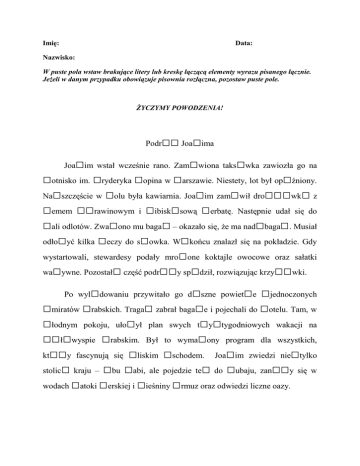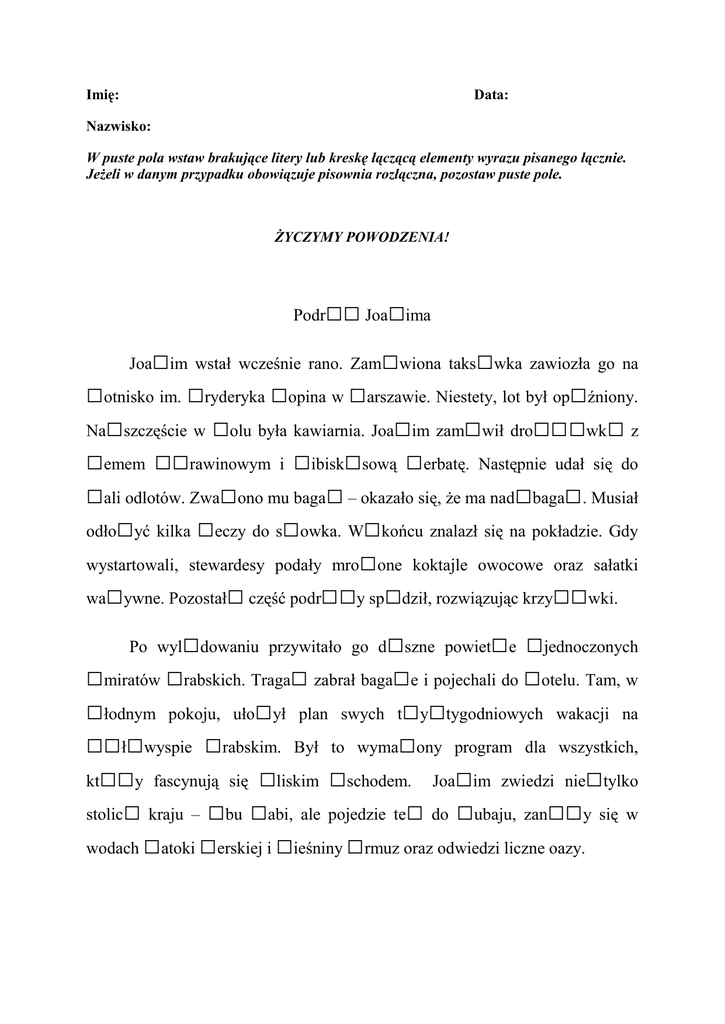 Imię: Data: Nazwisko: W puste pola wstaw brakujące litery lub kreskę łączącą elementy wyrazu pisanego łącznie. Jeżeli w danym przypadku obowiązuje pisownia rozłączna, pozostaw puste pole. ŻYCZYMY POWODZENIA! Podr □□ Joa□ima □im wstał wcześnie rano. Zam□wiona taks□wka zawiozła go na □otnisko im. □ryderyka □opina w □arszawie. Niestety, lot był op□źniony. Na□szczęście w □olu była kawiarnia. Joa□im zam□wił dro□□□wk□ z □emem □□rawinowym i □ibisk□sową □erbatę. Następnie udał się do □ali odlotów. Zwa□ono mu baga□ – okazało się, że ma nad□baga□. Musiał odło□yć kilka □eczy do s□owka. W□końcu znalazł się na pokładzie. Gdy wystartowali, stewardesy podały mro□one koktajle owocowe oraz sałatki wa□ywne. Pozostał□ część podr□□y sp□dził, rozwiązując krzy□□wki. Joa □dowaniu przywitało go d□szne powiet□e □jednoczonych □miratów □rabskich. Traga□ zabrał baga□e i pojechali do □otelu. Tam, w □łodnym pokoju, uło□ył plan swych t□y□tygodniowych wakacji na □□ł□wyspie □rabskim. Był to wyma□ony program dla wszystkich, kt□□y fascynują się □liskim □schodem. Joa□im zwiedzi nie□tylko stolic□ kraju – □bu □abi, ale pojedzie te□ do □ubaju, zan□□y się w wodach □atoki □erskiej i □ieśniny □rmuz oraz odwiedzi liczne oazy. Po wyl Podróż Joachima Joachim wstał wcześnie rano. Zamówiona taksówka zawiozła go na Lotnisko im. Fryderyka Chopina w Warszawie. Niestety, lot był opóźniony. Na szczęście w holu była kawiarnia. Joachim zamówił drożdżówkę z dżemem żurawinowym i hibiskusową herbatę. Następnie udał się do hali odlotów. Zważono mu bagaż – okazało się, że ma nadbagaż. Musiał odłożyć kilka rzeczy do schowka. W końcu znalazł się na pokładzie. Gdy wystartowali, stewardesy podały mrożone koktajle owocowe oraz sałatki warzywne. Pozostałą część podróży spędził, rozwiązując krzyżówki. Po wylądowaniu przywitało go duszne powietrze Zjednoczonych Emiratów Arabskich. Tragarz zabrał bagaże i pojechali do hotelu. Tam, w chłodnym pokoju, ułożył plan swych trzytygodniowych wakacji na Półwyspie Arabskim. Był to wymarzony program dla wszystkich, którzy fascynują się Bliskim Wschodem. Joachim zwiedzi nie tylko stolicę kraju – Abu Zabi, ale pojedzie też do Dubaju, zanurzy się w wodach Zatoki Perskiej i Cieśniny Ormuz oraz odwiedzi liczne oazy. POWRÓT