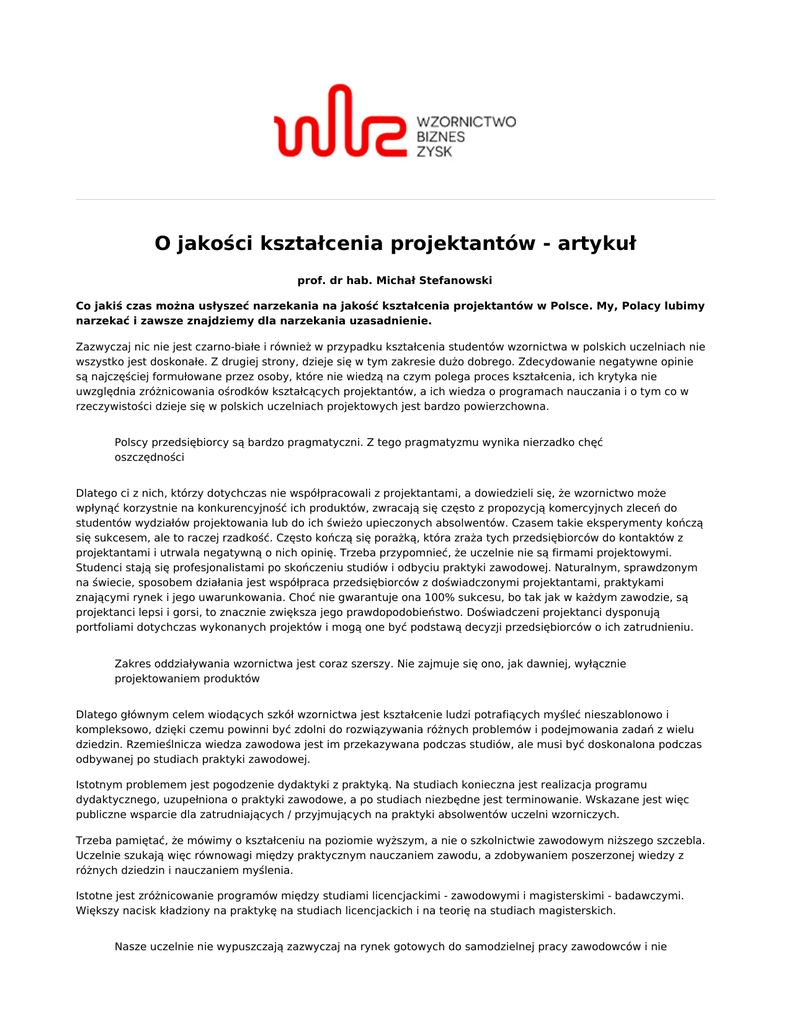 O jakości kształcenia projektantów - artykuł prof. dr hab. Michał Stefanowski Co jakiś czas można usłyszeć narzekania na jakość kształcenia projektantów w Polsce. My, Polacy lubimy narzekać i zawsze znajdziemy dla narzekania uzasadnienie. Zazwyczaj nic nie jest czarno-białe i również w przypadku kształcenia studentów wzornictwa w polskich uczelniach nie wszystko jest doskonałe. Z drugiej strony, dzieje się w tym zakresie dużo dobrego. Zdecydowanie negatywne opinie są najczęściej formułowane przez osoby, które nie wiedzą na czym polega proces kształcenia, ich krytyka nie uwzględnia zróżnicowania ośrodków kształcących projektantów, a ich wiedza o programach nauczania i o tym co w rzeczywistości dzieje się w polskich uczelniach projektowych jest bardzo powierzchowna. Polscy przedsiębiorcy są bardzo pragmatyczni. Z tego pragmatyzmu wynika nierzadko chęć oszczędności Dlatego ci z nich, którzy dotychczas nie współpracowali z projektantami, a dowiedzieli się, że wzornictwo może wpłynąć korzystnie na konkurencyjność ich produktów, zwracają się często z propozycją komercyjnych zleceń do studentów wydziałów projektowania lub do ich świeżo upieczonych absolwentów. Czasem takie eksperymenty kończą się sukcesem, ale to raczej rzadkość. Często kończą się porażką, która zraża tych przedsiębiorców do kontaktów z projektantami i utrwala negatywną o nich opinię. Trzeba przypomnieć, że uczelnie nie są firmami projektowymi. Studenci stają się profesjonalistami po skończeniu studiów i odbyciu praktyki zawodowej. Naturalnym, sprawdzonym na świecie, sposobem działania jest współpraca przedsiębiorców z doświadczonymi projektantami, praktykami znającymi rynek i jego uwarunkowania. Choć nie gwarantuje ona 100% sukcesu, bo tak jak w każdym zawodzie, są projektanci lepsi i gorsi, to znacznie zwiększa jego prawdopodobieństwo. Doświadczeni projektanci dysponują portfoliami dotychczas wykonanych projektów i mogą one być podstawą decyzji przedsiębiorców o ich zatrudnieniu. Zakres oddziaływania wzornictwa jest coraz szerszy. Nie zajmuje się ono, jak dawniej, wyłącznie projektowaniem produktów Dlatego głównym celem wiodących szkół wzornictwa jest kształcenie ludzi potrafiących myśleć nieszablonowo i kompleksowo, dzięki czemu powinni być zdolni do rozwiązywania różnych problemów i podejmowania zadań z wielu dziedzin. Rzemieślnicza wiedza zawodowa jest im przekazywana podczas studiów, ale musi być doskonalona podczas odbywanej po studiach praktyki zawodowej. Istotnym problemem jest pogodzenie dydaktyki z praktyką. Na studiach konieczna jest realizacja programu dydaktycznego, uzupełniona o praktyki zawodowe, a po studiach niezbędne jest terminowanie. Wskazane jest więc publiczne wsparcie dla zatrudniających / przyjmujących na praktyki absolwentów uczelni wzorniczych. Trzeba pamiętać, że mówimy o kształceniu na poziomie wyższym, a nie o szkolnictwie zawodowym niższego szczebla. Uczelnie szukają więc równowagi między praktycznym nauczaniem zawodu, a zdobywaniem poszerzonej wiedzy z różnych dziedzin i nauczaniem myślenia. Istotne jest zróżnicowanie programów między studiami licencjackimi - zawodowymi i magisterskimi - badawczymi. Większy nacisk kładziony na praktykę na studiach licencjackich i na teorię na studiach magisterskich. Nasze uczelnie nie wypuszczają zazwyczaj na rynek gotowych do samodzielnej pracy zawodowców i nie jest to tylko specyfika polska. Taka jest specyfika dobrych szkół wzornictwa na świecie i na ich tle polskie uczelnie wzornicze wypadają całkiem nieźle Oczywiście są rzeczy, które trzeba polepszyć: potrzeba więcej praktyk zawodowych i wiedzy o otoczeniu rynkowym, a także więcej pracy zespołowej. Systemowa oferta nauczania powinna zostać poszerzona o nowe obszary, takie jak usługi czy projektowanie interfejsów. Trzeba też pamiętać, że szkół wzornictwa w Polsce jest wiele. Większość Wydziałów Wzornictwa polskich szkół publicznych utworzono w Akademiach Sztuk Pięknych. Ma to swoje wady i zalety. Taka lokalizacja nie sprzyja podejściu rynkowo-biznesowemu i technicznemu. Szkolenie artystyczne nastawione jest często na kształcenie wybitnych jednostek, a w mniejszym stopniu na pracę zespołową. Większość Wydziałów Wzornictwa radzi sobie z tymi problemami, ale powinny kłaść na ich rozwiązanie jeszcze większy nacisk. Z drugiej strony, od projektantów wzornictwa oczekuje się w coraz większym stopniu kreatywności i przełamywania istniejących schematów. A do takich zadań kształcenie na Akademiach Sztuk Pięknych nadaje się znakomicie. Wydziały Wzornictwa są zlokalizowane w uczelniach publicznych i prywatnych. Czasem na politechnikach i w uczelniach innego typu. Są szkoły lepsze i gorsze. Znam większość uczelni publicznych w Polsce i wiele uczelni zagranicznych. Porównując je bardzo łatwo stwierdzić, że jakość kształcenia wielu polskich uczelni jest dobra. Co nie znaczy, że wszystkich i że nie może i nie powinno być lepiej. Rynek dla absolwentów jest trudny. Motywy wybierania kierunku nauczania i plany studentów na przyszłość są różne. Niektórzy z nich już na studiach kierują się w stronę rzemiosła i planują uruchomienie własnej produkcji. Jednocześnie coraz większa grupa deklaruje zainteresowanie wzornictwem związanym z prawdziwym przemysłem Dobrze jest jeśli część studentów chce iść swoją niekonwencjonalną drogą. Ważne są jednak proporcje i budowanie równowagi. W kontekście obecnej sytuacji poza oczywistym doskonaleniem kreatywności bardzo istotne jest przygotowanie studentów do funkcjonowania na rynku, praktyki zawodowe, zajęcia dotyczące zarządzania, prowadzenia firmy, finansów. Dzisiejsi studenci są coraz bardziej świadomi sytuacji w Polsce i za granicą. Zdają sobie sprawę z szybko zmieniającego się otoczenia, uczenia się nowy