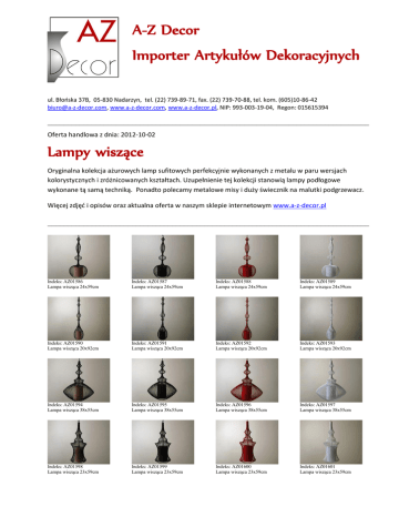 A-Z Decor Importer Artykułów Dekoracyjnych ul. Błońska 37B, 05-830 Nadarzyn, tel. (22) 739-89-71, fax. (22) 739-70-88, tel. kom. (605)10-86-42 [email protected], www.a-z-decor.com, www.a-z-decor.pl, NIP: 993-003-19-04, Regon: 015615394 ________________________________________________________________________________ Oferta handlowa z dnia: 2012-10-02 Lampy wiszące Oryginalna kolekcja ażurowych lamp sufitowych perfekcyjnie wykonanych z metalu w paru wersjach kolorystycznych i zróżnicowanych kształtach. Uzupełnienie tej kolekcji stanowią lampy podłogowe wykonane tą samą techniką. Ponadto polecamy metalowe misy i duży świecznik na malutki podgrzewacz. Więcej zdjęć i opisów oraz aktualna oferta w naszym sklepie internetowym www.a-z-decor.pl ________________________________________________________________________________ Indeks: AZ01586 Lampa wisząca 24x59cm Indeks: AZ01587 Lampa wisząca 24x59cm Indeks: AZ01588 Lampa wisząca 24x59cm Indeks: AZ01589 Lampa wisząca 24x59cm Indeks: AZ01590 Lampa wisząca 20x92cm Indeks: AZ01591 Lampa wisząca 20x92cm Indeks: AZ01592 Lampa wisząca 20x92cm Indeks: AZ01593 Lampa wisząca 20x92cm Indeks: AZ01594 Lampa wisząca 38x55cm Indeks: AZ01595 Lampa wisząca 38x55cm Indeks: AZ01596 Lampa wisząca 38x55cm Indeks: AZ01597 Lampa wisząca 38x55cm Indeks: AZ01598 Lampa wisząca 23x59cm Indeks: AZ01599 Lampa wisząca 23x59cm Indeks: AZ01600 Lampa wisząca 23x59cm Indeks: AZ01601 Lampa wisząca 23x59cm