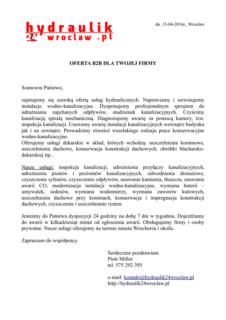 dn. 15-04-2016r., Wrocław OFERTA B2B DLA TWOJEJ FIRMY Szanowni Państwo, zajmujemy się szeroką ofertą usług hydraulicznych. Naprawiamy i serwisujemy instalacje wodno-kanalizacyjne. Dysponujemy profesjonalnym sprzętem do udrażniania zapchanych odpływów, studzienek kanalizacyjnych. Czyścimy kanalizację spiralą mechaniczną. Diagnozujemy awarię za pomocą kamery, tzw. inspekcja kanalizacji. Usuwamy awarię instalacji kanalizacyjnych wewnątrz budynku jak i na zewnątrz. Prowadzimy również wszelakiego rodzaju prace konserwacyjne wodno-kanalizacyjne. Oferujemy usługi dekarskie w skład, których wchodzą: uszczelnienia kominowe, uszczelnienia dachowe, konserwacja konstrukcji dachowych, obróbki blacharskodekarskiej itp.. Nasze usługi: inspekcja kanalizacji, udrożnienia przyłączy kanalizacyjnych, udrożnienia pionów i poziomów kanalizacyjnych, odwodnienia drenażowe, czyszczenie syfonów, czyszczenie odpływów, usuwanie kamienia, tłuszczu, usuwanie awarii CO, modernizacja instalacji wodno-kanalizacyjne, wymiana baterii – umywalek, sedesów, wymiana wodomierzy, wymiana zaworów kulowych, uszczelnienia dachowe przy kominach, konserwacja i impregnacja konstrukcji dachowych, czyszczenie i uszczelnianie rynien. Jesteśmy do Państwa dyspozycji 24 godziny na dobę 7 dni w tygodniu. Dojeżdżamy do awarii w kilkadziesiąt minut od zgłoszenia awarii. Obsługujemy firmy i osoby prywatne. Nasze usługi oferujemy na terenie miasta Wrocławia i okolic. Zapraszam do współpracy. Serdecznie pozdrawiam Piotr Miller tel. 575 292 395 e-mail: [email protected] http://hydraulik24wroclaw.pl