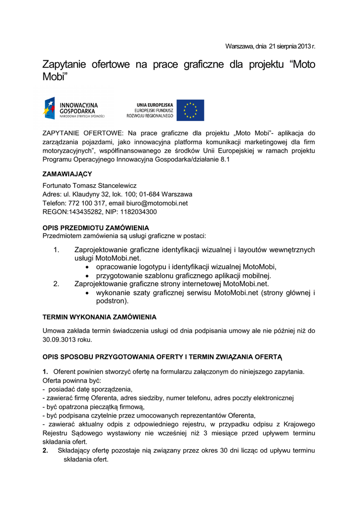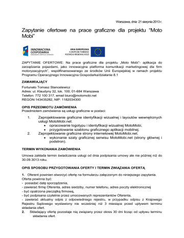 Warszawa, dnia 21 sierpnia 2013 r. Zapytanie ofertowe na prace graficzne dla projektu “Moto Mobi” ZAPYTANIE OFERTOWE: Na prace graficzne dla projektu „Moto Mobi”- aplikacja do zarządzania pojazdami, jako innowacyjna platforma komunikacji marketingowej dla firm motoryzacyjnych”, współfinansowanego ze środków Unii Europejskiej w ramach projektu Programu Operacyjnego Innowacyjna Gospodarka/działanie 8.1 ZAMAWIAJĄCY Fortunato Tomasz Stancelewicz Adres: ul. Klaudyny 32, lok. 100; 01-684 Warszawa Telefon: 772 100 317, email [email protected] REGON:143435282, NIP: 1182034300 OPIS PRZEDMIOTU ZAMÓWIENIA Przedmiotem zamówienia są usługi graficzne w postaci: 1. 2. Zaprojektowanie graficzne identyfikacji wizualnej i layoutów wewnętrznych usługi MotoMobi.net. opracowanie logotypu i identyfikacji wizualnej MotoMobi, przygotowanie szablonu graficznego aplikacji mobilnej. Zaprojektowanie graficzne strony internetowej MotoMobi.net. wykonanie szaty graficznej serwisu MotoMobi.net (strony głównej i podstron). TERMIN WYKONANIA ZAMÓWIENIA Umowa zakłada termin świadczenia usługi od dnia podpisania umowy ale nie później niż do 30.09.3013 roku. OPIS SPOSOBU PRZYGOTOWANIA OFERTY I TERMIN ZWIĄZANIA OFERTĄ 1. Oferent powinien stworzyć ofertę na formularzu załączonym do niniejszego zapytania. Oferta powinna być: - posiadać datę sporządzenia, - zawierać firmę Oferenta, adres siedziby, numer telefonu, adres poczty elektronicznej - być opatrzona pieczątką firmową, - być podpisana czytelnie przez umocowanych reprezentantów Oferenta, - zawierać aktualny odpis z odpowiedniego rejestru, w przypadku odpisu z Krajowego Rejestru Sądowego wystawiony nie wcześniej niż 3 miesiące przed upływem terminu składania ofert. 2. Składający ofertę pozostaje nią związany przez okres 30 dni licząc od upływu terminu składania ofert. MIEJSCE ORAZ TERMIN SKŁADANIA OFERT 1. 2. 3. 4. Oferta powinna być przesłana za pośrednictwem: poczty elektronicznej na adres: [email protected], do dnia 04.09.2013 r., lub dostarczona osobiście lub przesłana pocztą na adres Fortunato Tomasz Stancelewicz ul. Klaudyny 12 lok. 01-684 Warszawa. Ocena ofert zostanie dokonana w dniu 05.09.2013 r., a wyniki i wybór najkorzystniejszej oferty zostanie ogłoszony nie później niż do godziny 12:00 tego dnia na stronie internetowej pod adresem www.motomobi.net Oferty złożone po terminie nie będą rozpatrywane. Zapytanie ofertowe zamieszczono na stronie: www.motomobi.net OCENA OFERT Zamawiający dokona oceny ważnych ofert na podstawie następujących kryteriów: Cena 100% INFORMACJE DOTYCZĄCE WYBORU NAJKORZYSTNIEJSZEJ OFERTY O wyborze najkorzystniejszej oferty Zamawiający zawiadomi oferentów za pośrednictwem strony internetowej znajdującej się pod adresem www.motomobi.net OSOBA DO KONTAKTU Z OFERENTAMI Dodatkowych informacji udziela Sylwia Zagórska pod numerem telefonu 0 504 895 887 oraz adresem email: [email protected] INFORMACJE DODATKOWE 1. Postępowanie ofertowe nie podlega przepisom ustawy Prawo zamówień publicznych z dnia 29 stycznia 2004 r. (Dz.U. z dnia 9 lutego 2004 r., Nr 19, poz. 177 z późn zm.). 2. Niniejsze Zapytanie nie stanowi oferty w rozumieniu przepisów Kodeksu cywilnego oraz innych właściwych przepisów prawnych. ZAŁĄCZNIKI Wzór formularza ofertowego. FORMULARZ OFERTY – WZÓR Fortunato Tomasz Stancelewicz ul. Klaudyny 32, lok.100 01-684 Warszawa email: [email protected] Dane oferenta: ……………………………………. ……………………………………. ……………………………………. …………………………………… FORMULARZ OFERTY Na usługi graficzne dla projektu „Moto Mobi” - aplikacja do zarządzania pojazdami, jako innowacyjna platforma komunikacji marketingowej dla firm motoryzacyjnych”, współfinansowanego ze środków Unii Europejskiej w ramach projektu Programu Operacyjnego Innowacyjna Gospodarka/działanie 8.1 Składam ofertę na usługi graficzne – w szczególności zaprojektowanie graficzne identyfikacji wizualnej i layoutów wewnętrznych usługi MotoMobi.net oraz zaprojektowanie graficzne strony internetowej MotoMobi.net w ramach ww. projektu, zgodnie z wymaganiami i kryteriami określonymi w zapytaniu ofertowym z dnia 21 sierpnia 2013 r. Oferuję świadczenie usług eksperckich i analizy przygotowawczych – w szczególności doradztwo programistyczne w zakresie opracowania specyfikacji funkcjonalno – technicznej projektu oraz badania marketingowe w ramach ww. projektu według następującej stawki: wynagrodzenie – ryczałtowe netto „zaprojektowanie graficzne identyfikacji wizualnej i layoutów wewnętrznych usługi MotoMobi.net” […] (słownie:….). wynagrodzenie – ryczałtowe netto „zaprojektowanie graficzne strony internetowej MotoMobi.net” […] (słownie:….). Zapewniam wykonanie zamówienia zgodnie z Zapytaniem Ofertowym. W przypadku wyboru niniejszej oferty, zobowiązuję się do zawarcia umowy w miejscu i terminie wskazanym przez Zamawiającego. Oświadczam, że zapoznałem/am się z Zapytaniem Ofertowym, przyjmuję warunki w nim zawarte i nie wnoszę do niego zastrzeżeń jak również oświadczam że jestem związany złożoną ofertą, przez czas wskazany w Zapytaniu Ofertowym. Data:………………………………………… ………………………………………… pieczęć i podpis oferenta
