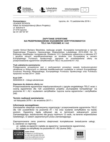 Projekt realizowany ze środków Europejskiego Funduszu Społecznego Zamawiający: LEADER SCHOOL Adres do korespondencji (Biuro Projektu): ul. Szkolna 6 21-010 Łęczna tel: 81 307 87 87 Łęczna, dn. 13 października 2016 r. ZAPYTANIE OFERTOWE NA PRZEPROWADZENIE EGZAMINÓW CERTYFIKOWANYCH TELC NA POZIOMIE A1 I A2 Leader School Barbara Sławińska, realizując projekt Europejskie kompetencje w ramach Regionalnego Programu Operacyjnego Województwa Lubelskiego 2014-2020 Oś 12, Edukacja, kwalifikacje i kompetencje, Działanie 12.3. Kształcenie ustawiczne w zakresie ICT i języków obcych, współfinansowanego ze środków Unii Europejskiej w ramach Europejskiego Funduszu Społecznego, zaprasza do przedstawienia oferty na przeprowadzenie egzaminów certyfikowanych TELC na poziomie A1 i A2. Tryb udzielenia zamówienia: Postępowanie prowadzone jest z zachowaniem procedury zasady konkurencyjności określonej w Wytycznych w zakresie kwalifikowalności wydatków w ramach Europejskiego Funduszu Rozwoju Regionalnego, Europejskiego Funduszu Społecznego oraz Funduszu Spójności na lata 2014 - 2020 Kod CVP: 80500000-9 – Usługi szkoleniowe Zaprasza do złożenia oferty na: Przeprowadzenie egzaminów międzynarodowych z języka angielskiego TELC wraz z oceną egzaminów dla 120 uczestników projektu „Europejskie kompetencje” na poziomie A1 i A2 i wydaniem certyfikatów. Łączna suma egzaminów i certyfikatów 240. Termin realizacji zamówienia: od listopada 2016 r. do września 2017 r. Informacje szczegółowe: Zamówienie obejmuje sukcesywną organizację i przeprowadzanie egzaminów TELC dla 120 uczestników na poziomie A1 i A2 oraz wydanie certyfikatów na każdy poziom. Egzaminy będą odbywać się w terminach wskazanych przez Zamawiającego, każdorazowo dla grupy minimum 12 osób, na terenie województwa lubelskiego, w salach zapewnionych przez Zamawiającego. Zaproponowana cena powinna obejmować kompleksowe świadczenie usługi, tj. zawierać co najmniej: a) opłatę za egzamin (opłata za egzaminy i sprawdzenie egzaminów), b) opłatę za certyfikaty na poziomie A1 i A2 (suma 240) Projekt realizowany ze środków Europejskiego Funduszu Społecznego c) koszty obsługi sesji przez akredytowanych egzaminatorów (wynagrodzenie), d) zapewnienie profesjonalnych egzaminatorów z ważną licencją na przeprowadzenie egzaminu, e) organizację egzaminu dla średnio 12-osobowych grup w terminach i lokalizacjach określonych przez Zamawiającego (koszt wynajmu sal ponosi Zleceniodawca), f) koszty dostarczenia kurierem certyfikatów do siedziby Zamawiającego niezwłocznie po ich otrzymaniu przez Zleceniobiorcę. Ofertę mogą składać wyłącznie podmioty posiadające aktualną licencję na prowadzenie egzaminów TELC i posiadające uprawnienia do przeprowadzania egzaminu TELC. Dodatkowo wymaga się złożenia dokumentu uprawniającego do przeprowadzania egzaminu (aktualna licencja). Dodatkowe informacje: 1. Oferty należy składać na formularzu ofertowym załączonym do niniejszego zapytania. 2. W przypadku stwierdzenia braków formalnych w złożonych ofertach Zamawiający zastrzega sobie prawo do wezwania Oferentów do uzupełnienia złożonych ofert. 3. Zamawiający zastrzega sobie prawo do odrzucenia ofert nie zawierających wszystkich wymaganych dokumentów i informacji lub w przypadku nieuzupełnienia ofert zawierających braki formalne na wezwanie Zamawiającego we wskazanym przez niego terminie. 4. Zamawiający zastrzega sobie prawo do zwrócenia się z prośbą do Oferenta o złożenie wyjaśnienia w sprawie oferty, po upływie terminu składania ofert. 5. Zamawiający zastrzega sobie prawo do zmiany liczby osób objętych egzaminem, przy czym łączna liczba egzaminowanych osób w ramach zamówienia będzie nie mniejsza niż 12 osób. Zmiana liczby osób będzie skutkowała zmianą wartości zamówienia. 6. Zamawiający zastrzega sobie prawo do odrzucenia egzaminatora wskazanego przez wybranego Oferenta w przypadku gdy dany egzaminator przeprowadzał zajęcia dla uczestników egzaminu. 7. Termin egzaminu wyznacza Zamawiający. Kryteria wyboru najkorzystniejszej oferty: 100 % - cena Termin składania ofert: 27.10.2016 r. (do końca dnia; decyduje data stempla pocztowego lub data przesłania oferty na adres e-mail wskazany poniżej). Oferty prosimy przesyłać na adres e-mail: [email protected], przesłać pocztą/kurierem lub dostarczyć bezpośrednio do biura projektu w Łęcznej (adres: Leader School Barbara Sławińska, ul. Szkolna 6 21010 Łęczna). W razie potrzeby dodatkowych informacji pod numerem telefonu tel. 81 307 87 87. Załączniki do Zapytania ofertowego: Projekt realizowany ze środków Europejskiego Funduszu Społecznego 1. Formularz ofertowy